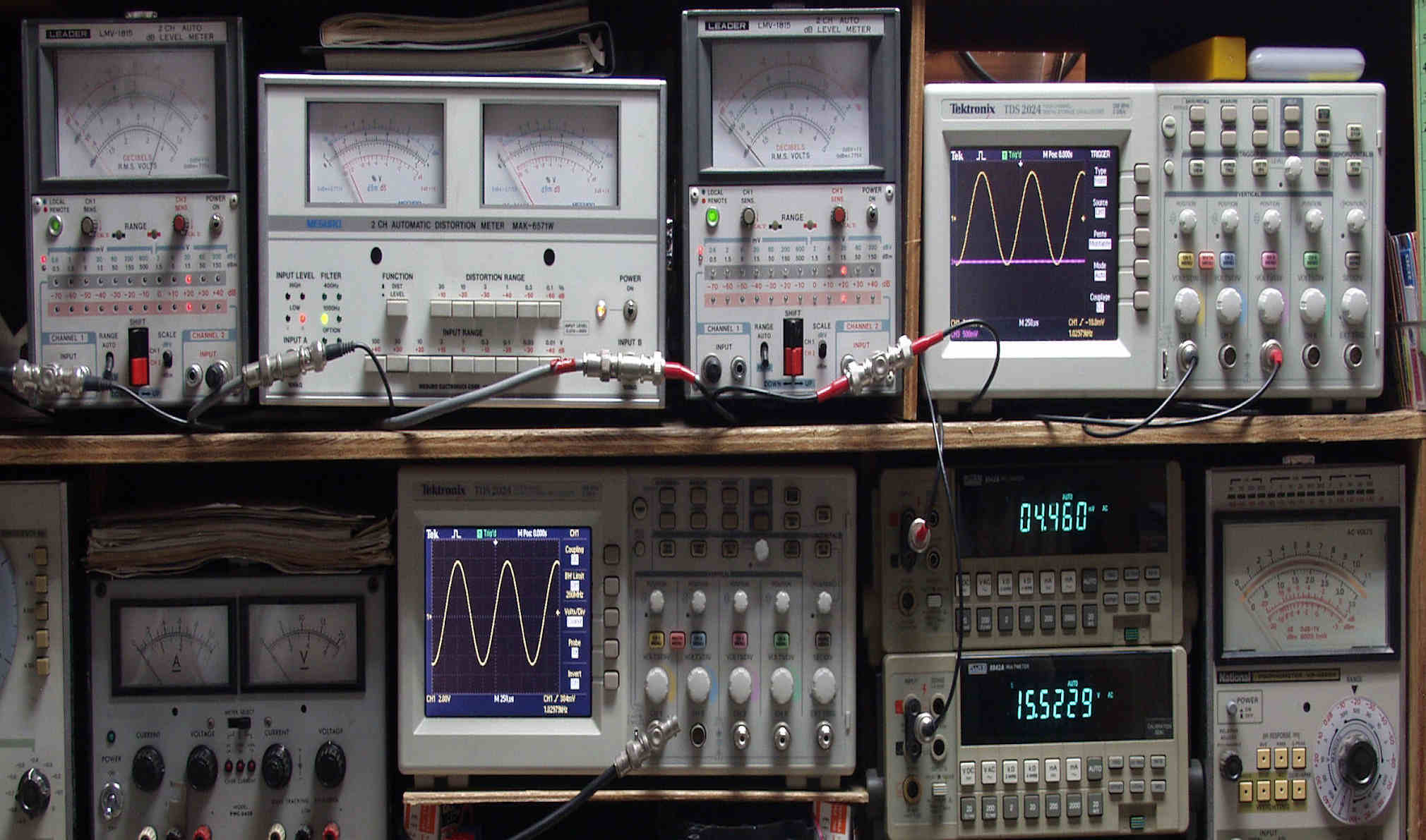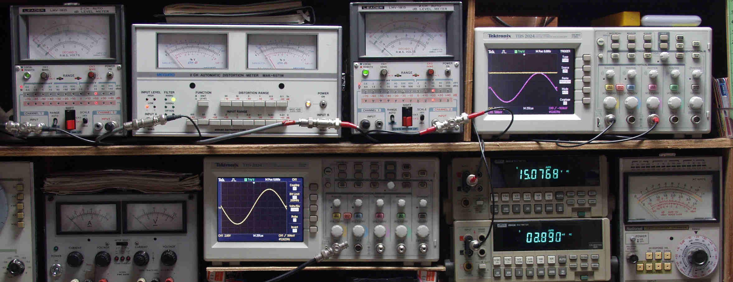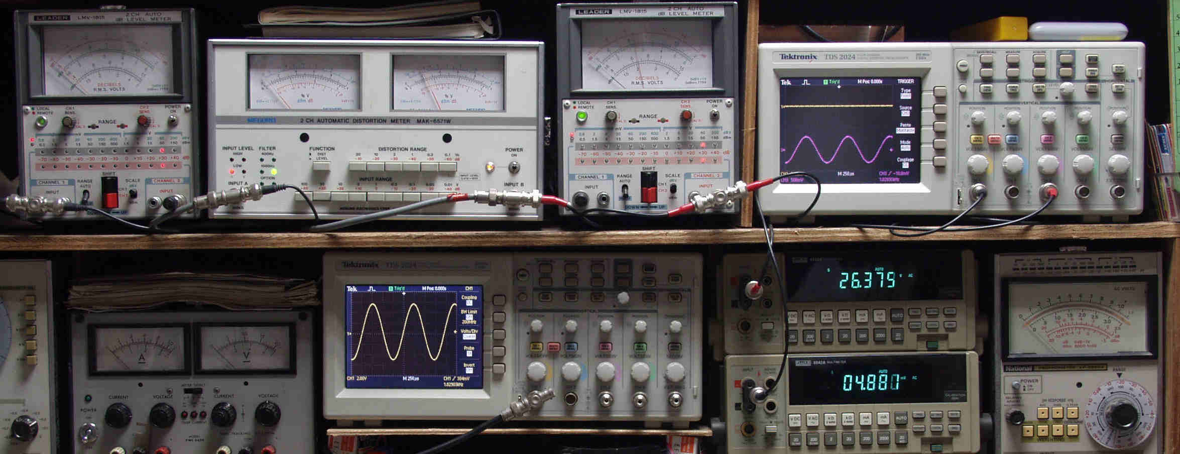 | H. バラック修理での測定 H1. 出力・歪み率測定。 <見方>。 下段左端 オーディオ発振器より400HZ・1KHZの信号を出し(歪み率=約0.003%)これをAMPに入力し、出力を測定。 下段中央 オシロ=入力波形(オーディオ発振器のTTLレベル表示)。 上段左端 交流電圧計=L側出力電圧測定、黒針のみ使用。 上段中左 歪み率計=出力の歪み率測定 左メータ=L出力、右メータ=R出力。 上段中右 交流電圧計=R側出力電圧測定、赤針のみ使用。 上段右端 オシロ=出力波形表示、 赤表示=R出力、黄色表示=L出力。(実際にはRL交流電圧計の出力「Max1V」を観測)。 下段中右上 デジタル電圧計=R出力電圧測定。 下段中右下 デジタル電圧計=L出力電圧測定。 |