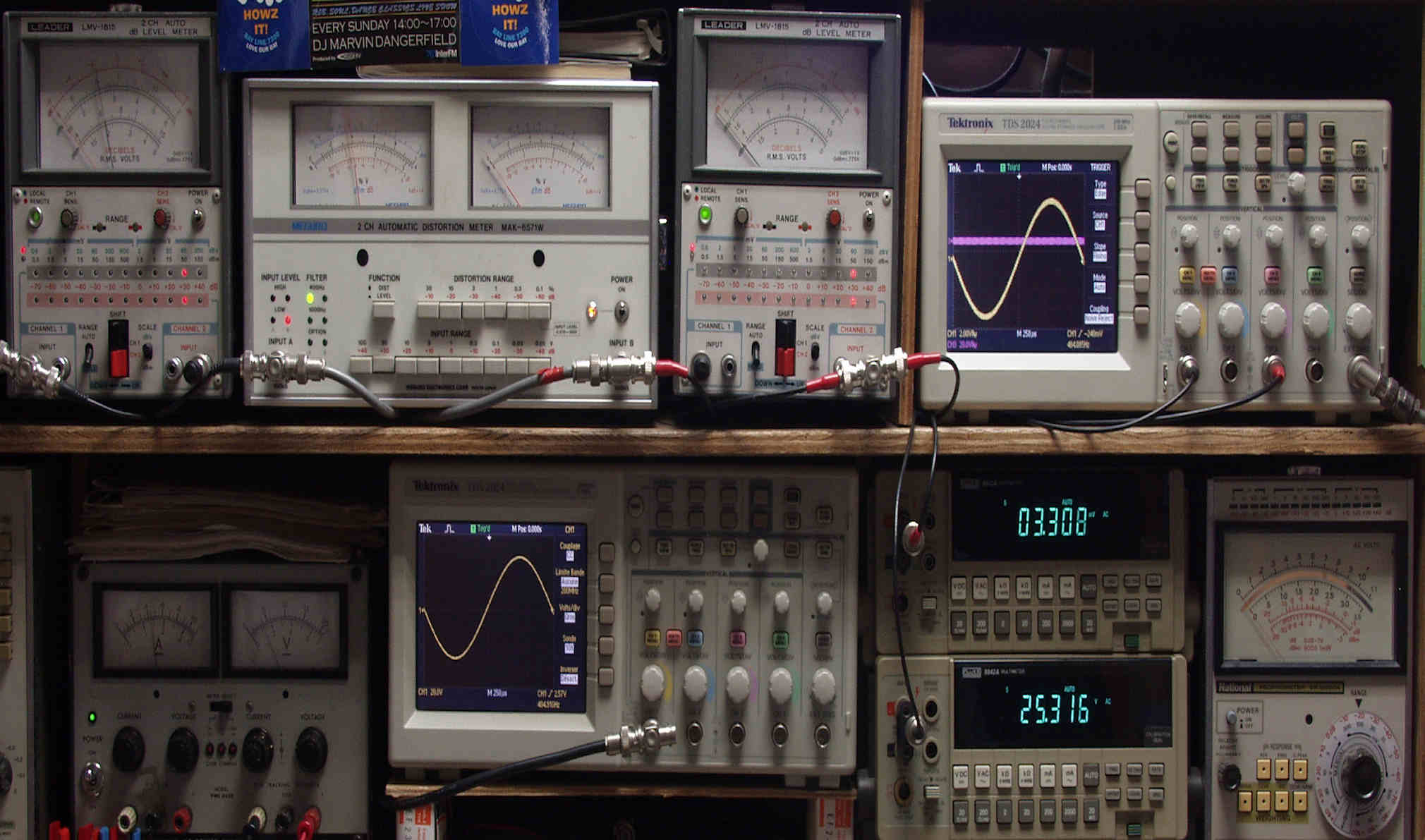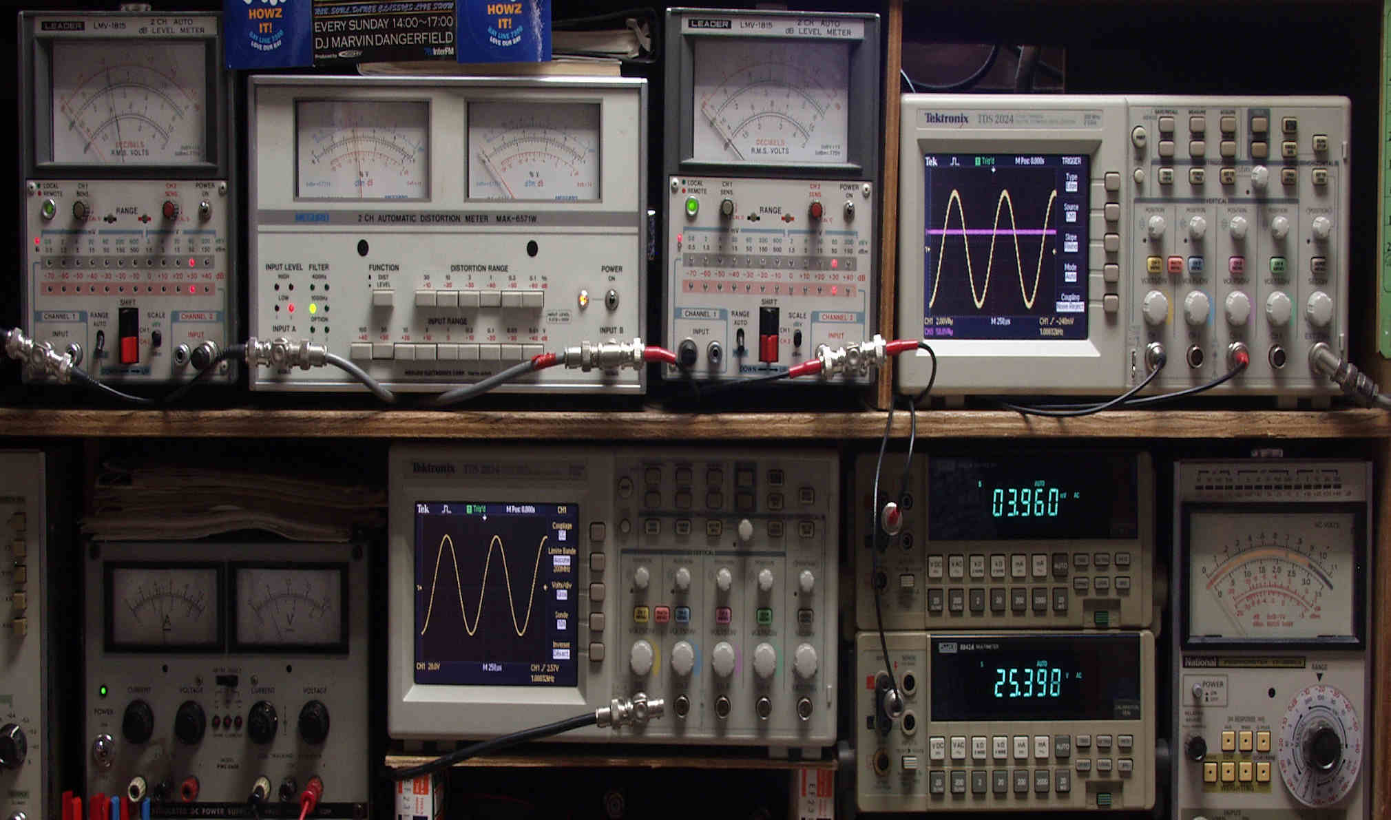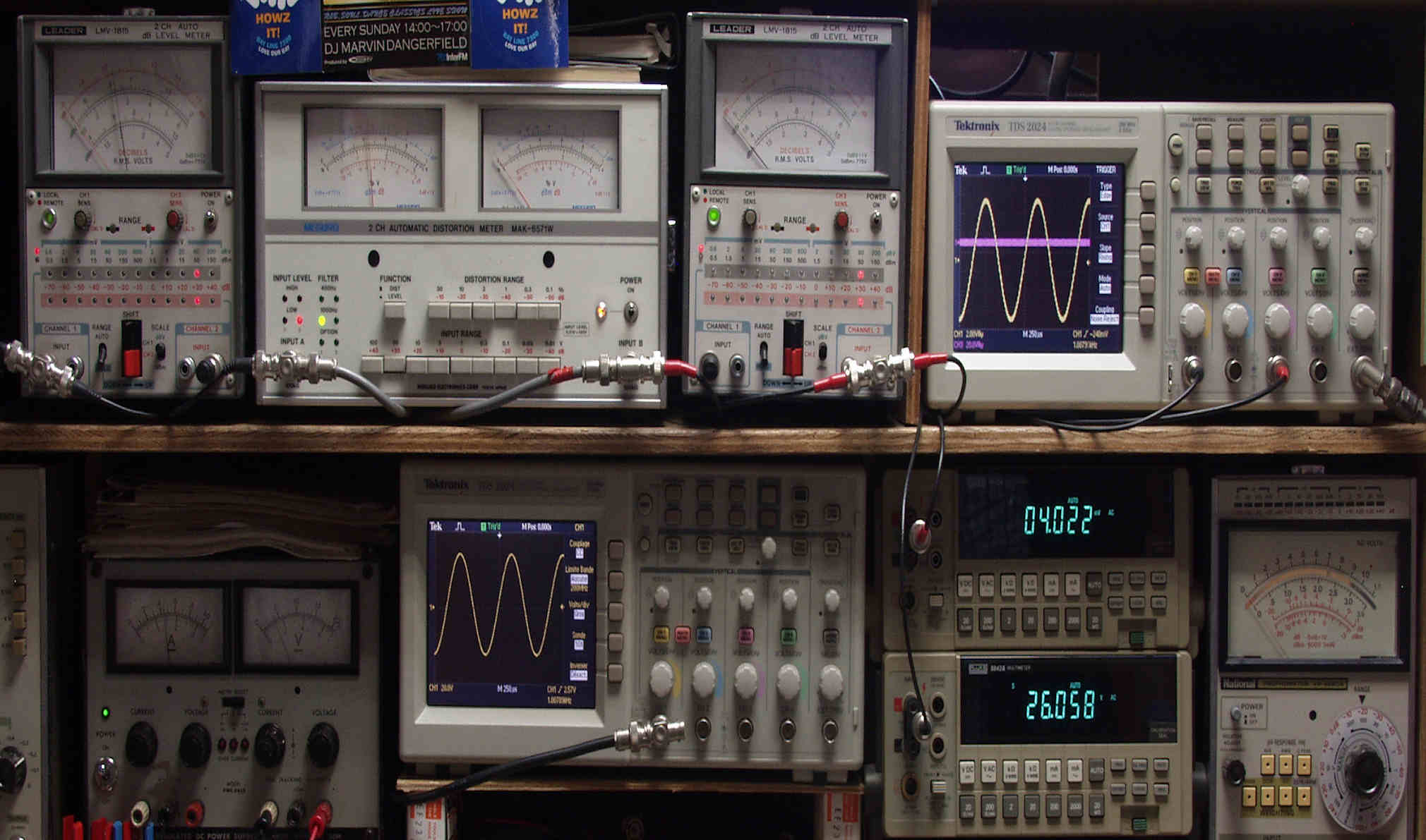 | H. バラック修理での測定 H1. 出力・歪み率測定。 <見方>。 下段左端 オーディオ発振器より400HZ・1KHZの信号を出し(歪み率=約0.003%)これをAMPに入力し、出力を測定。 下段中央 オシロ=入力波形(オーディオ発振器のTTLレベル表示)。 上段左端 交流電圧計=L側出力電圧測定、黒針のみ使用。 上段中左 歪み率計=出力の歪み率測定 左メータ=L出力、右メータ=R出力。 上段中右 交流電圧計=R側出力電圧測定、赤針のみ使用。 上段右端 オシロ=出力波形表示、 赤表示=R出力、黄色表示=L出力。(実際にはRL交流電圧計の出力「Max1V」を観測)。 下段中右上 デジタル電圧計=R出力電圧測定。 下段中右下 デジタル電圧計=L出力電圧測定。 |