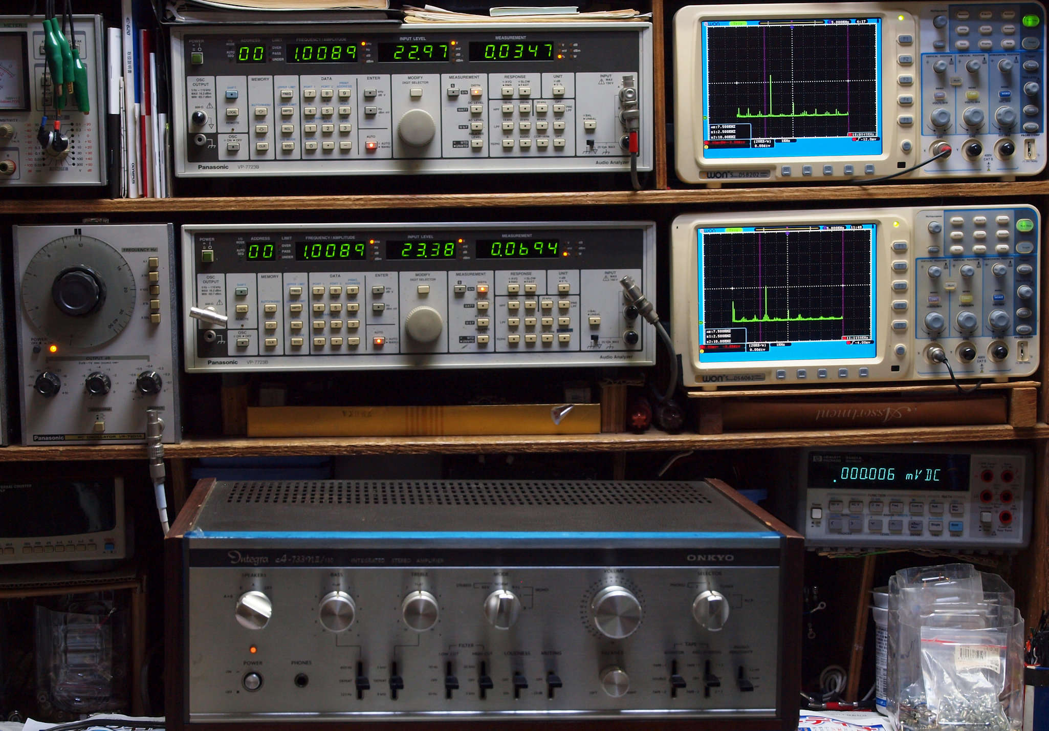 | E. 調整・測定。 E0. 出力・歪み率測定・調整。 「見方」。 上段中 右側SP出力を「Audio Analyzer Panasonic VP−7723B」により測定。 表示LED、 左端=メモリーNo、 中左=周波数測定、 中右=出力電圧測定、 右端=歪み率測定。 下段中 左側SP出力を「Audio Analyzer Panasonic VP−7723B」により測定。 表示LED、 左端=メモリーNo、 中左=周波数測定、 中右=出力電圧測定、 右端=歪み率測定。 下段左端 オーディオ発振器 VP−7201A より50Hz〜100kHzの信号を出し(歪み率=約0.003%)、ATT+分配器を通し、AMPに入力。 よって、ダイアル設定出力レベルより低くなります。測定機器の仕様や整備の様子はこちら、「VP−7723B」「VP−7201A」。 FFT画面の見方はこちら。 |