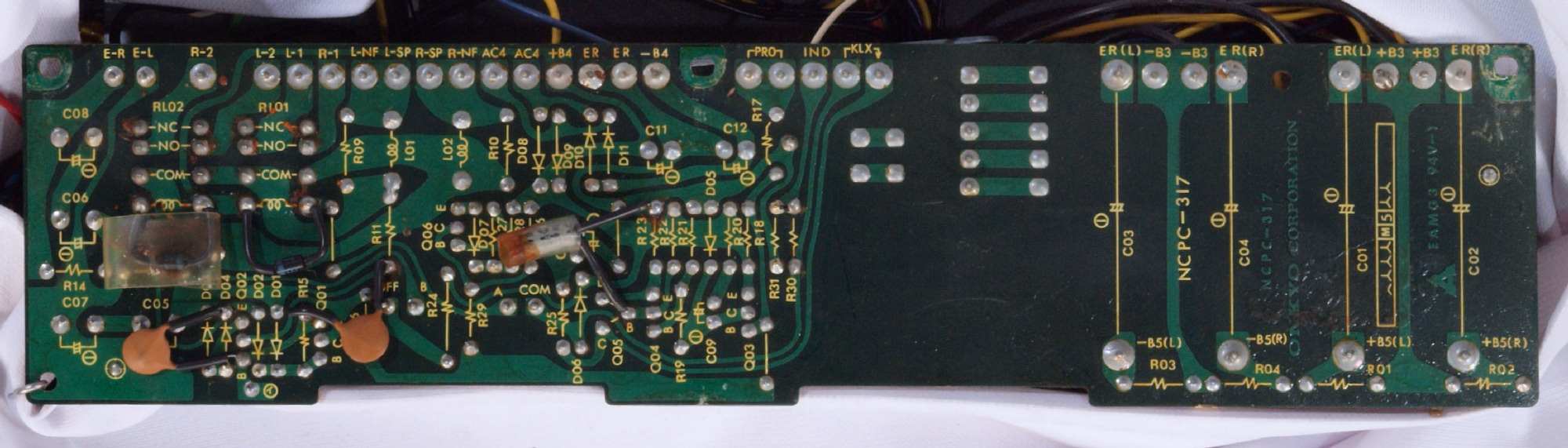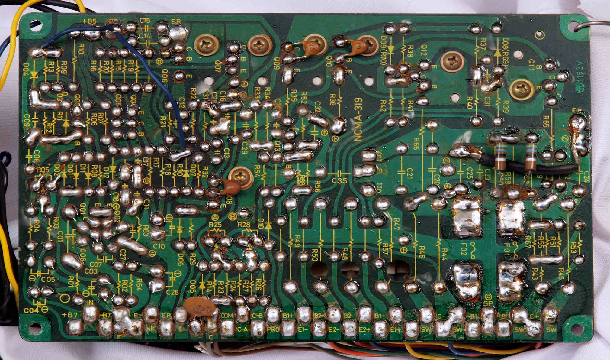 C54. 修理(半田補正)後 R側プリAMP・ピークモニター基板裏  半田を全部やり直す