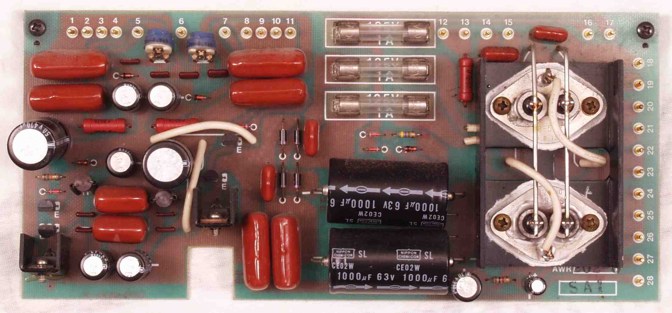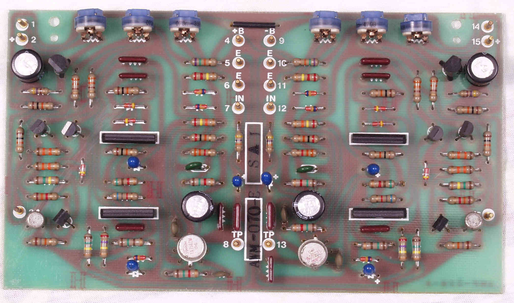 C1B. 修理後 R−AMP基板 バランス・バイアス調整用半固定VR2個、電解コンデンサー4個、フイルムコンデンサー1個交換