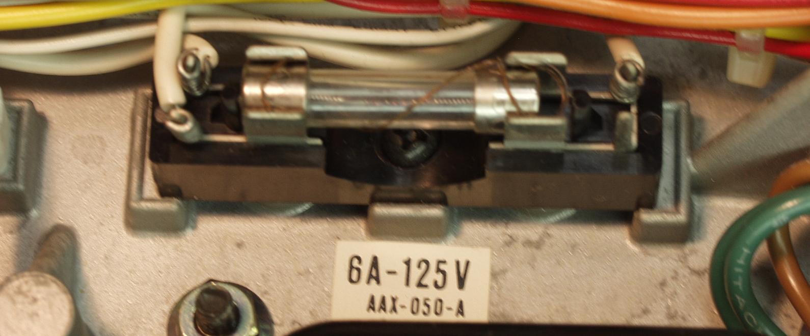 | A−2. 修理前 電源フューズが溶断したので、替わりに「ハリガネ」が巻き付けてある | ||||||||||||||||||||||||||||||||||