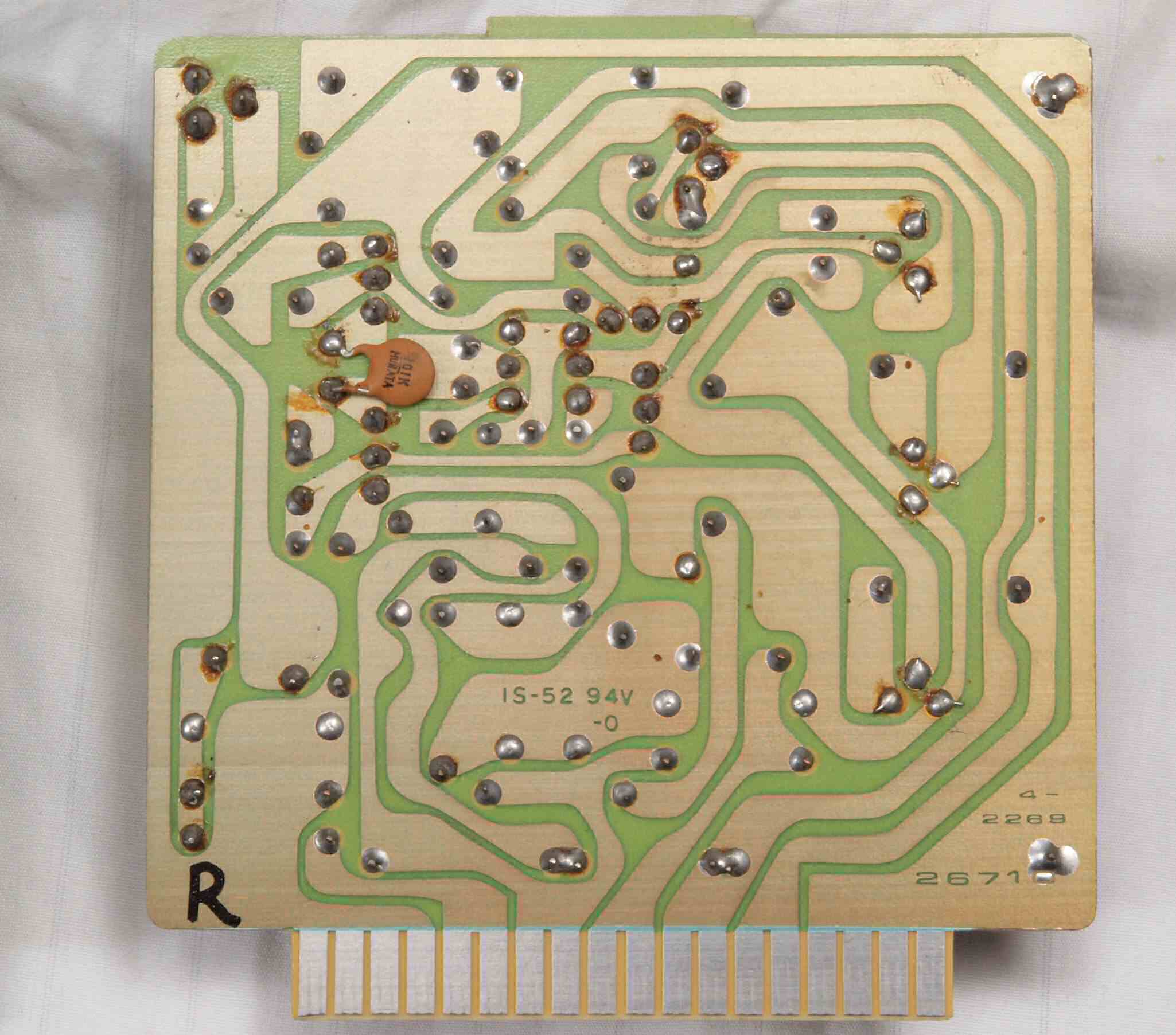 | C13. 修理前 R側EQアンプ基板裏。 金メッキカードエッジコネクターなのに基板はハンダメッキ? | ||||||||||||||||||||||||||||||||||||||||||||||||||||||||||||||||||||||||