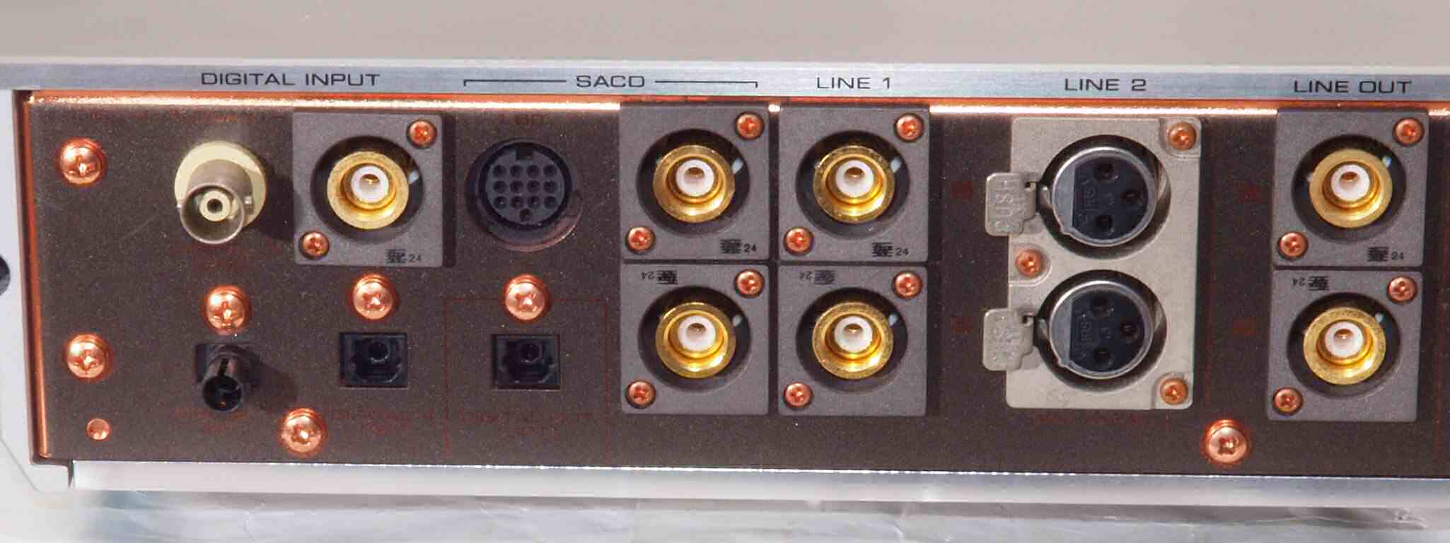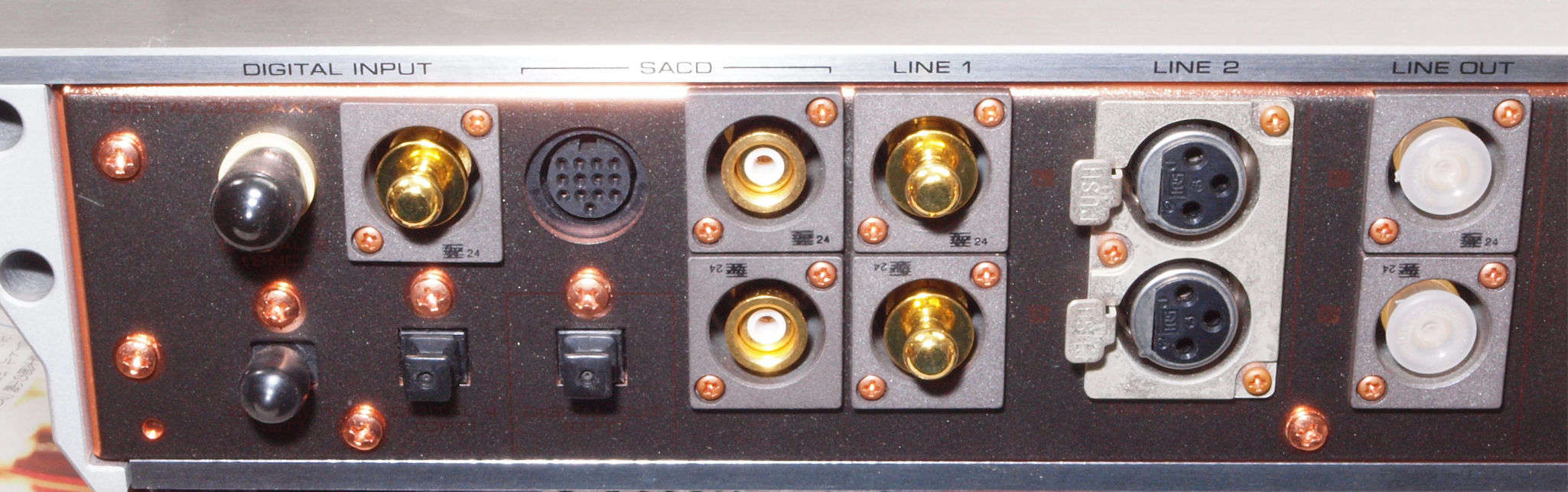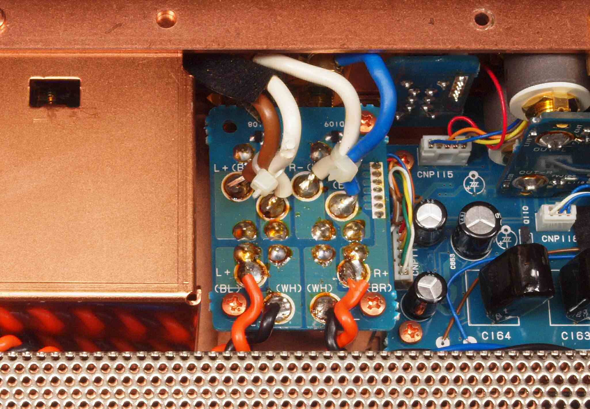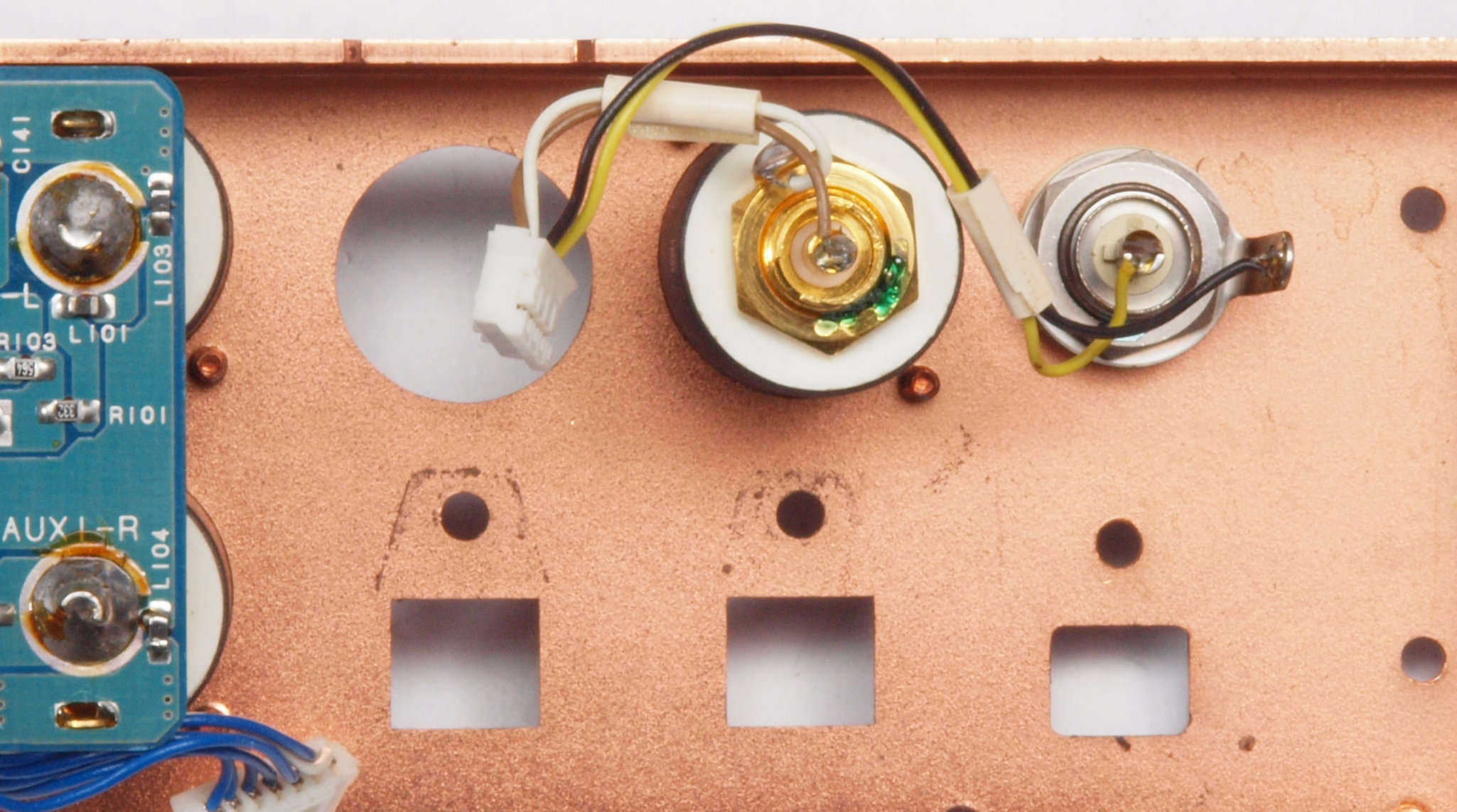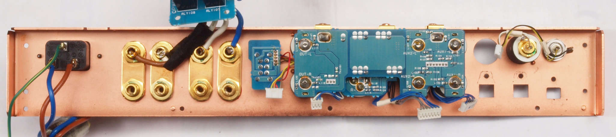 | CC3. 修理後 使用しない端子にはキャップを挿す。 ユーザーはマルチアンプの低域に使用予定。入力RCA端子はショウトピン、出力RCA端子は防塵キャップ。 |