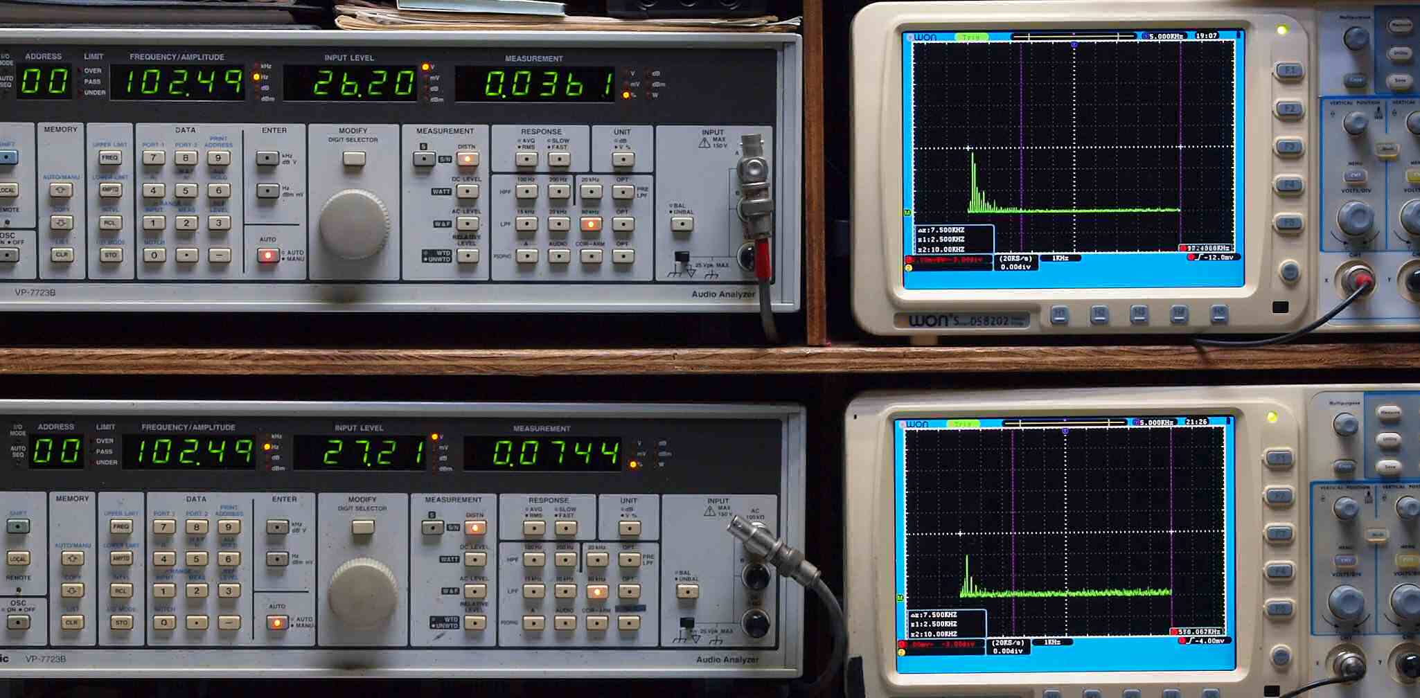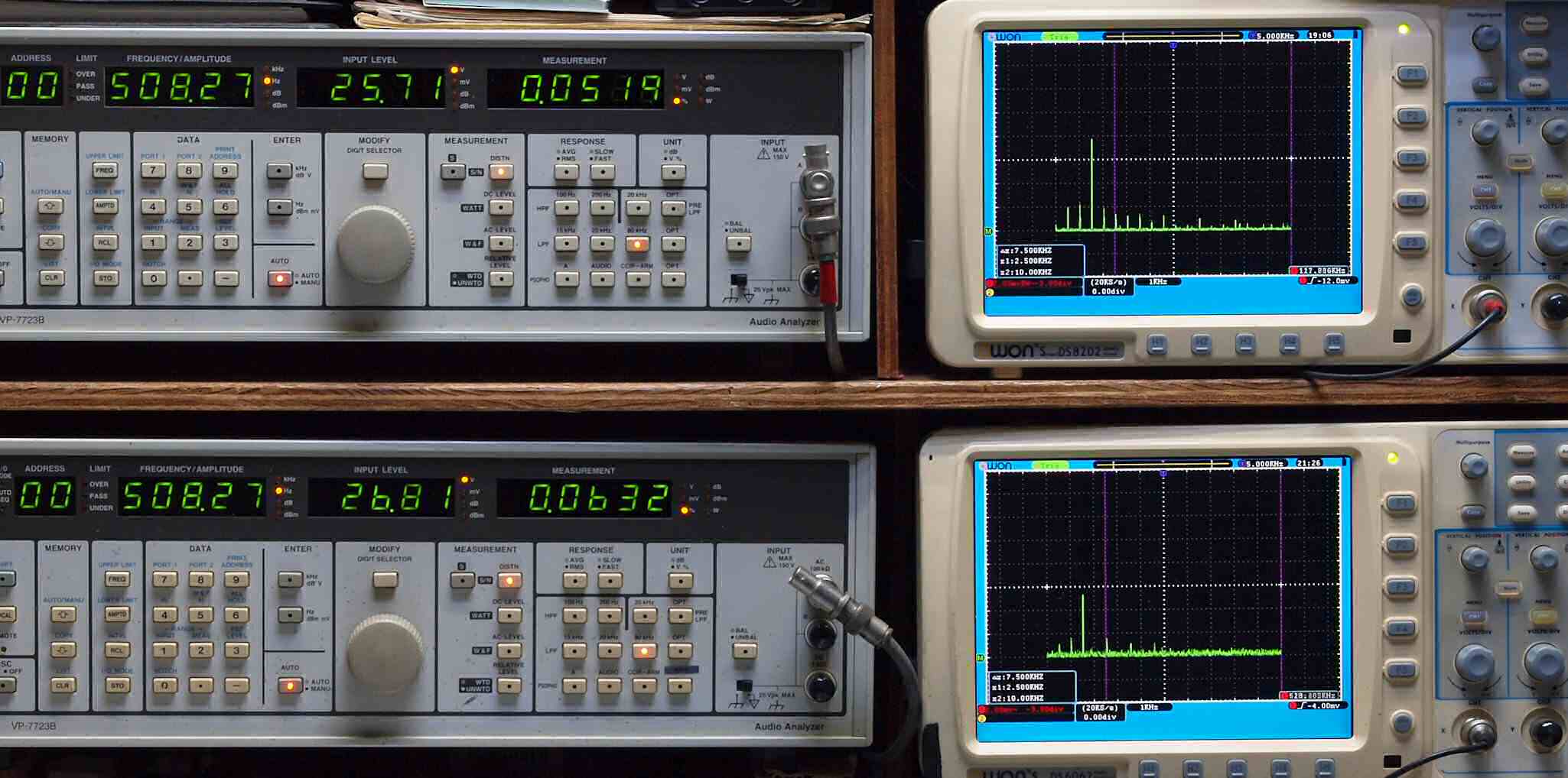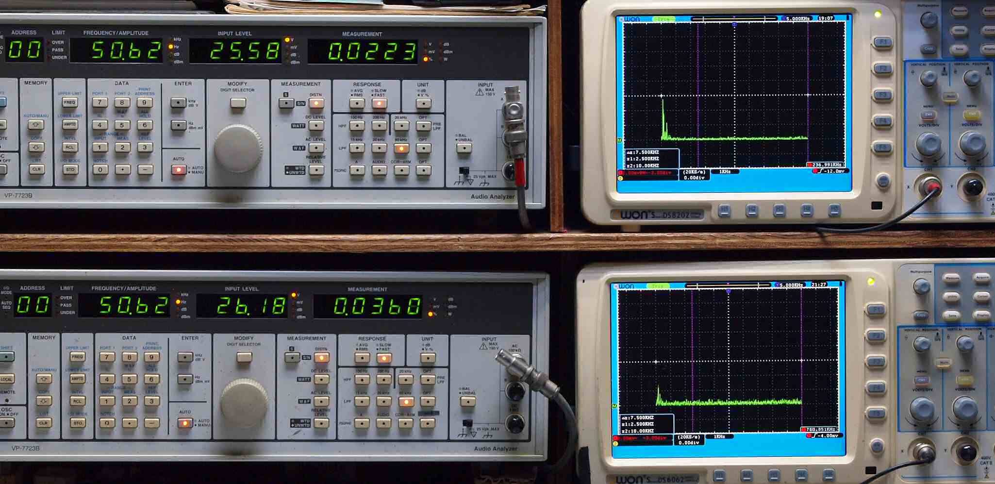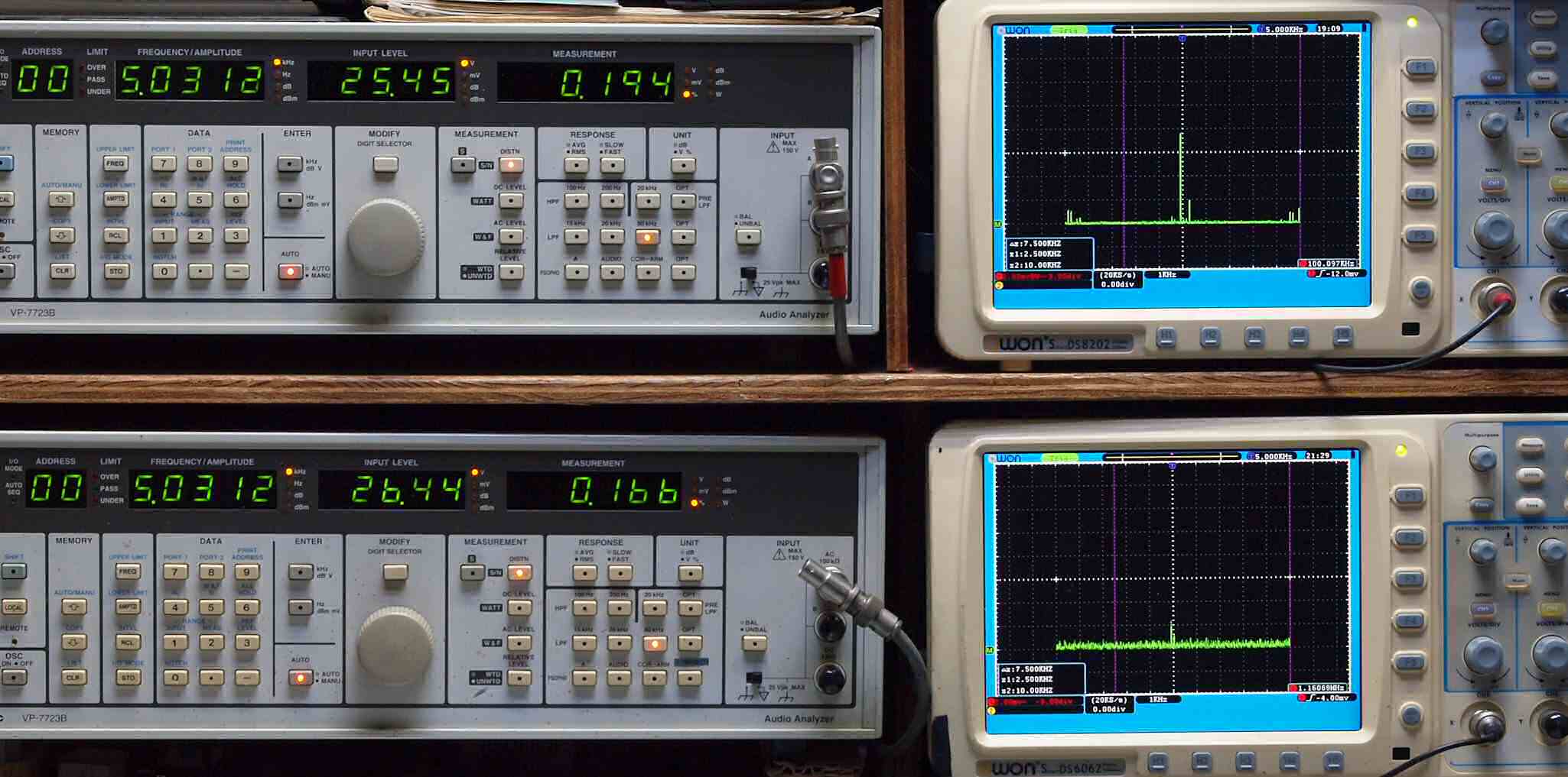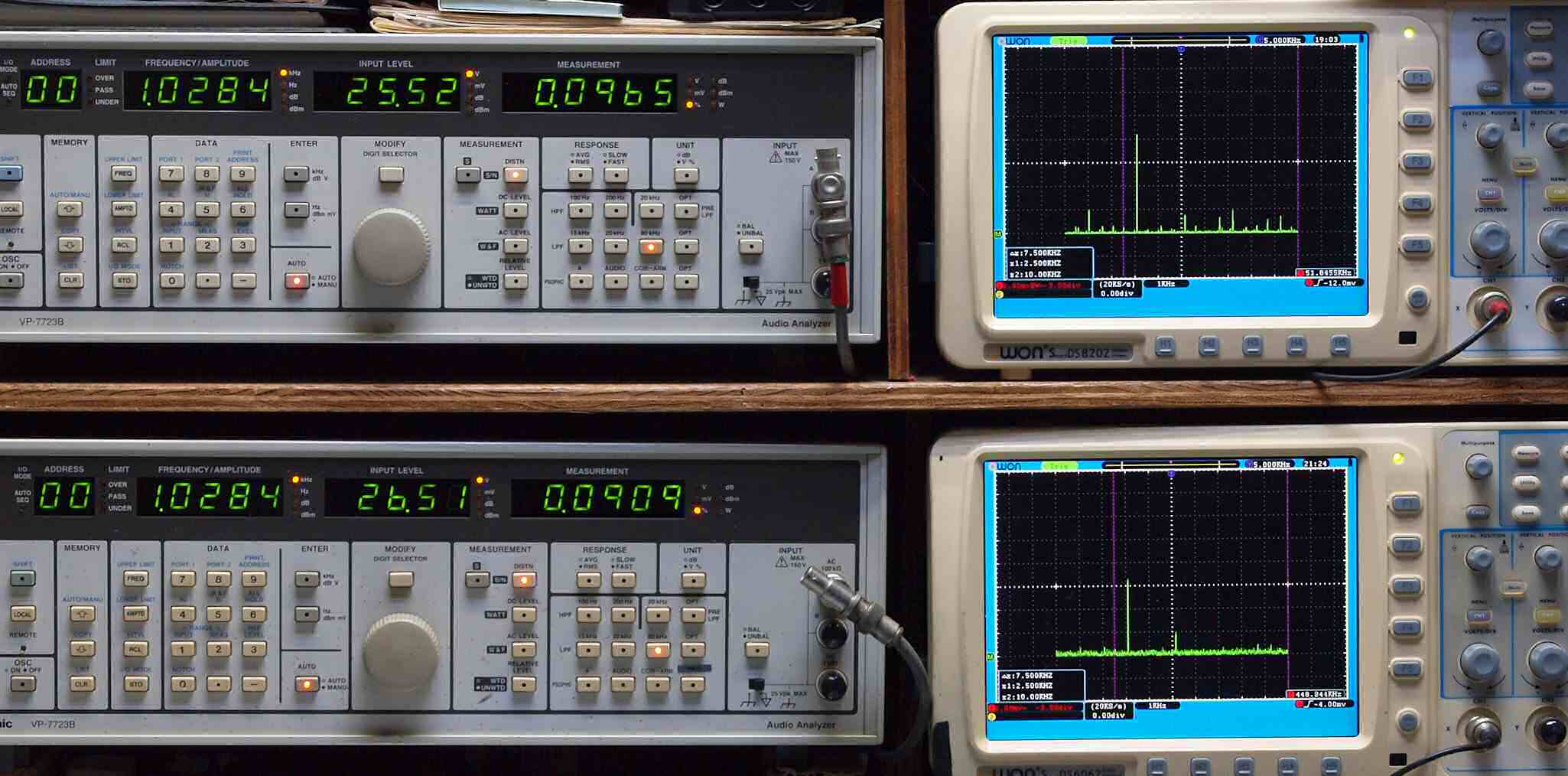 | E. 測定・調整。 画像をクリックすると、大きく(横幅2050ドット)表示されます。 E0. 出力・歪み率測定・調整 「見方」。 上段中 右側SP出力を「Audio Analyzer Panasonic VP−7723B」により測定。 表示LED、 左端=メモリーNo、 中左=周波数測定、 中右=出力電圧測定、 右端=歪み率測定。 上段右端 VP−7723Bの基本波除去出力を「owon SDS8202(200MHZ)」で「FFT分析」表示。 下段中 左側SP出力を「Audio Analyzer Panasonic VP−7723B」により測定。 表示LED、 左端=メモリーNo、 中左=周波数測定、 中右=出力電圧測定、 右端=歪み率測定。 下段右端 VP−7723Bの基本波除去出力を「owon SDS6062(200MHZ)」で「FFT分析」表示。 下段左端 オーディオ発振器 VP−7201A より50Hz〜100kHzの信号を出し(歪み率=約0.003%)、ATT+分配器を通し、AMPに入力。 よって、ダイアル設定出力レベルより低くなります。測定機器の仕様や整備の様子はこちら、「VP−7723B」「VP−7201A」。 FFT画面の見方はこちら。 入出力点検確認。 ライン1のアナログ入力、ライン2のバランス入力 、ライン出力点検確認済み。 デジタルNo1のST入力、デジタルNo2のBNCケーブル入力、デジタルNo3のRCAケーブル入力点検確認済み。 デジタルNo4の光ケーブル入力、デジタルNo5のSACD/1ビット入力(RCA入力)点検確認済み。 80kHz前後にクロック漏れが200mVPP(10mVrms)位あり、80kHzのローパスフイルターを挿入して測定。 仕様では、0.05%(1kHz、1W出力時) |