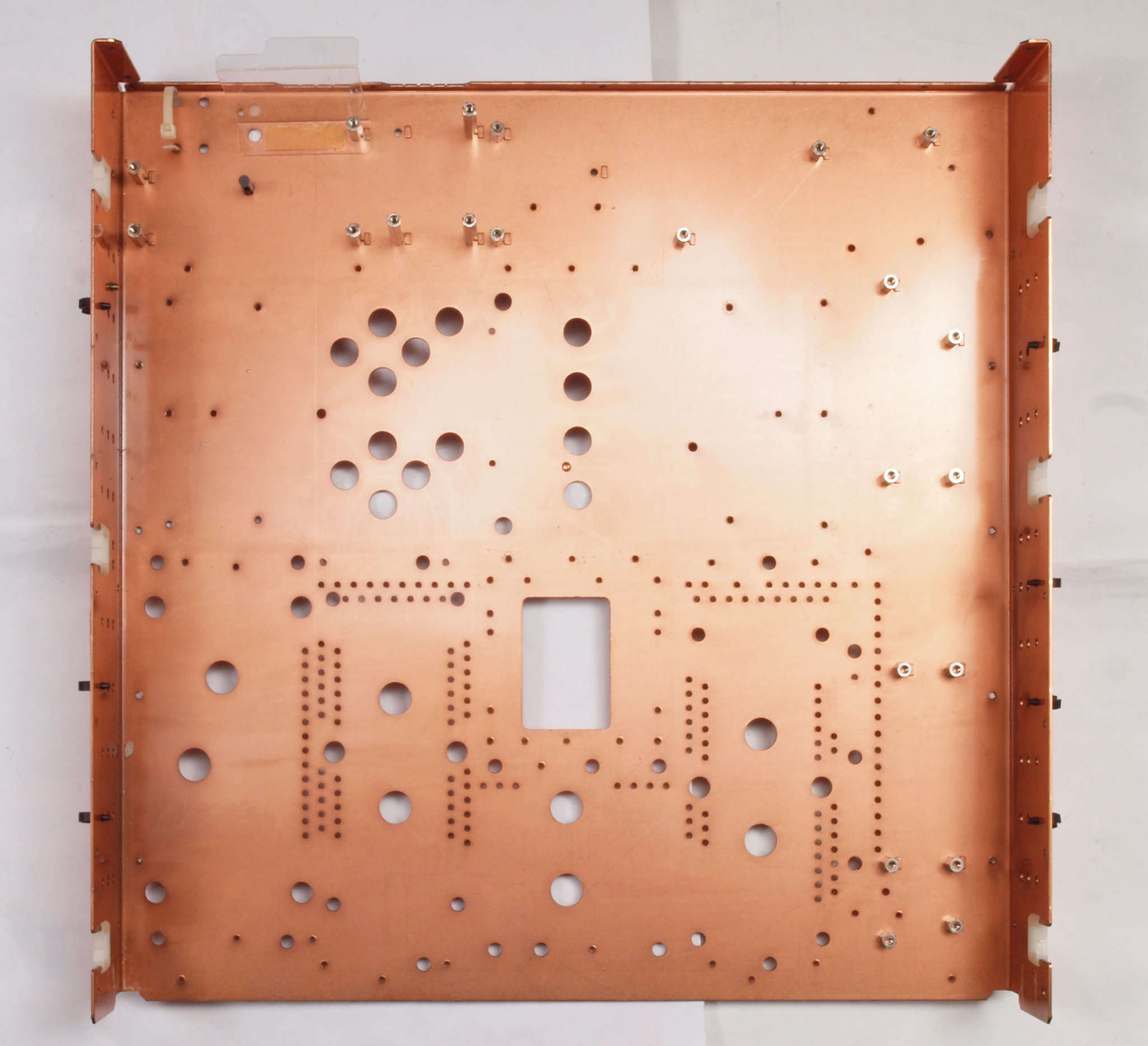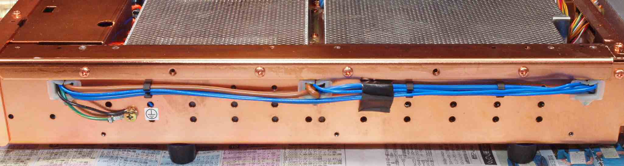 | C02. 修理中 前後パネル、基板を取り去ったシャーシ裏。 | ||||||||||||||||||||||||||||||||||