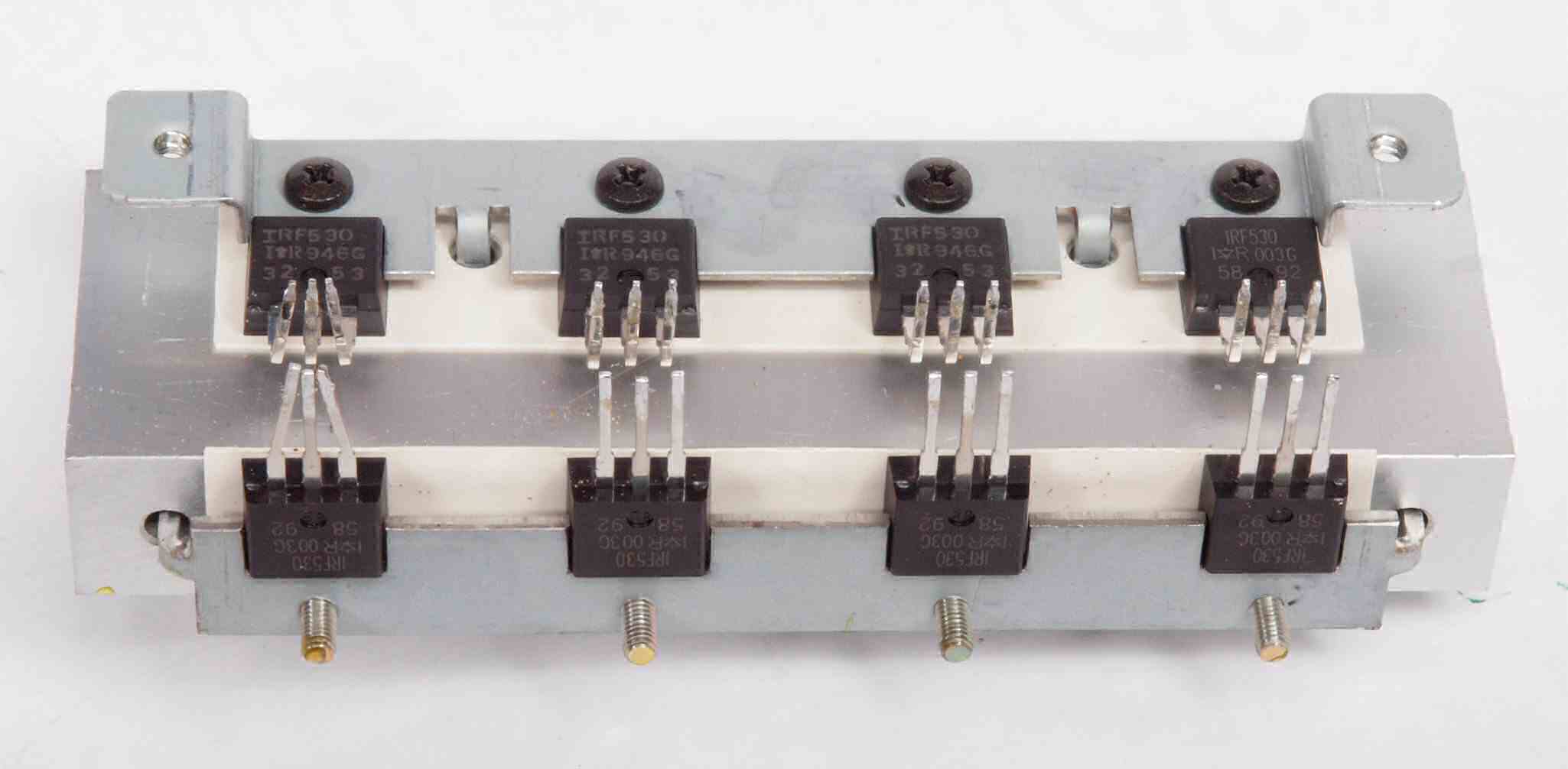 | A63. 点検中 さらにもう1レーン購入した終段FET(電界効果トランジスター)。上の小さい列はドライブIC。 中の黒いのは後発のFET(電界効果トランジスター)。 |