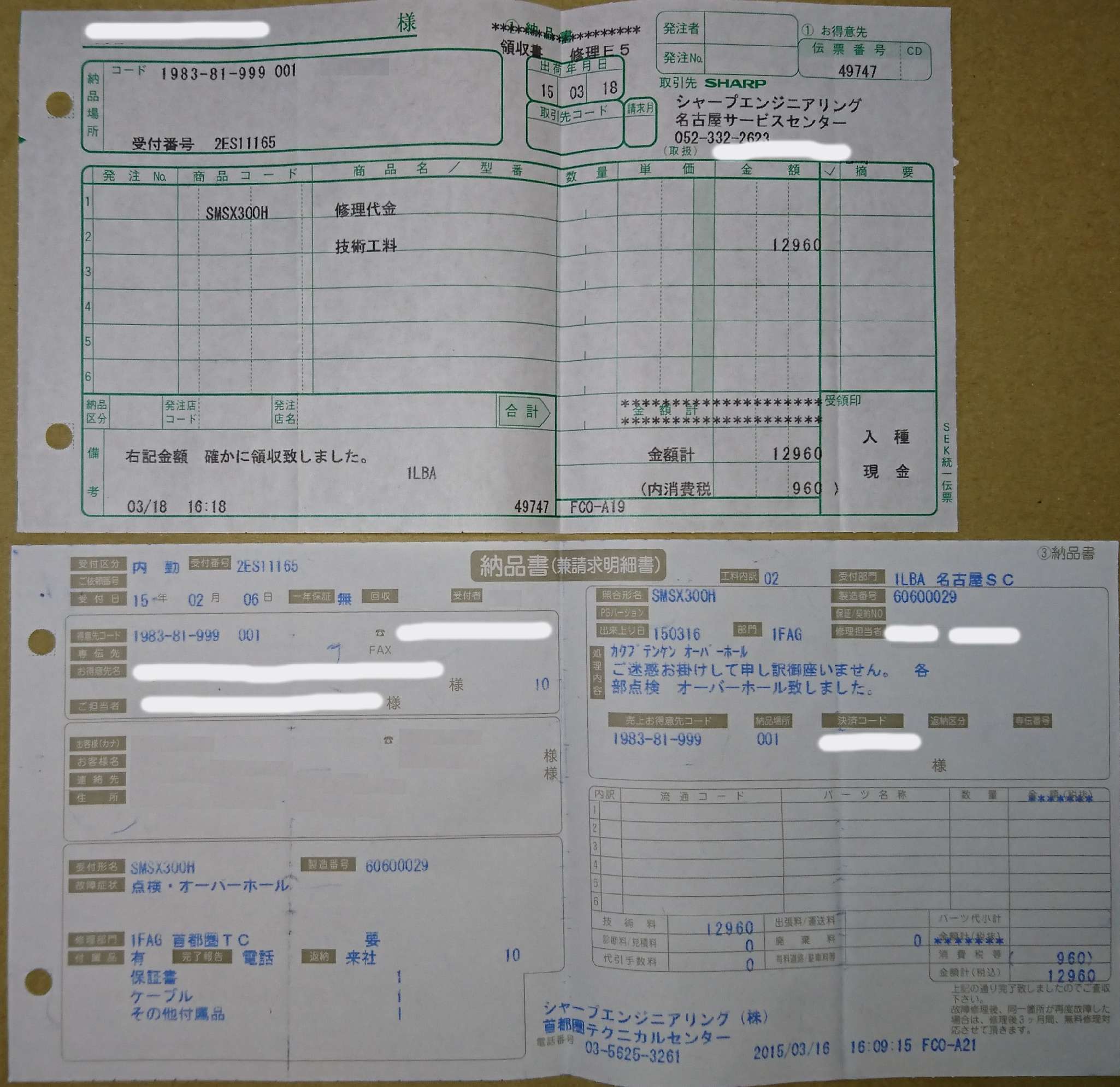 | A41. 点検中 状態確認、点検の目的でシャープに2015年2月オーバーホールを依頼の時の伝票。 | ||||||||||||||||||||||||||||