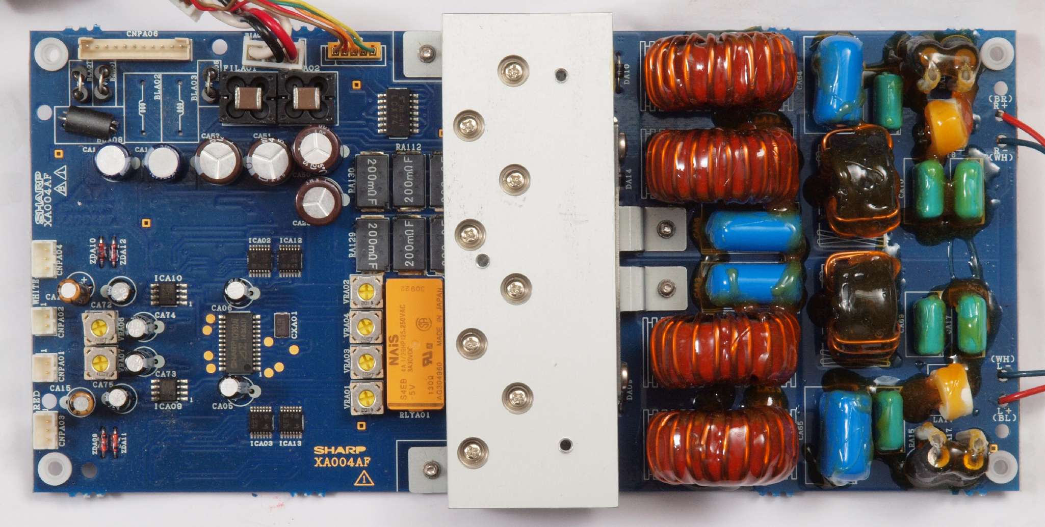 | C51. 修理中 SP接続リレー基板。 リレー定格電流5Aなので、5A×5A×4Ω=200W。4オーム出力の時はバイワイヤーが良い。 | ||||||||||||||||||||||||||||