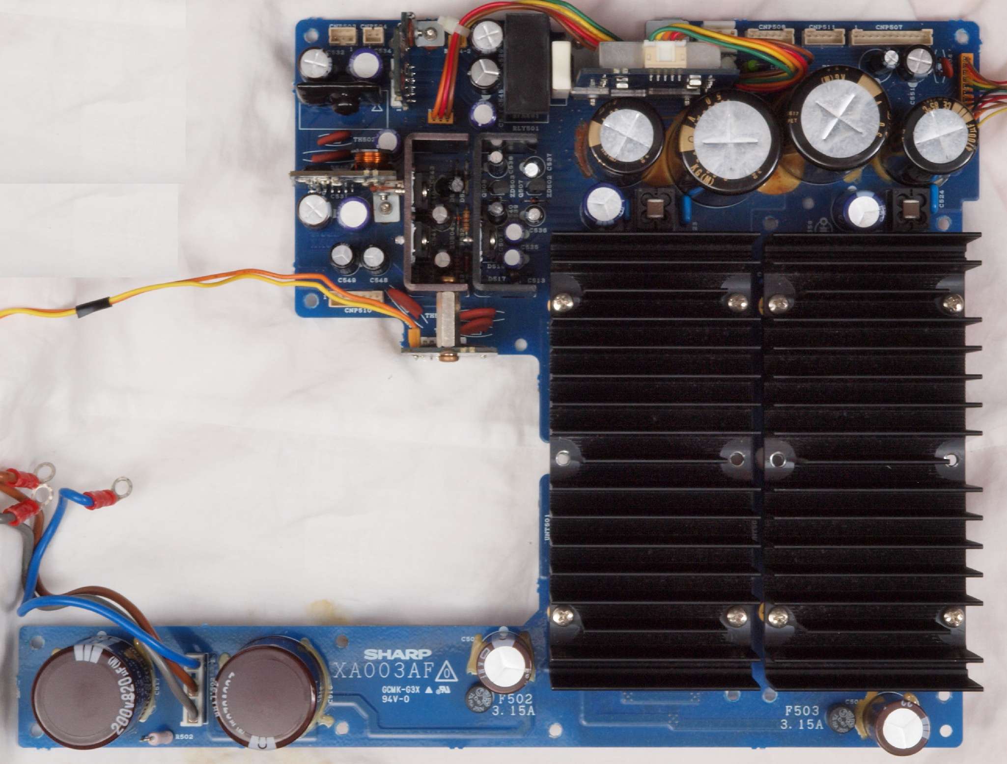 | C61. 修理中 電源フイルター基板。 電源ヒューズは15A、 100V×15A=1.5KVA。 | ||||||||||||||||||||||||||||