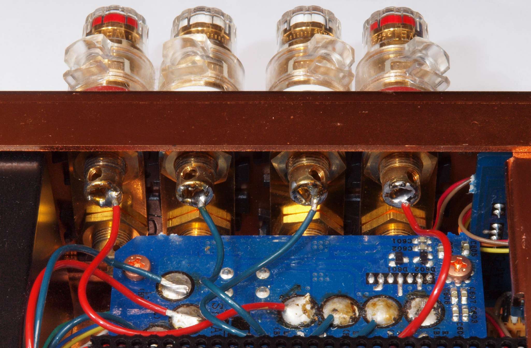 | C02. 修理中 主要基板を取り去ったシャーシ、SP接続端子裏。 | ||||||||||||||||||||||||||||