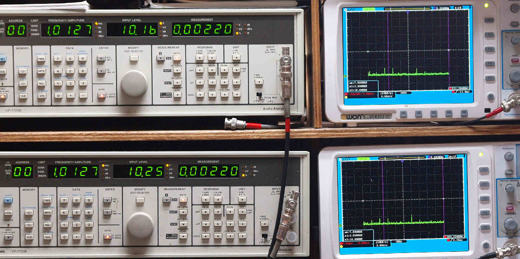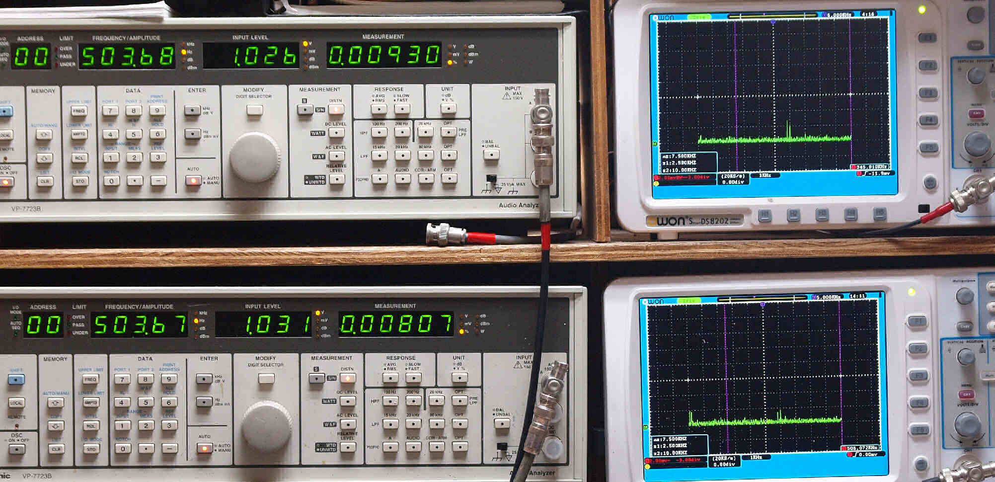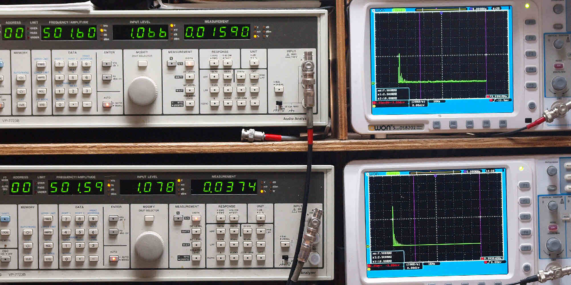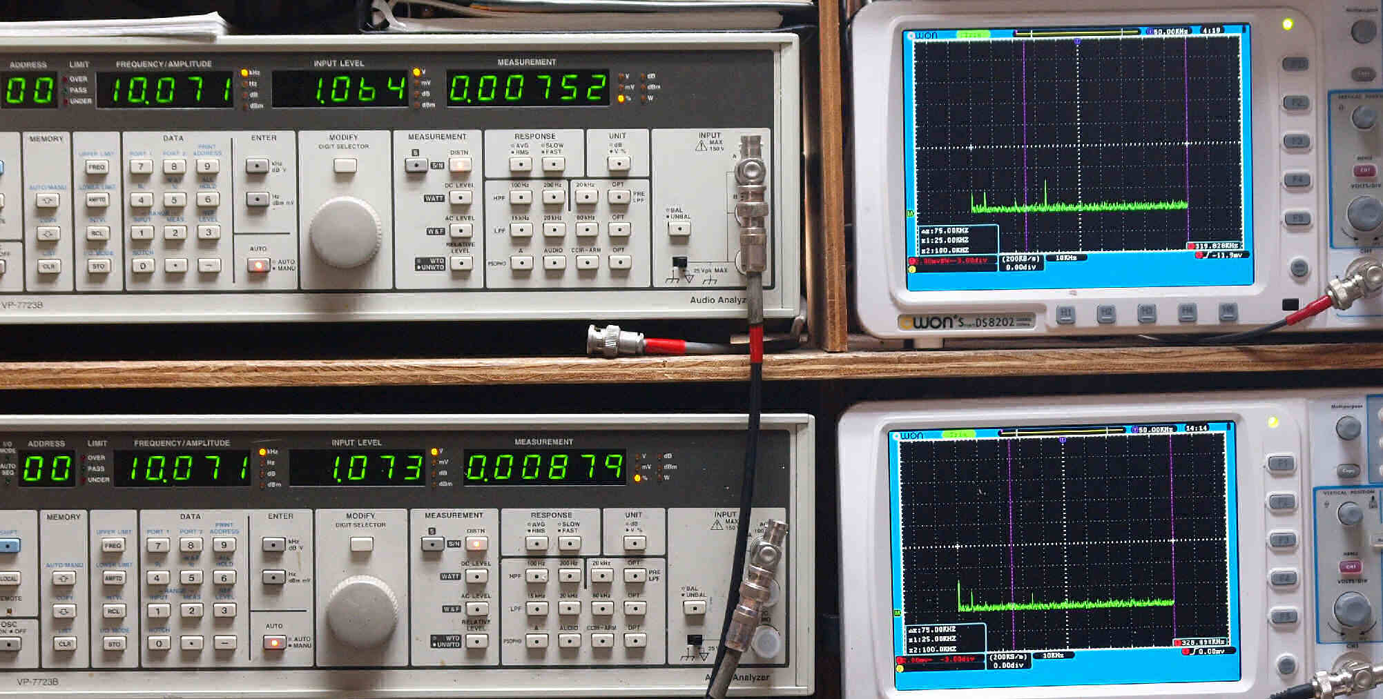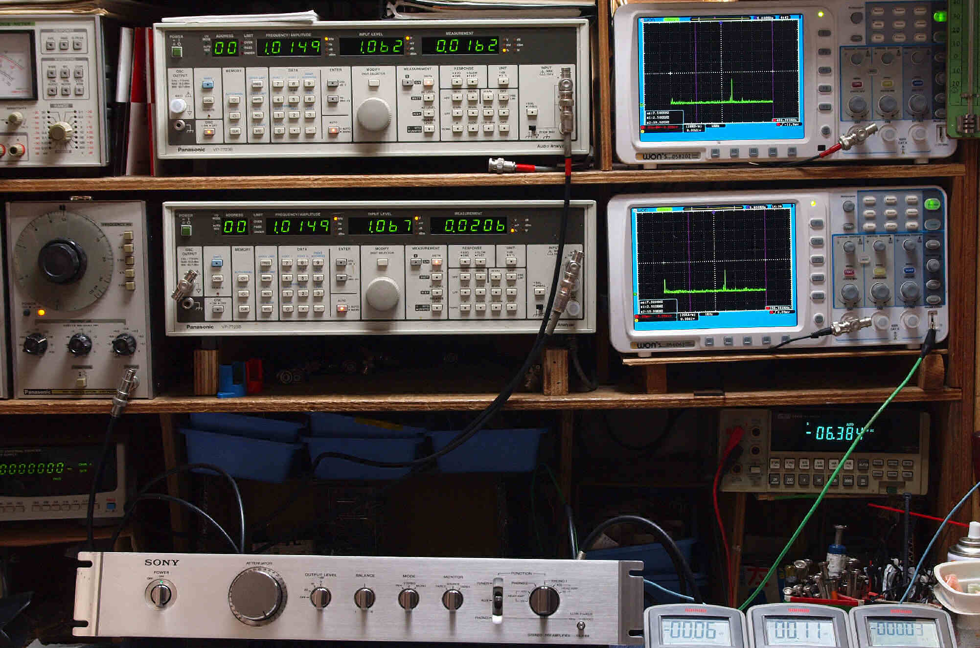 | E. 調整・測定。 画像をクリックすると、大きく(横幅2050ドット)表示されます。 E1. 出力・歪み率測定・調整、「電源電圧は50HZ 100V」。 「見方」。 上段中 右側出力を「Audio Analyzer Panasonic VP−7723B」により測定。 表示LED、 左端=メモリーNo、 中左=周波数測定、 中右=出力電圧測定、 右端=歪み率測定。 上段右端 VP−7723Bの基本波除去出力を「owon SDS8202(200MHZ)」で「FFT分析」表示。 下段中 左側出力を「Audio Analyzer Panasonic VP−7723B」により測定。 表示LED、 左端=メモリーNo、 中左=周波数測定、 中右=出力電圧測定、 右端=歪み率測定。 下段右端 VP−7723Bの基本波除去出力を「owon SDS6062(200MHZ)」で「FFT分析」表示。 下段左端 オーディオ発振器 VP−7201A より50Hz〜100kHzの信号を出し(歪み率=約0.003%)、ATT+分配器を通し、AMPに入力。 よって、ダイアル設定出力レベルより低くなります。測定機器の仕様や整備の様子はこちら、「VP−7723B」「VP−7201A」。 FFT画面の見方はこちら。 |