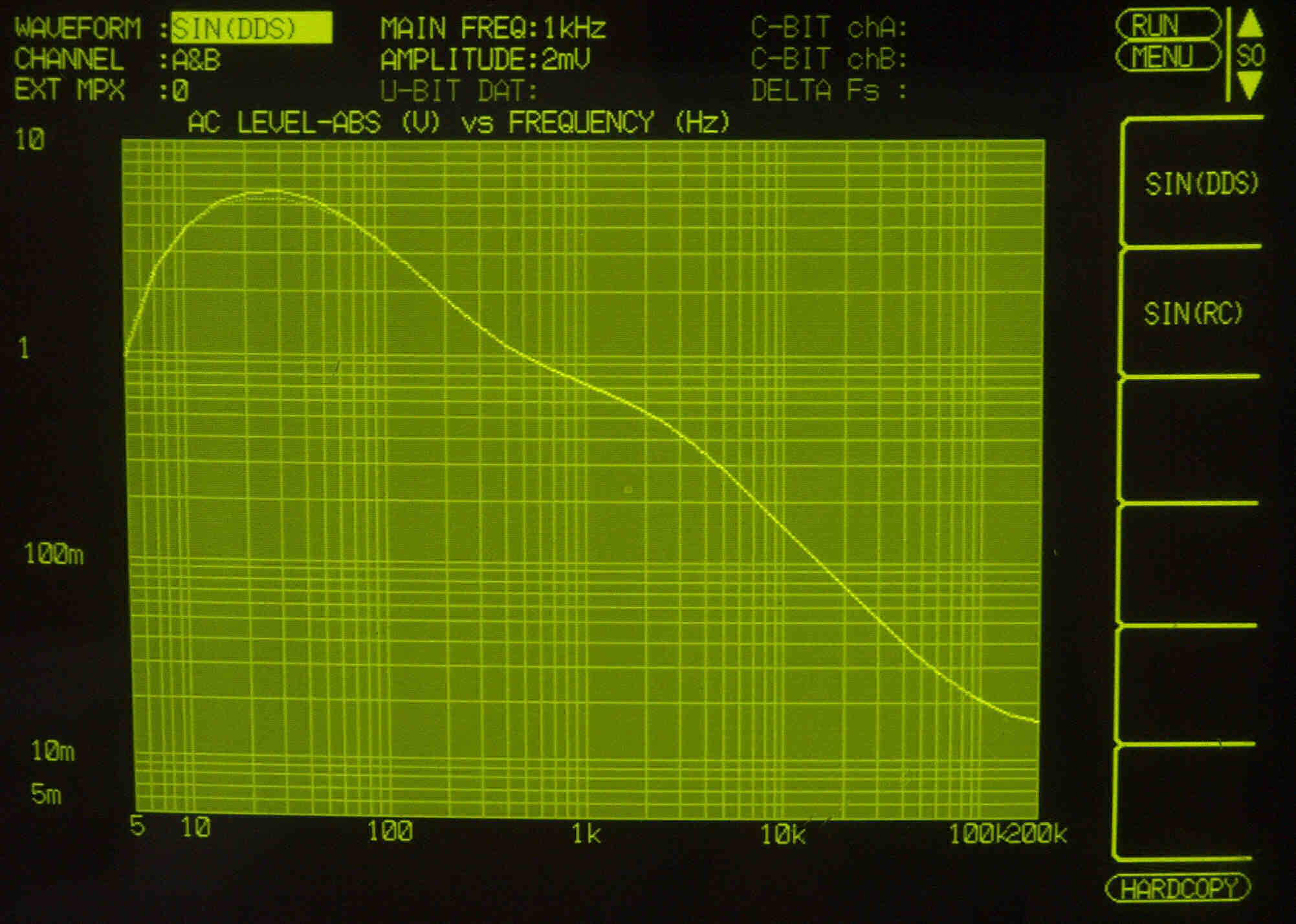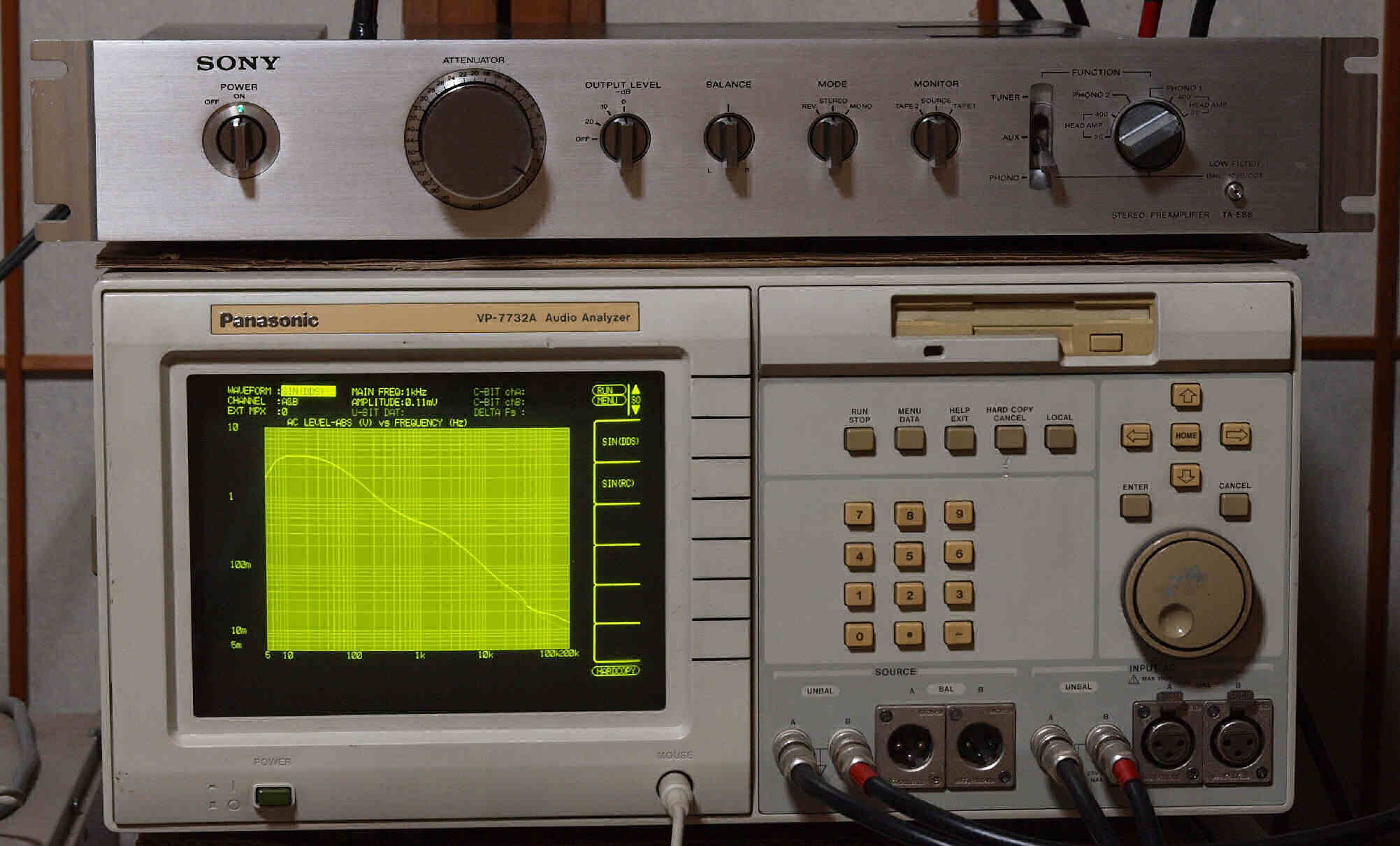 | F. 上位測定器による 調整・測定。 画像をクリックすると、大きく(横幅2050ドット)表示されます。 F1. 下のオーディオアナライザー VP−7732Aで自動測定。 「電源電圧は50HZ 100V」 |