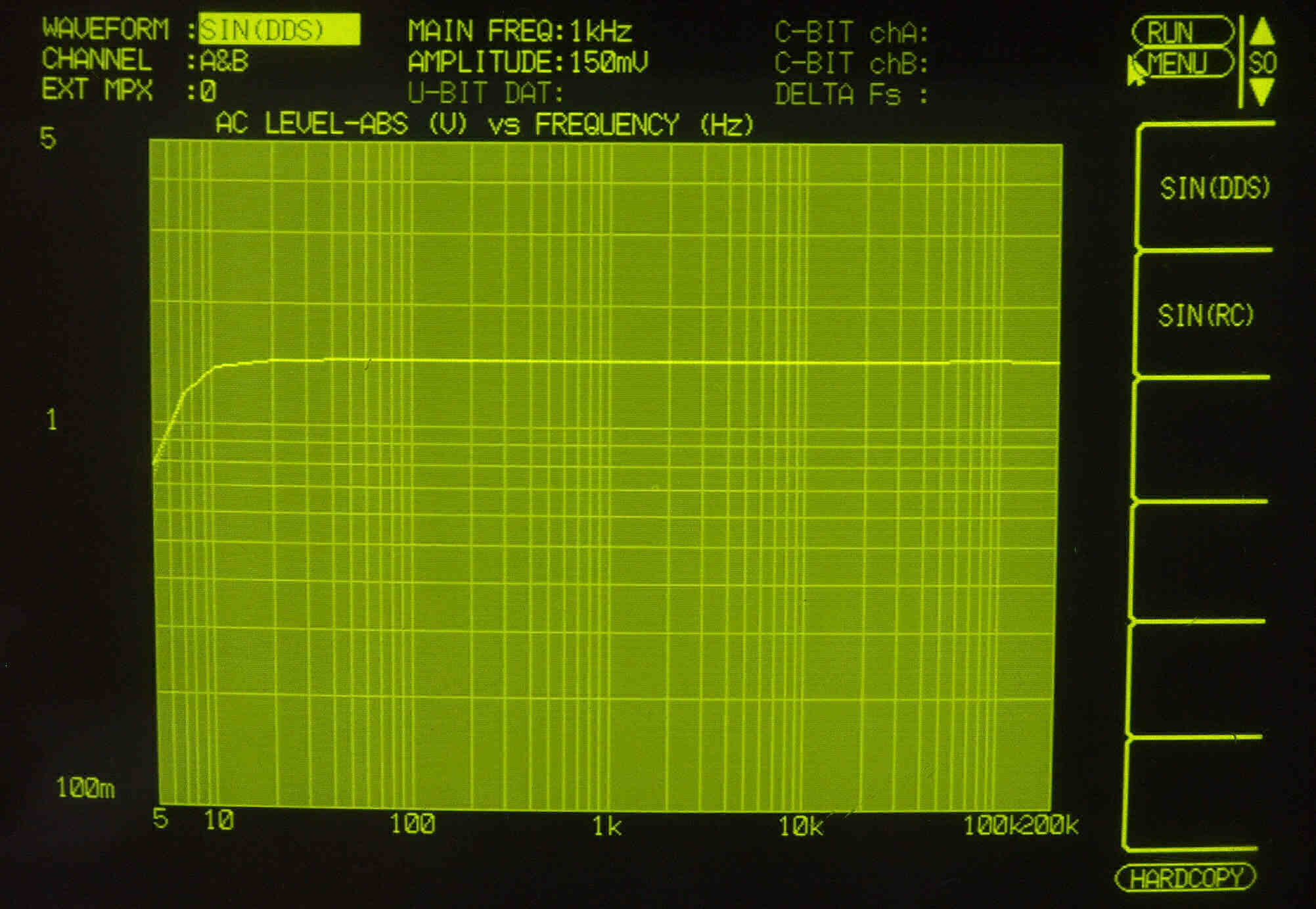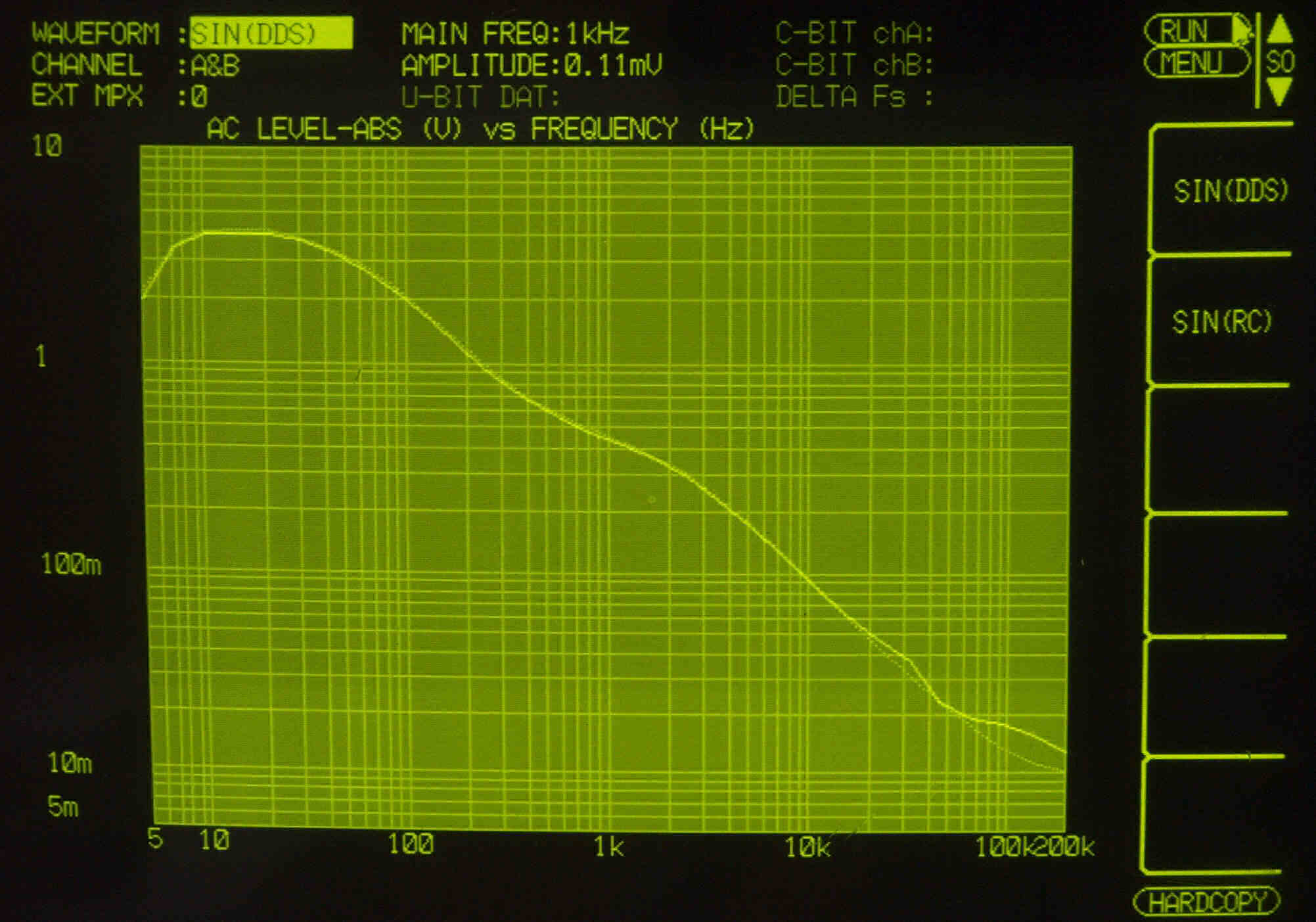 | E27. AUX 50kHz入力、R側出力電圧=0.9V、 0.0082%歪み。 L側出力電圧=0.9V、 0.0082%歪み。 「FFT分析」のオシロのカーソル周波数、左=100kHz、右=500kHz。 真空管AMPの組み合わせの為か、この下の周波数(30kHz)からフイルターが効いている。 |