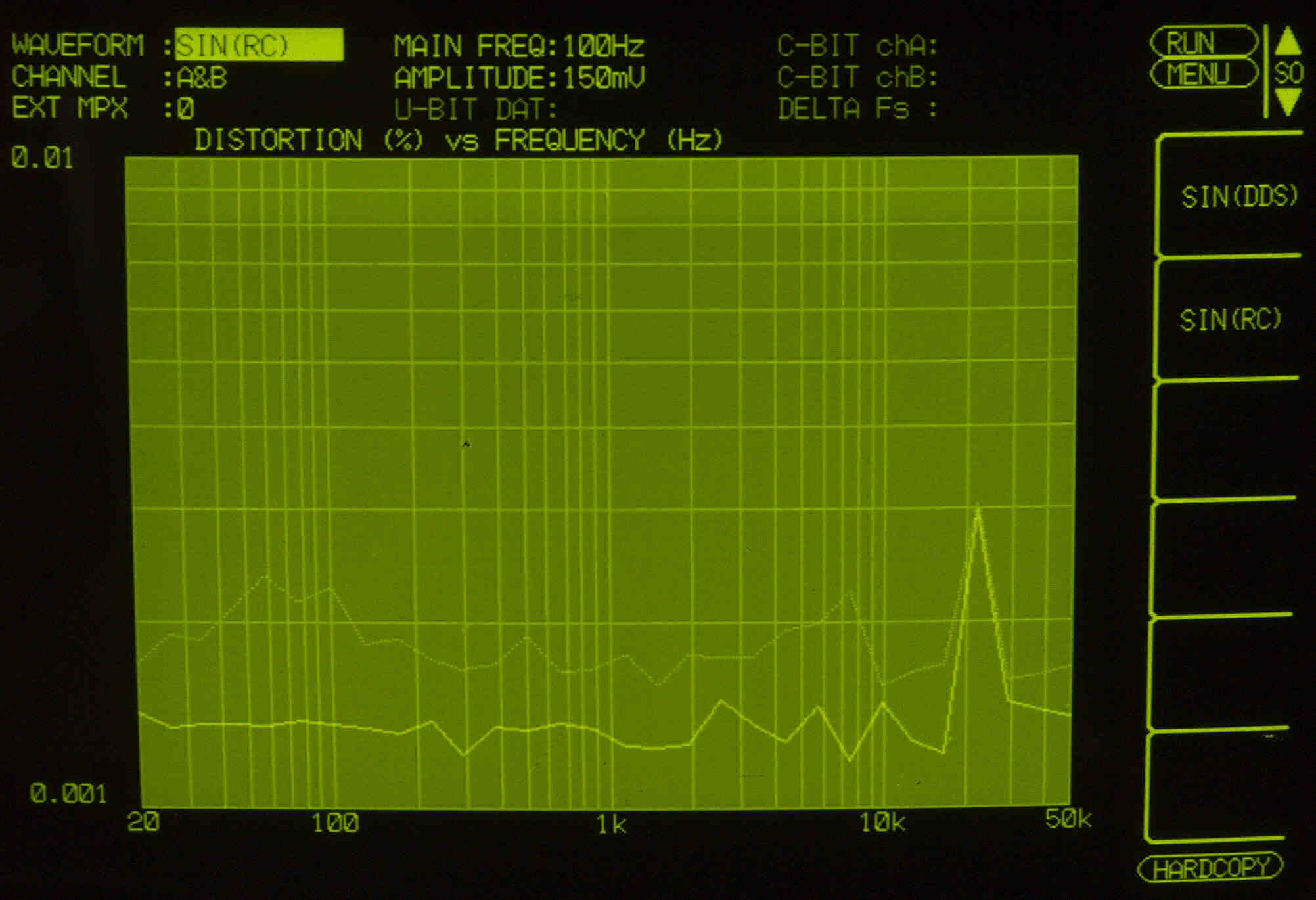 | E34. MM 1kHz入力、R側出力電圧=1V、 0.020%歪み。 L側出力電圧=1V、 0.052%歪み。 「FFT分析」のオシロのカーソル周波数、左=2.5kHz、右=10kHz。 |