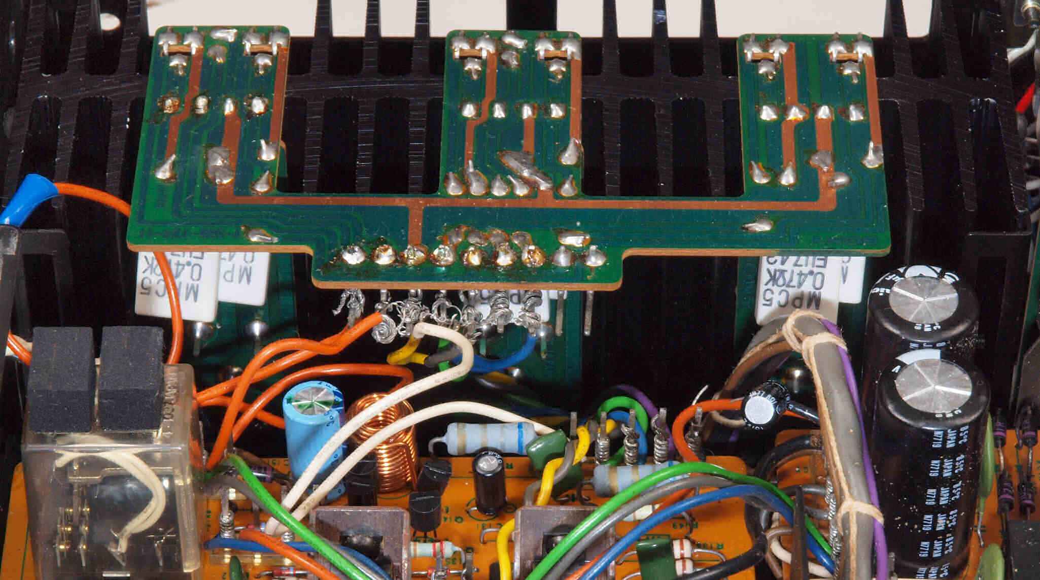 A31. 点検中 R側 終段V−FET(縦型電解トランジスター)、 上はカスケードTR(トランジスター)。