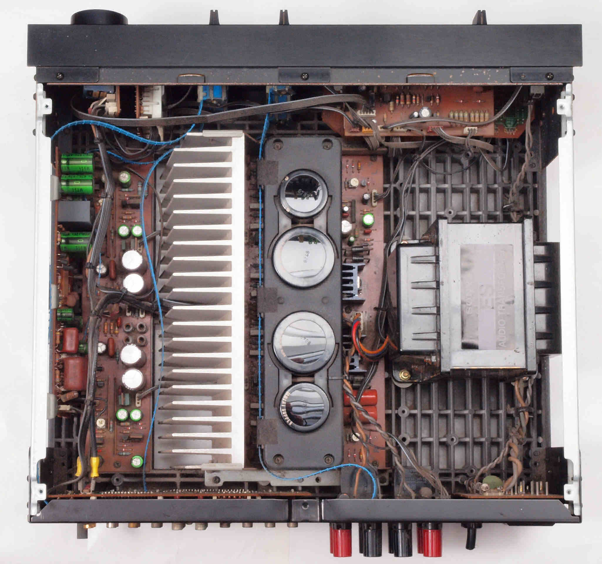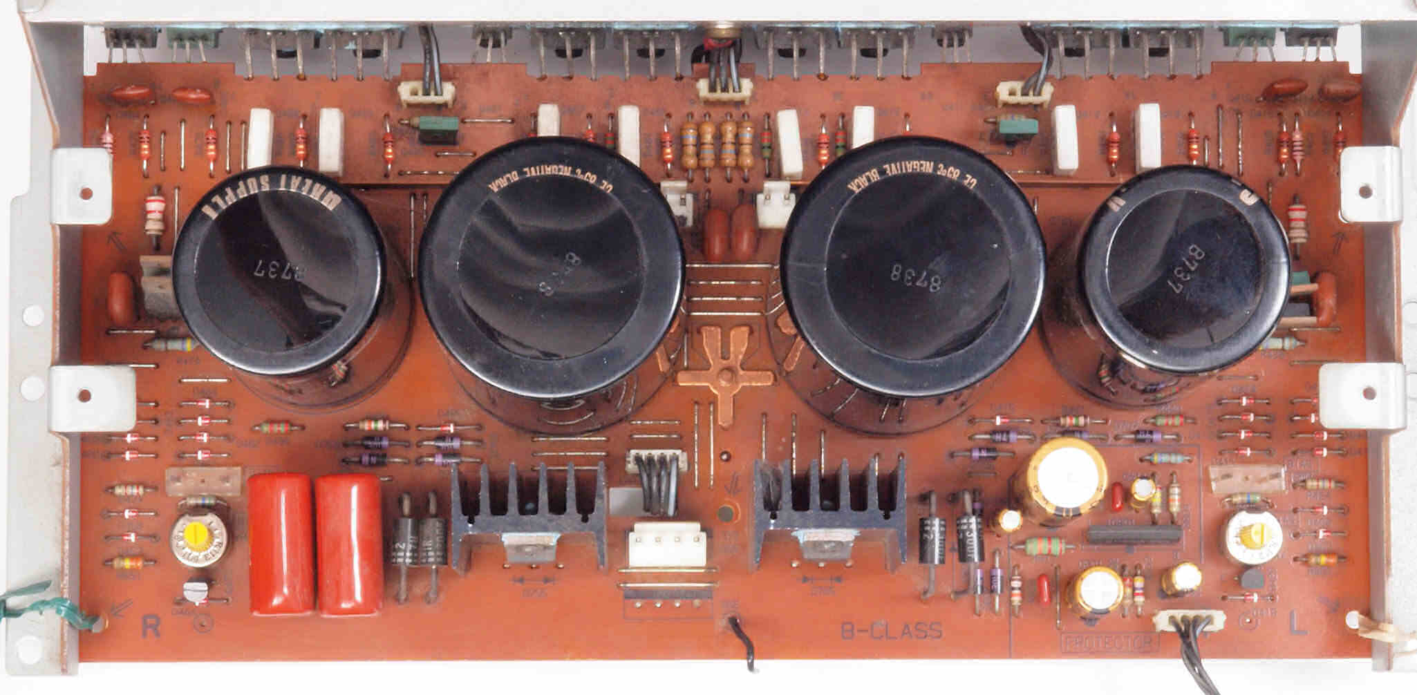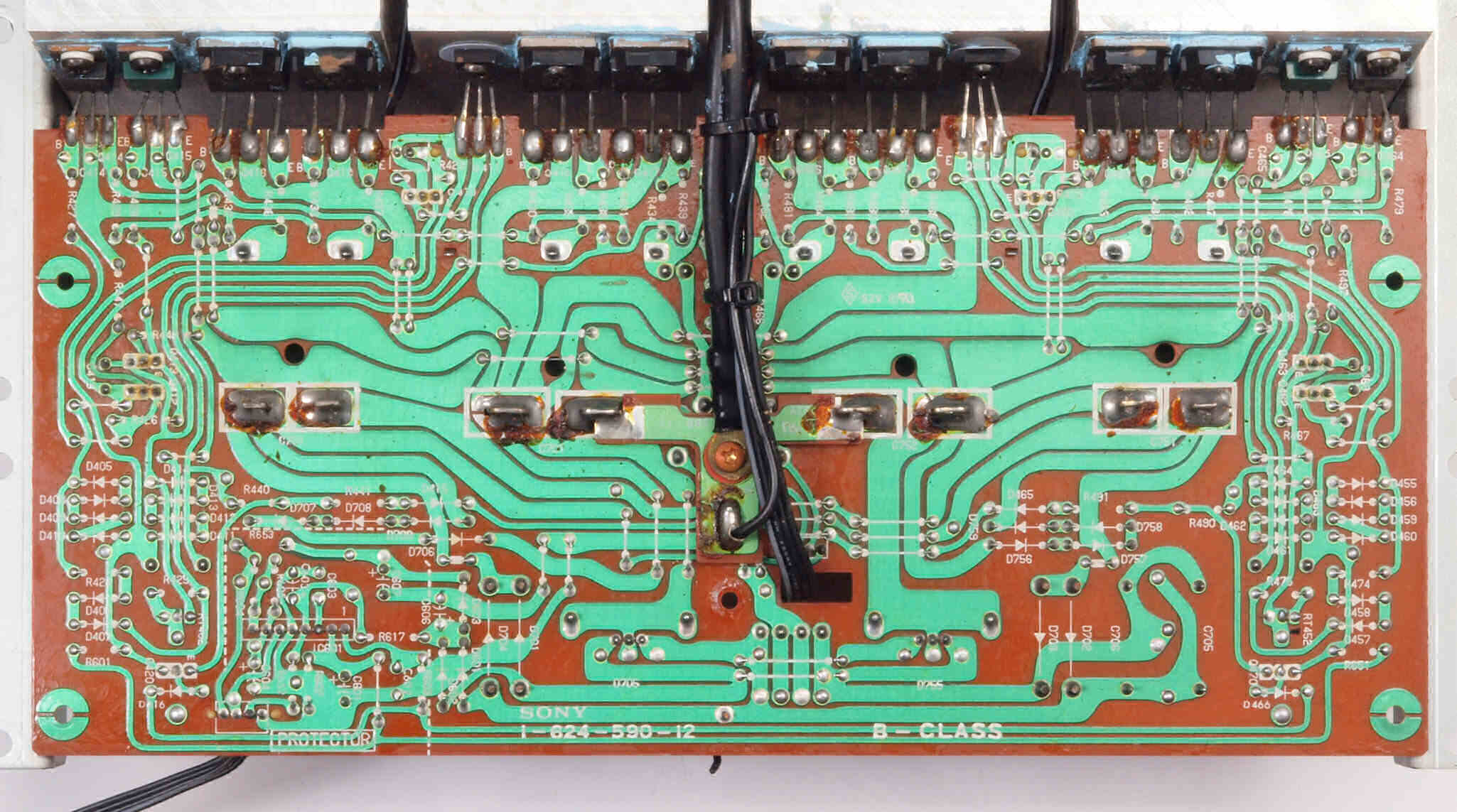 | A1B. 点検中 POWER AMP−B基板。 右側ヒューズ入抵抗は全滅。 | ||||||||||||||||||||||||||||||||||||||