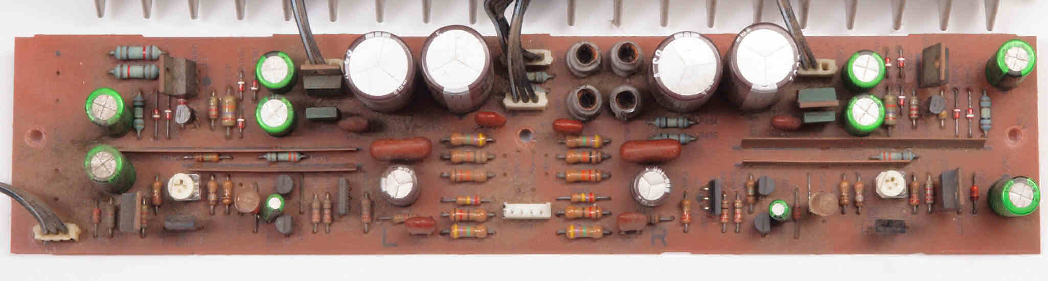 | A1A. 点検中 POWER AMP−B基板。 左側ヒューズ入抵抗は全滅。 | ||||||||||||||||||||||||||||||||||||||