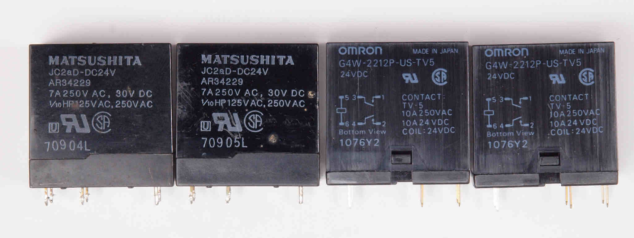 | CJ2. 交換部品、SP接続リレー。 左=付いていた接点容量7Aのリレー、8Ω出力だと392W定格。 右=交換する接点容量10Aのリレー、8Ω出力だと800W定格。 |