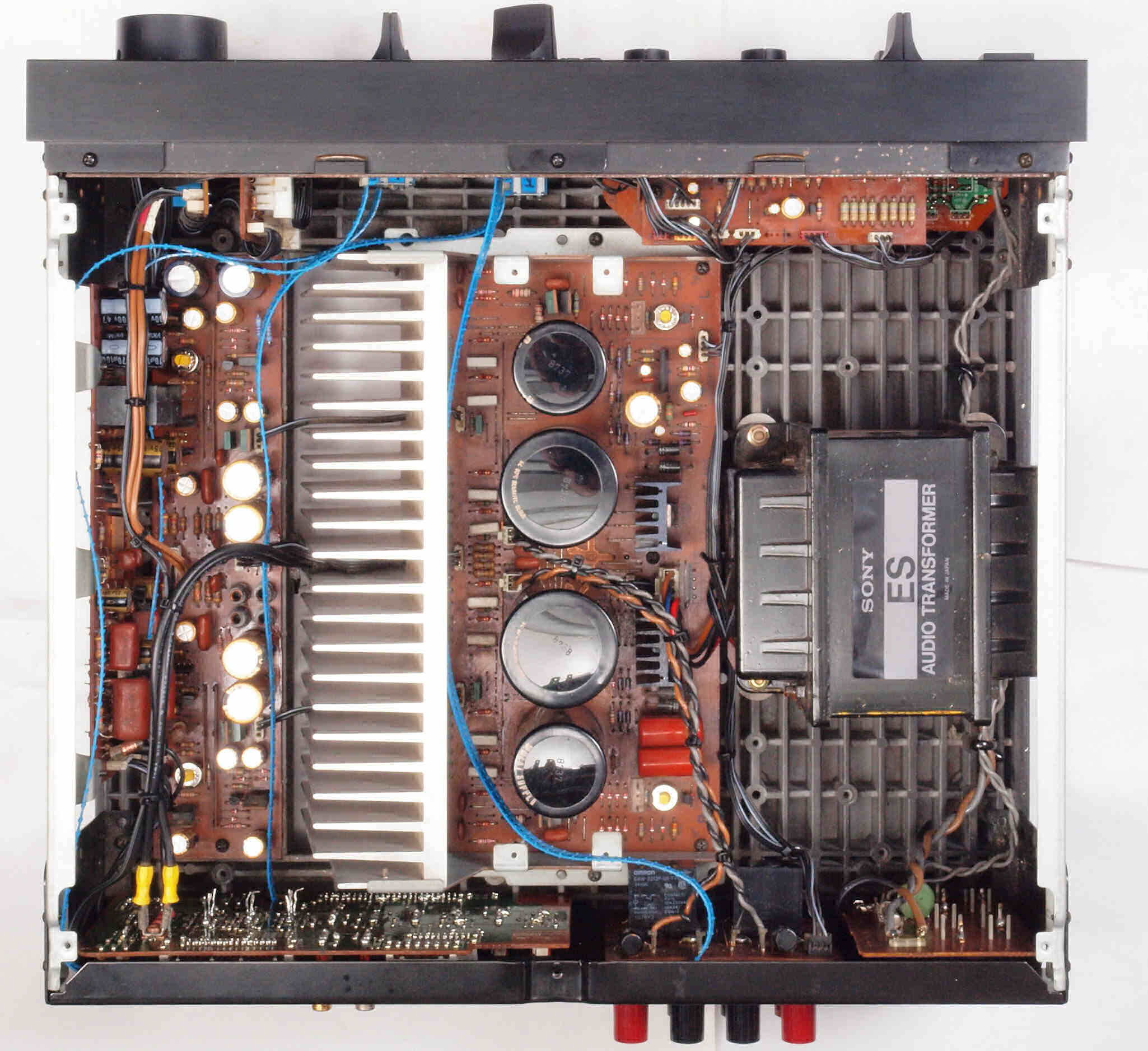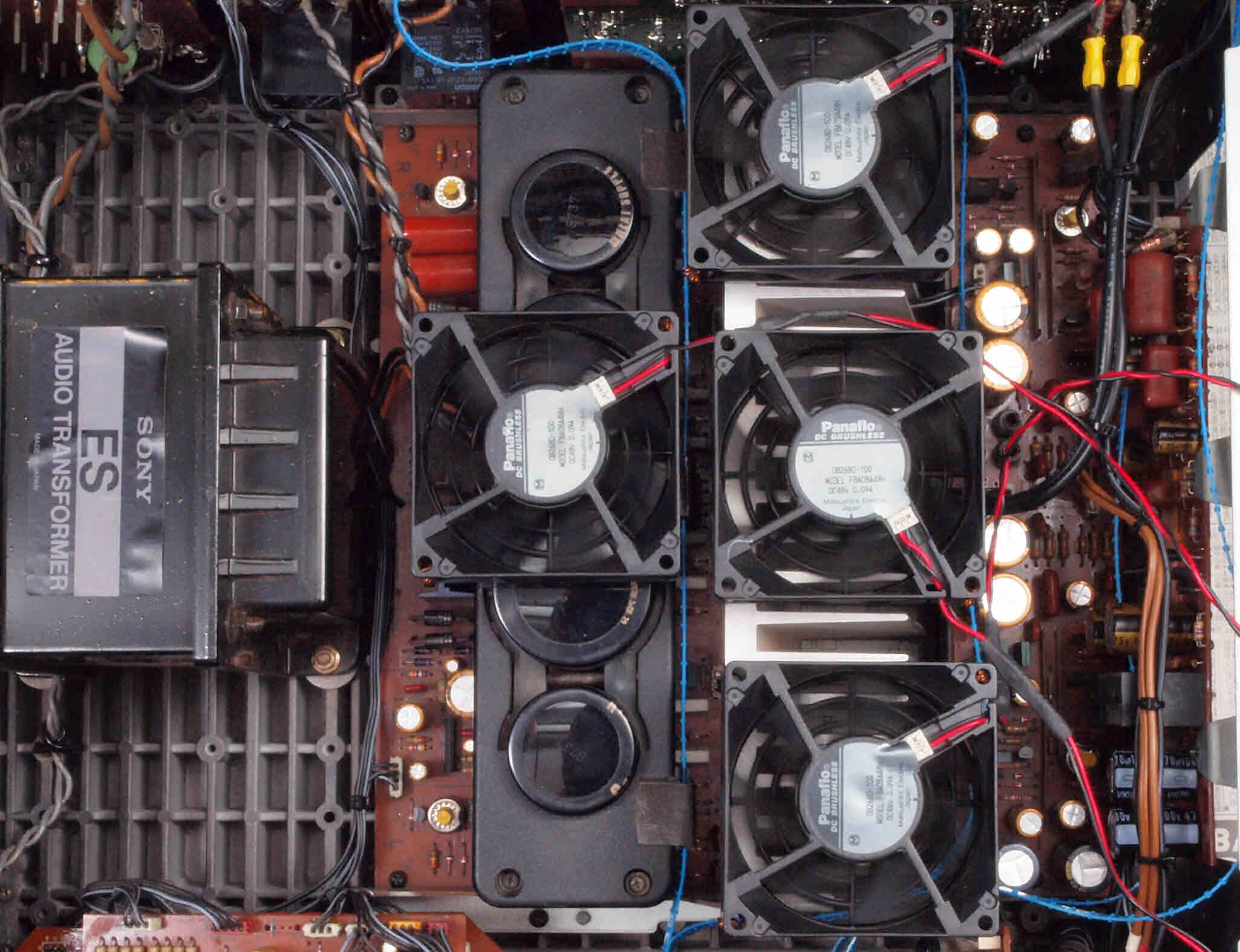 | A1E. 点検中 POWER AMP−A基板。 左電解コンデンサーが膨らんでいる。 | ||||||||||||||||||||||||||||||||||||||