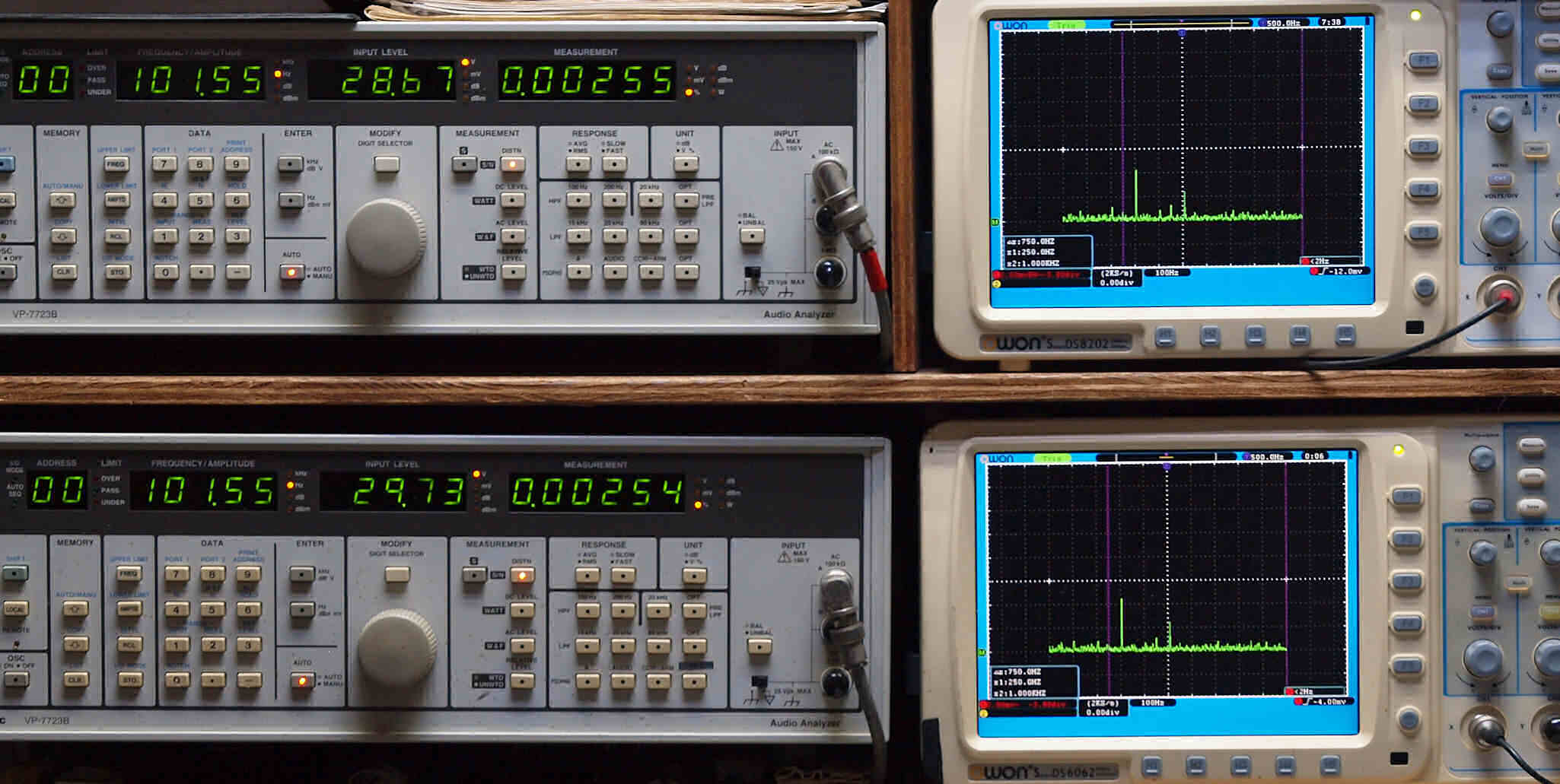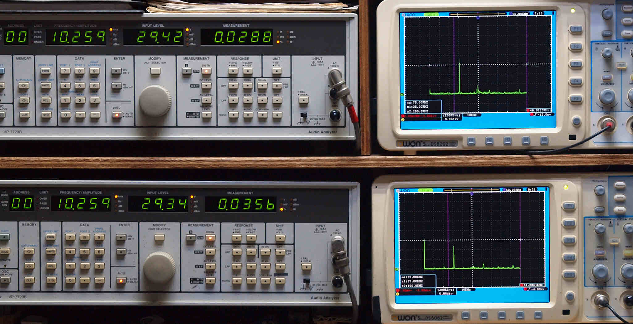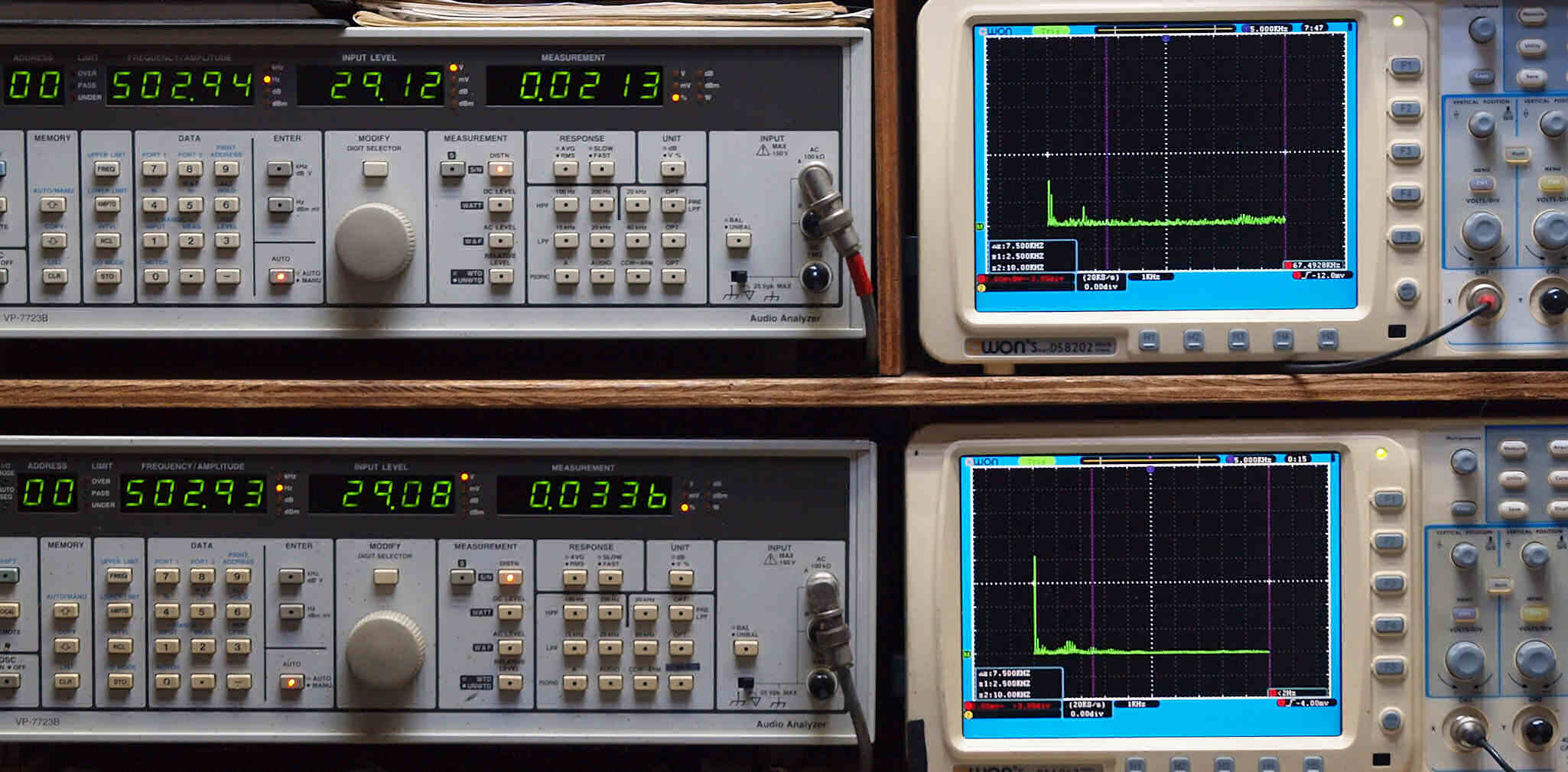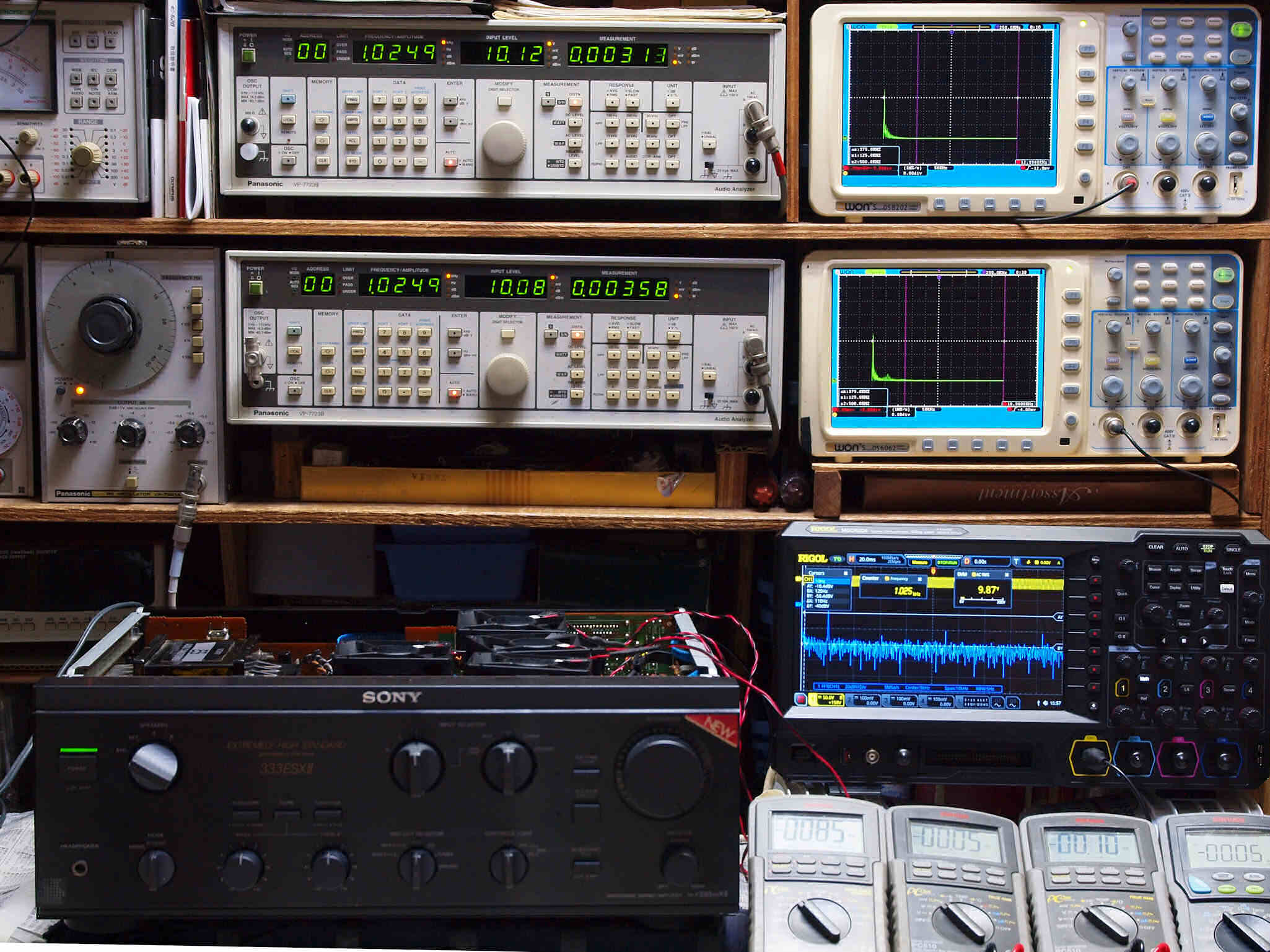 | E. 調整・測定。 画像をクリックすると、大きく(横幅2050ドット)表示されます。 E0. 出力・歪み率測定・調整、「電源電圧は50HZ 100V」。 「見方」。 上段中 右側出力を「Audio Analyzer Panasonic VP−7723B」により測定。 表示LED、 左端=メモリーNo、 中左=周波数測定、 中右=出力電圧測定、 右端=歪み率測定。 上段右端 VP−7723Bの基本波除去出力を「owon SDS8202(200MHZ)」で「FFT分析」表示。 下段中 左側出力を「Audio Analyzer Panasonic VP−7723B」により測定。 表示LED、 左端=メモリーNo、 中左=周波数測定、 中右=出力電圧測定、 右端=歪み率測定。 下段右端 VP−7723Bの基本波除去出力を「owon SDS6062(200MHZ)」で「FFT分析」表示。 下段左端 オーディオ発振器 VP−7201A より50Hz〜100kHzの信号を出し(歪み率=約0.003%)、ATT+分配器を通し、AMPに入力。 よって、ダイアル設定出力レベルより低くなります。測定機器の仕様や整備の様子はこちら、「VP−7723B」「VP−7201A」。 FFT画面の見方はこちら。 |