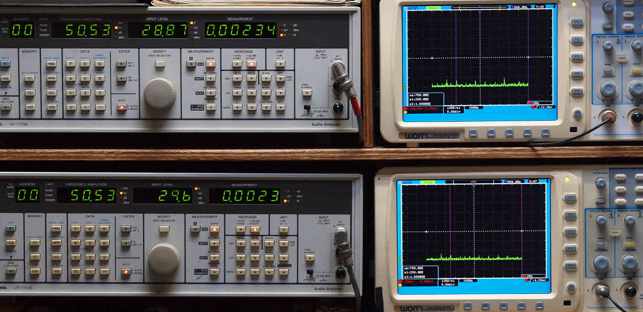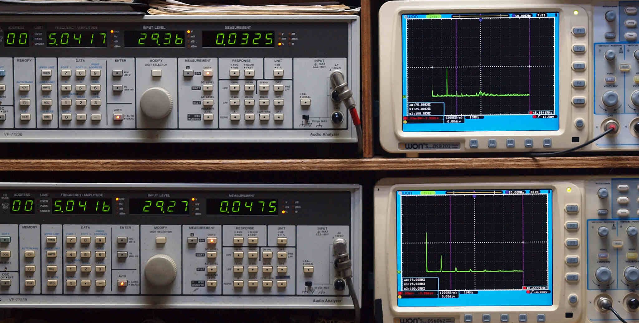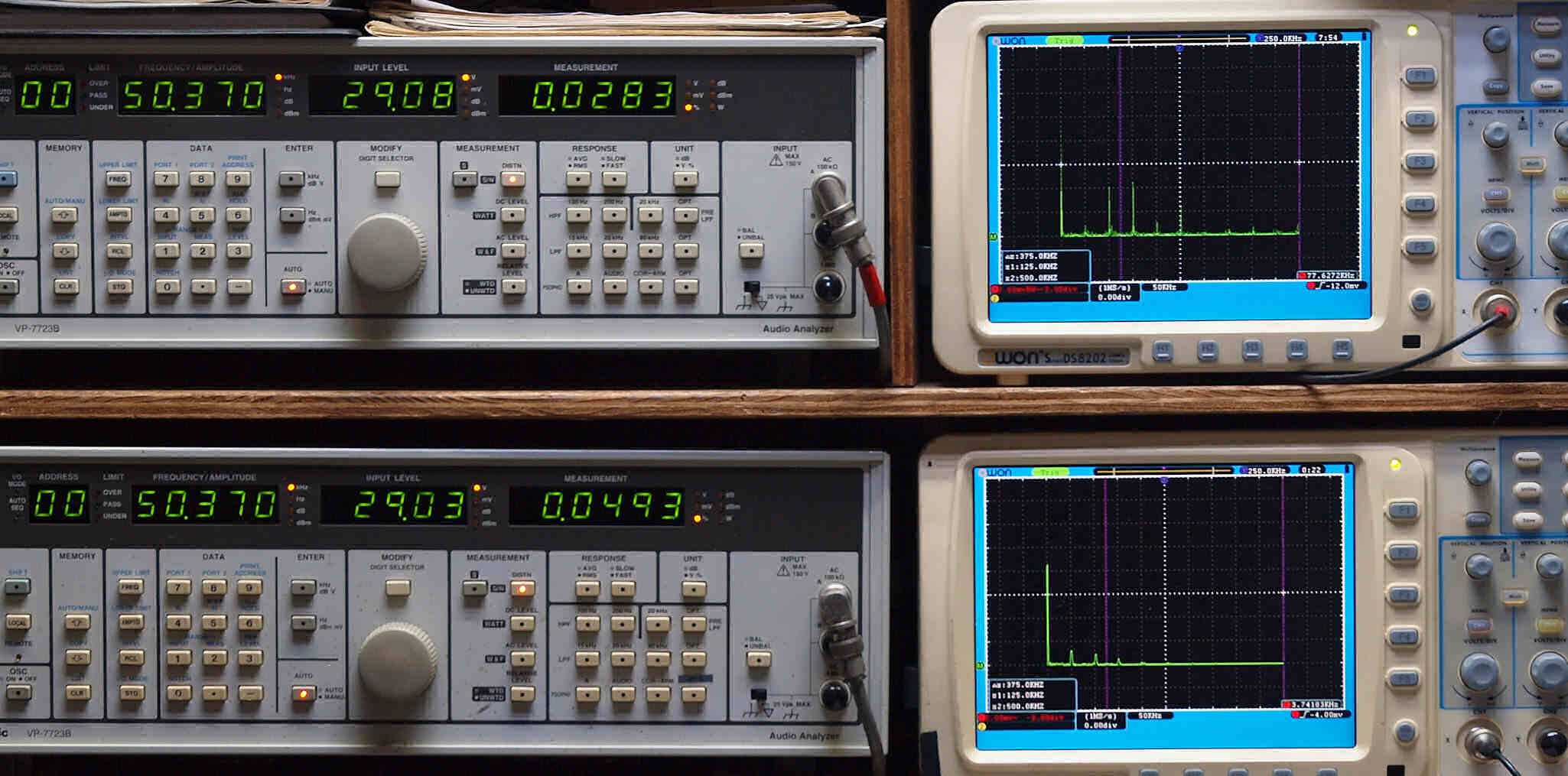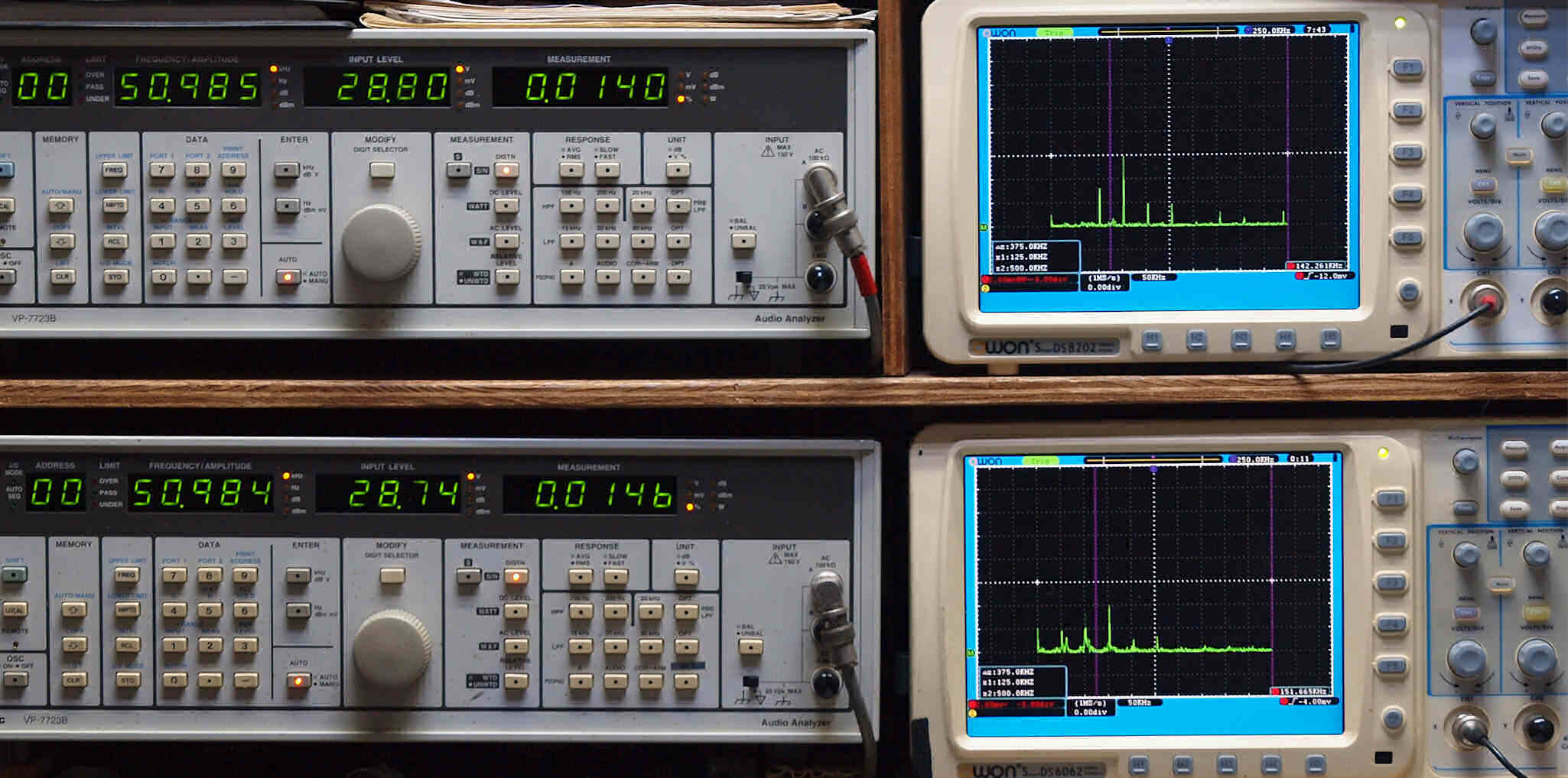 | E. 調整・測定。 画像をクリックすると、大きく(横幅2050ドット)表示されます。 E0. 出力・歪み率測定・調整、「電源電圧は50HZ 100V」。 「見方」。 上段中 右側出力を「Audio Analyzer Panasonic VP−7723B」により測定。 表示LED、 左端=メモリーNo、 中左=周波数測定、 中右=出力電圧測定、 右端=歪み率測定。 上段右端 VP−7723Bの基本波除去出力を「owon SDS8202(200MHZ)」で「FFT分析」表示。 下段中 左側出力を「Audio Analyzer Panasonic VP−7723B」により測定。 表示LED、 左端=メモリーNo、 中左=周波数測定、 中右=出力電圧測定、 右端=歪み率測定。 下段右端 VP−7723Bの基本波除去出力を「owon SDS6062(200MHZ)」で「FFT分析」表示。 下段左端 オーディオ発振器 VP−7201A より50Hz〜100kHzの信号を出し(歪み率=約0.003%)、ATT+分配器を通し、AMPに入力。 よって、ダイアル設定出力レベルより低くなります。測定機器の仕様や整備の様子はこちら、「VP−7723B」「VP−7201A」。 FFT画面の見方はこちら。 |