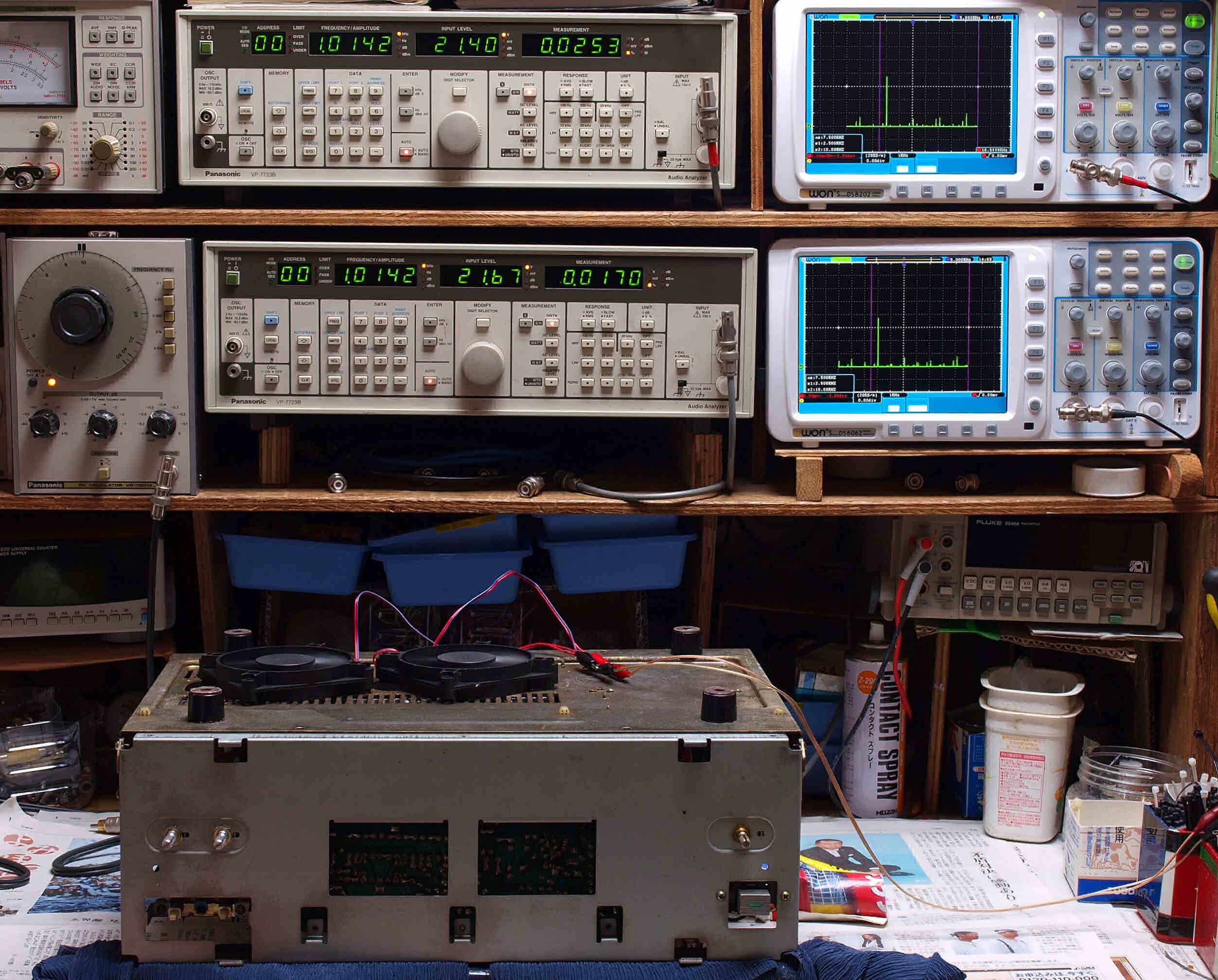 | E. 調整・測定。 E1. 出力・歪み率測定・調整。 「見方」。 上段中 右側SP出力を「Audio Analyzer Panasonic VP−7723B」により測定。 表示LED、 左端=メモリーNo、 中左=周波数測定、 中右=出力電圧測定、 右端=歪み率測定。 上段右端 VP−7723Bの基本波除去出力を「owon SDS8202(200MHZ)」で「FFT分析」表示。 下段中 左側SP出力を「Audio Analyzer Panasonic VP−7723B」により測定。 表示LED、 左端=メモリーNo、 中左=周波数測定、 中右=出力電圧測定、 右端=歪み率測定。 下段右端 VP−7723Bの基本波除去出力を「owon SDS6062(200MHZ)」で「FFT分析」表示。 下段左端 オーディオ発振器 VP−7201A より50Hz〜100kHzの信号を出し(歪み率=約0.003%)、ATT+分配器を通し、AMPに入力。 よって、ダイアル設定出力レベルより低くなります。測定機器の仕様や整備の様子はこちら、「VP−7723B」「VP−7201A」。 FFT画面の見方はこちら。 |