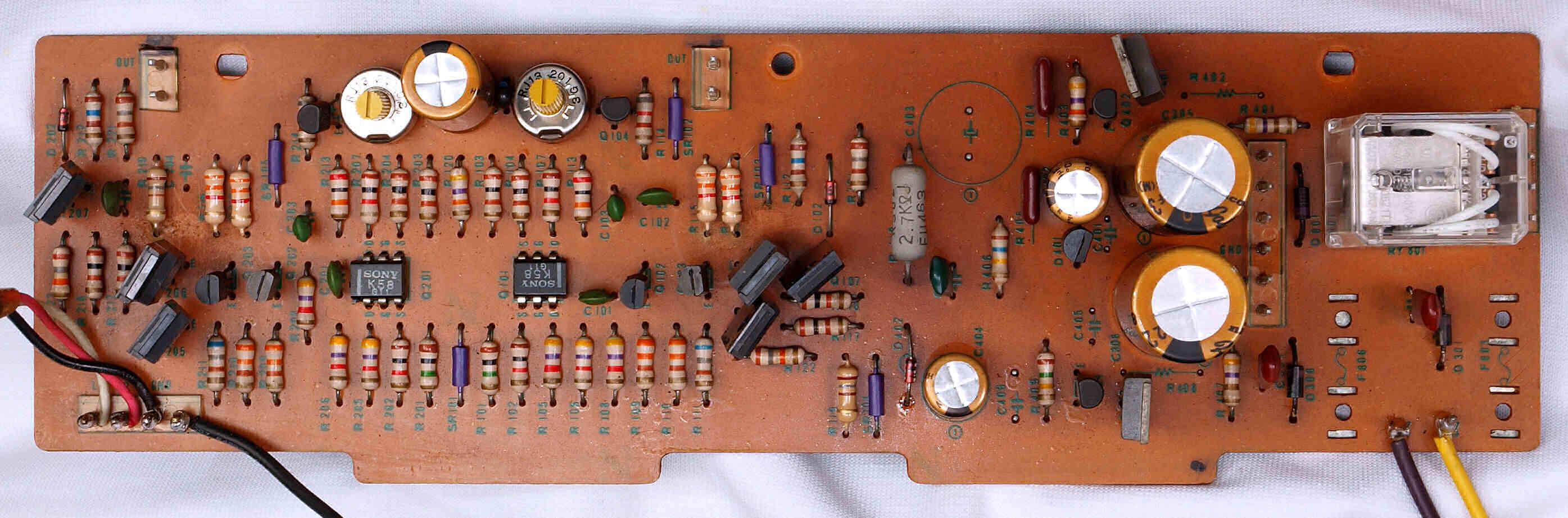 | C313. 修理中 入力アンプ・定電圧基板、 接着材で抵抗・TR(トランジスター)の端子が腐食しているので交換する。 | ||||||||||||||||||||||||||||