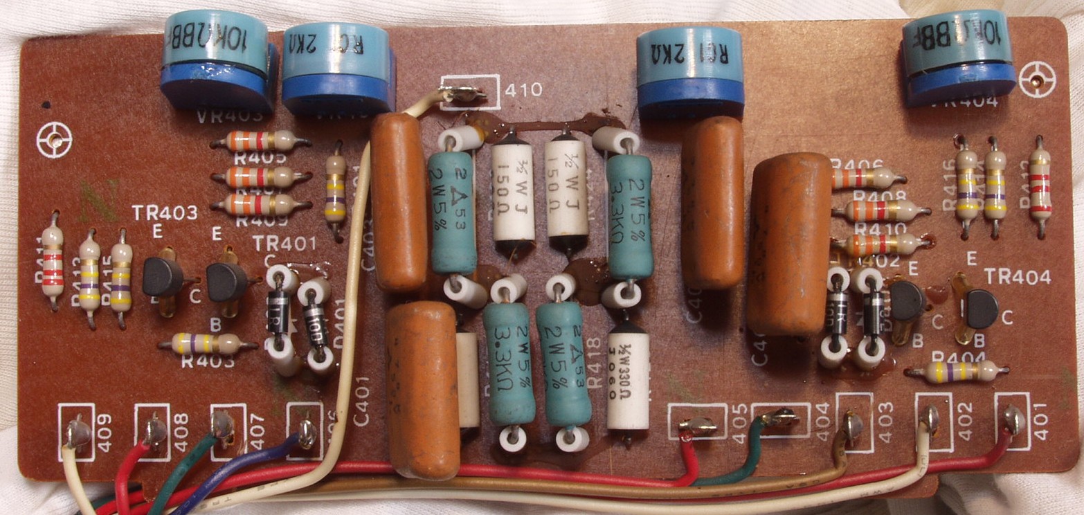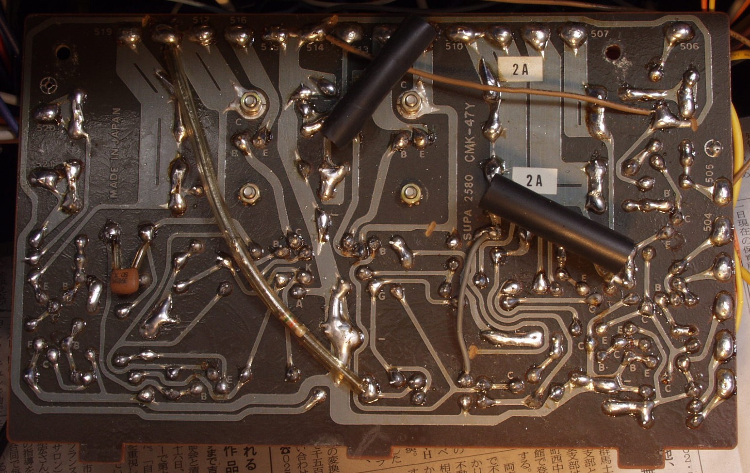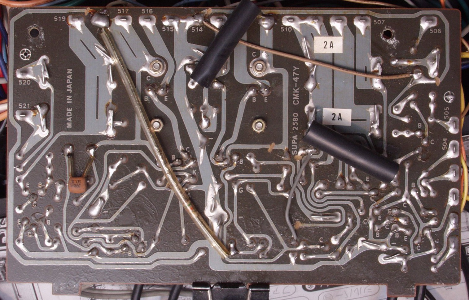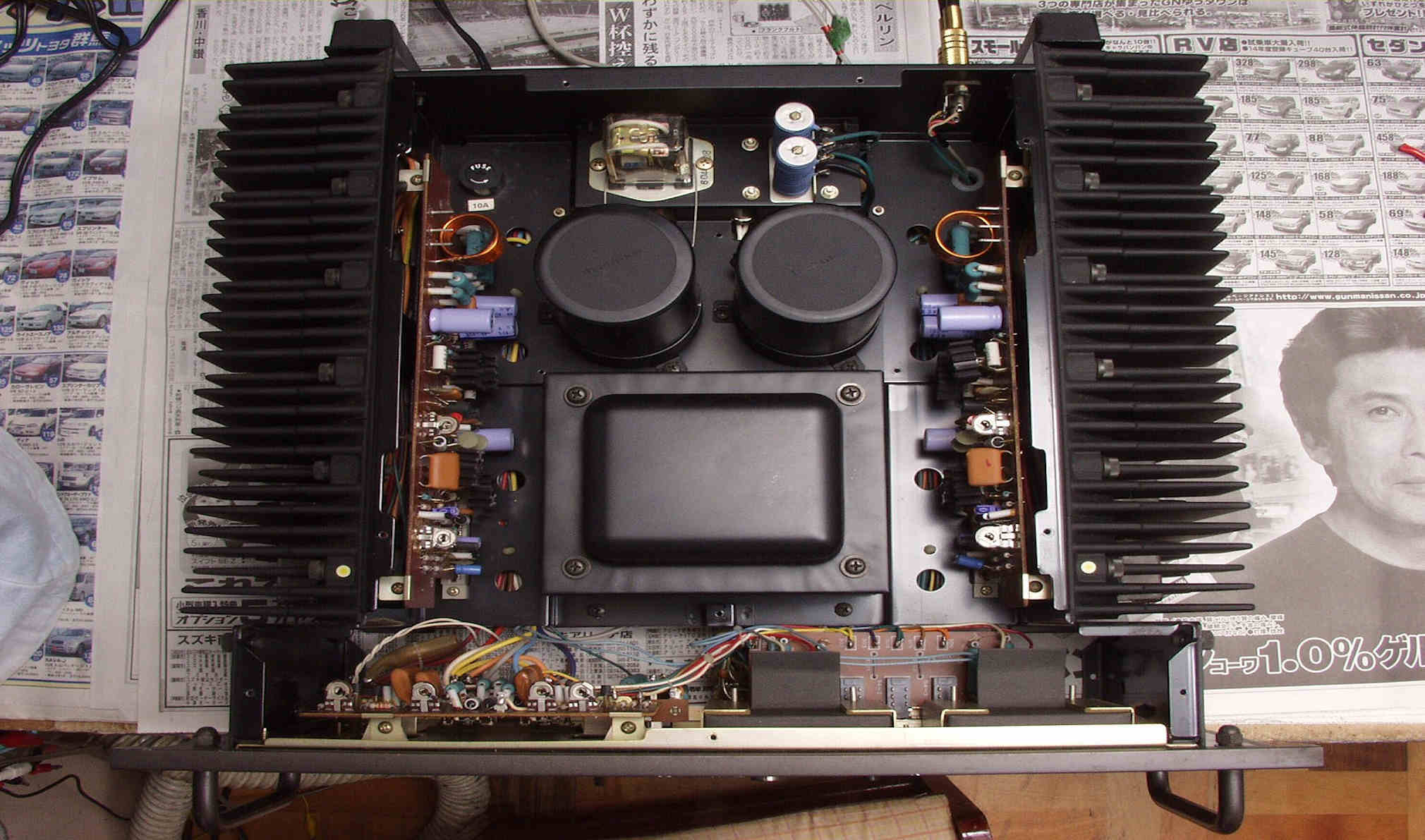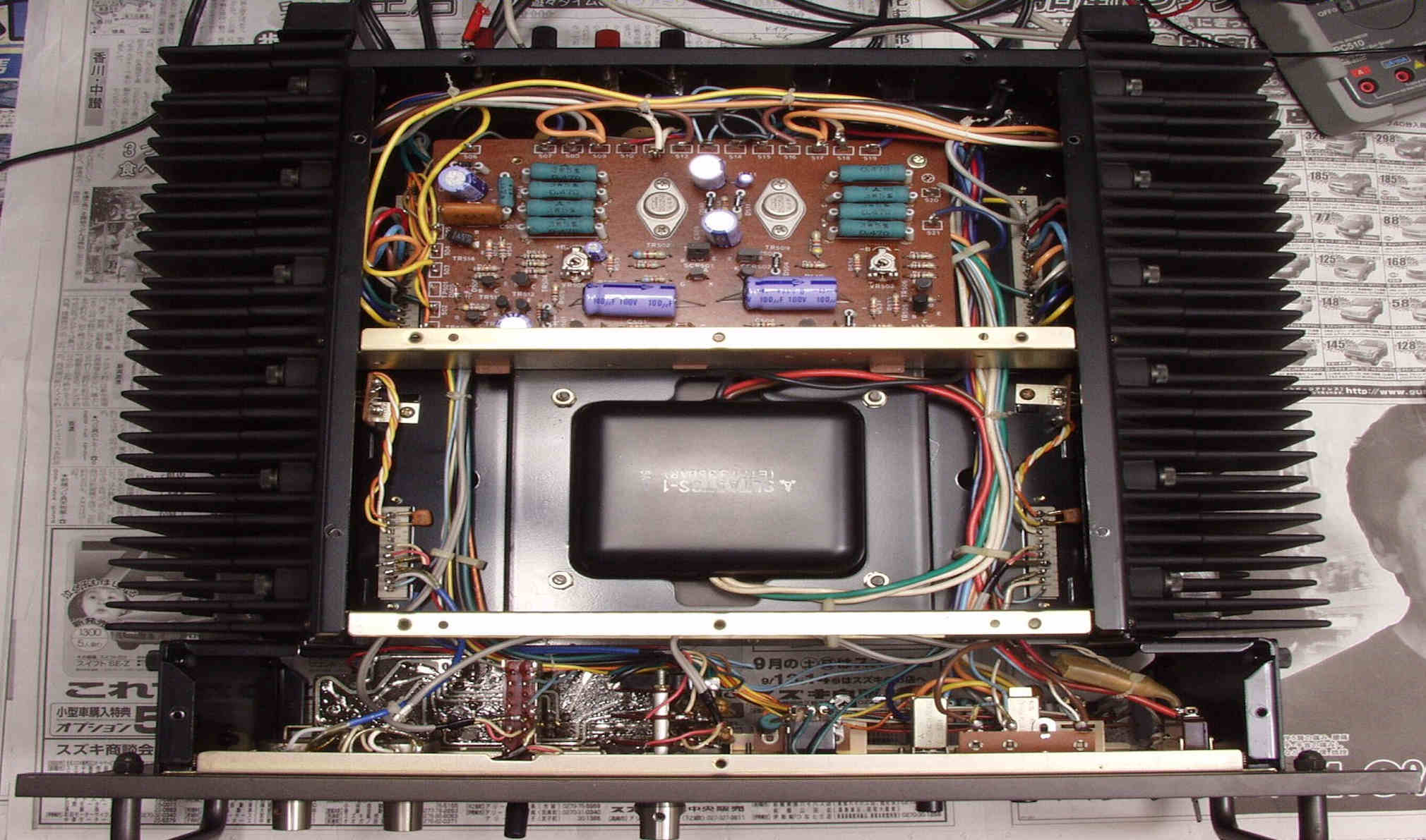 | 寸評 終段TR(トランジスター)の供給電圧まで安定化した理想的なAMPです。 途中で基盤改造がありますので、未対策器は修理した方が良いです(対作品は「2a」のシールが添付) 高域の発振対策を施し、安全の為、フューズを挿入した |
