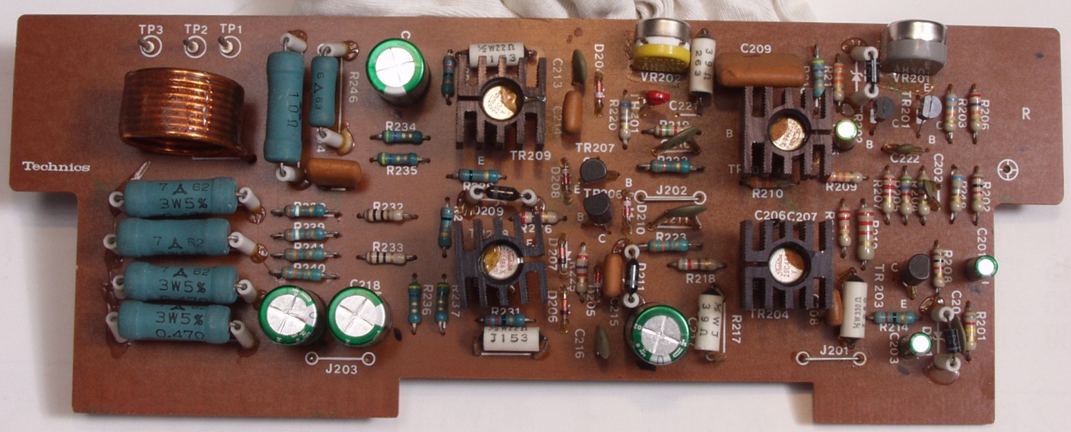 | C1B. 修理後 Rドライブ基板 初段TR(トランジスター)2個、バランス/バイアス調整用半固定VR2個、 電解コンデンサー7個交換 |