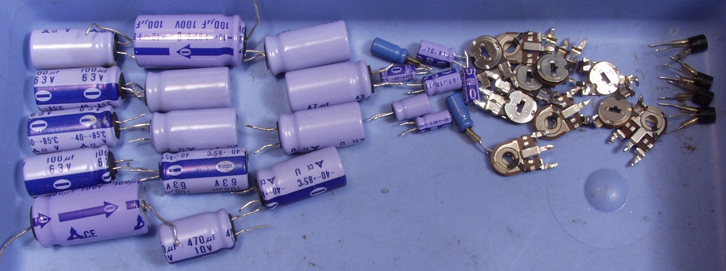 | C2B. 修理後 Lドライブ基板 初段TR(トランジスター)2個、バランス/バイアス調整用半固定VR2個、 電解コンデンサー7個交換 |