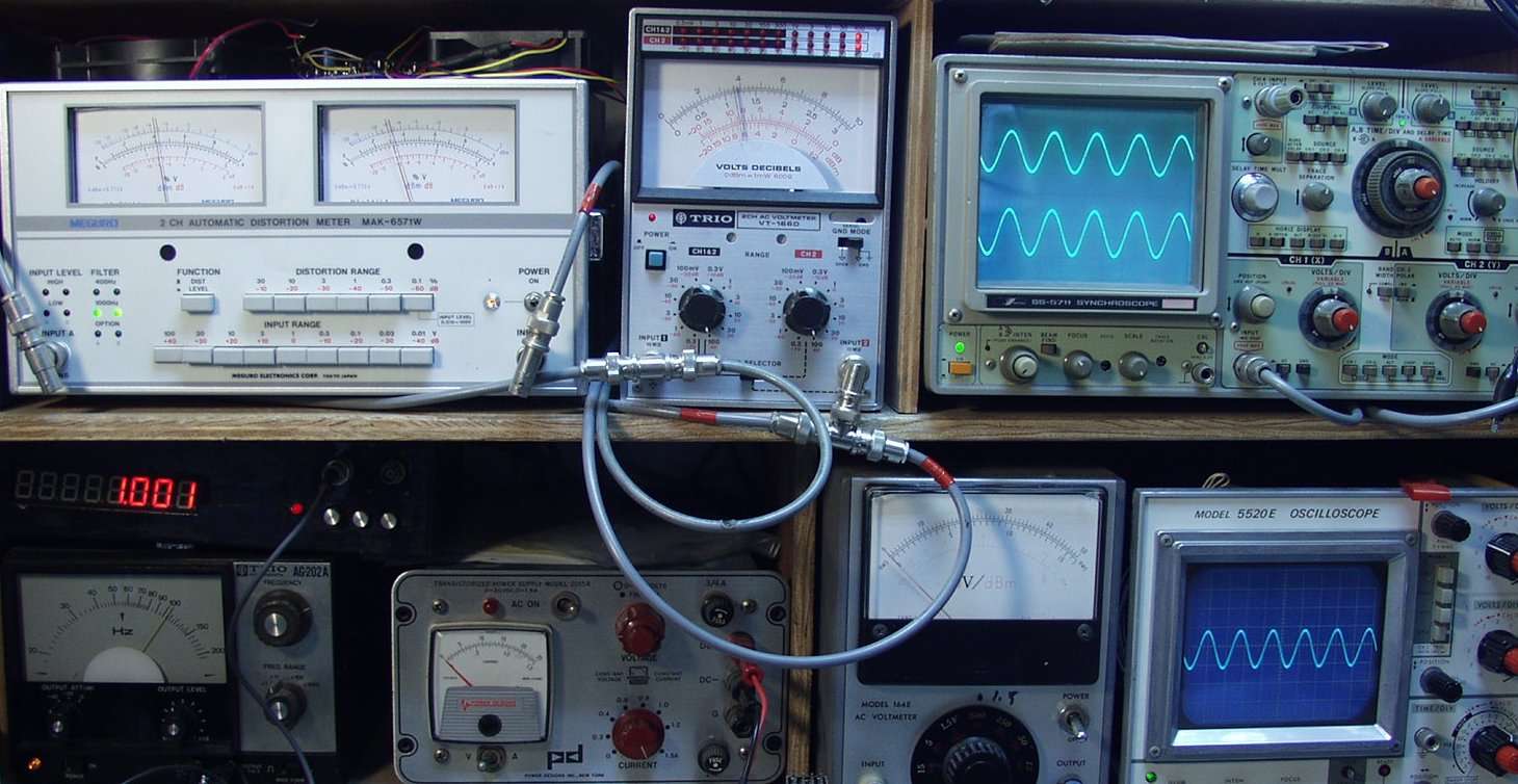 左=歪率計 中=電圧計 右=出力波形 右下=入力波形