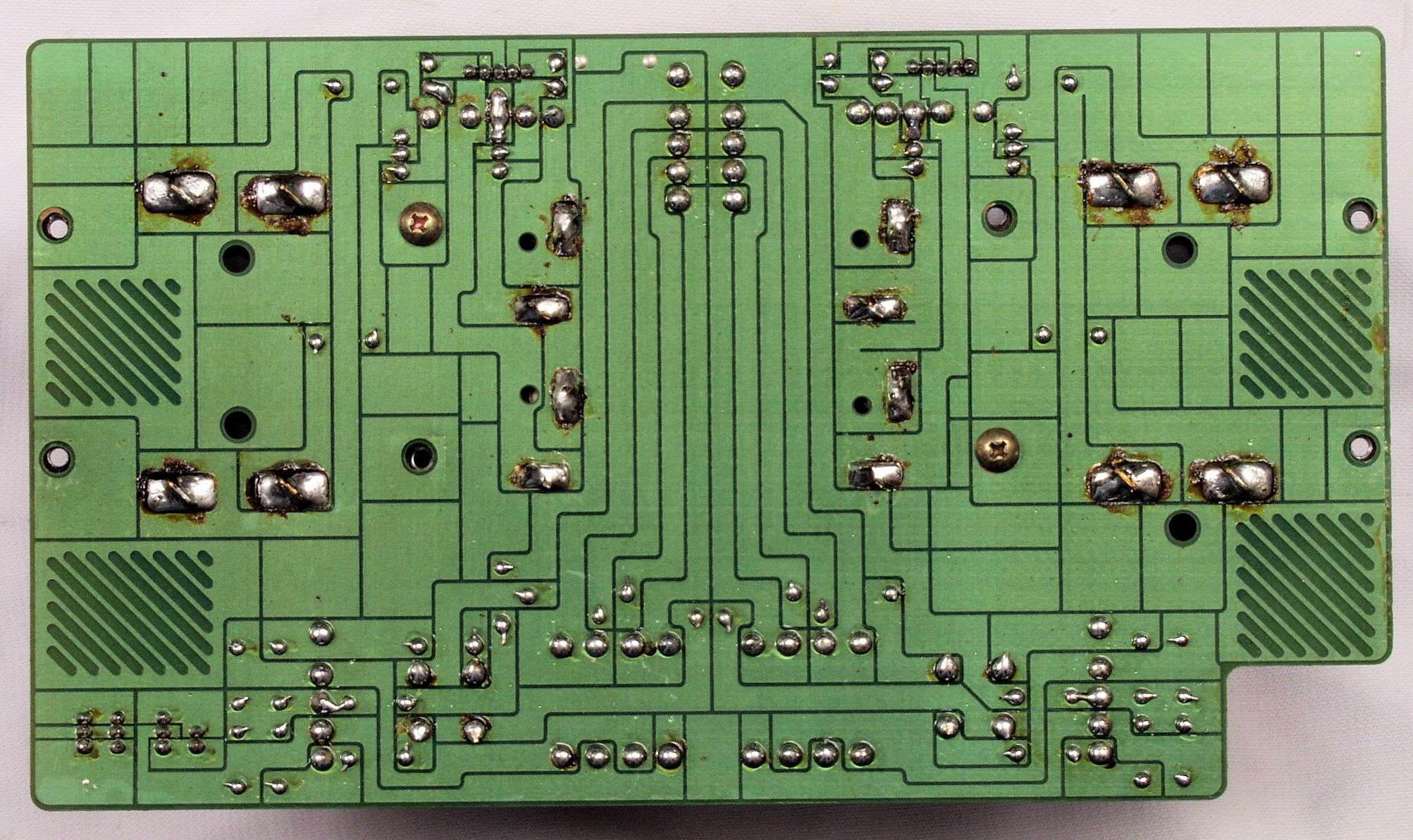 C24. 修理(半田補正)後 終段・プロテクト基板裏。 半田を全部やり直す。