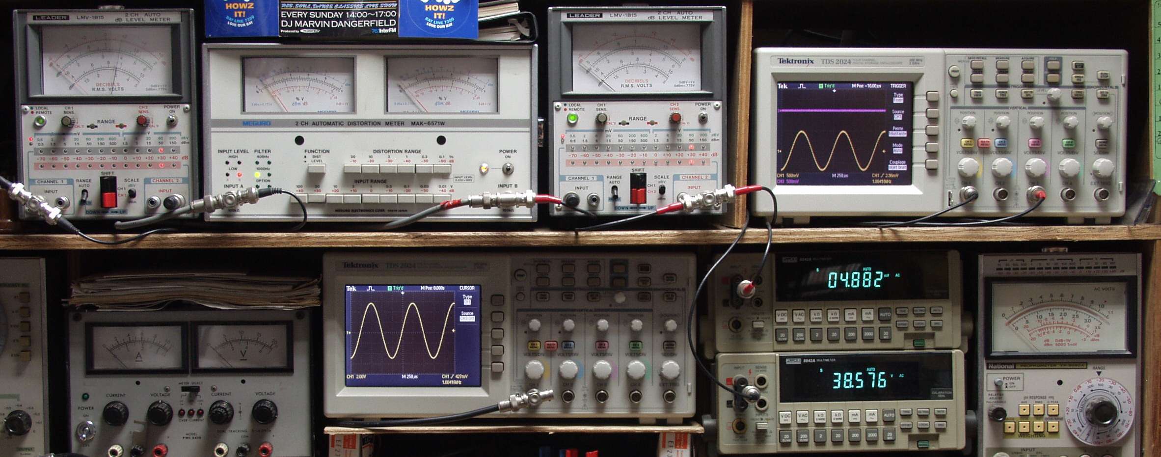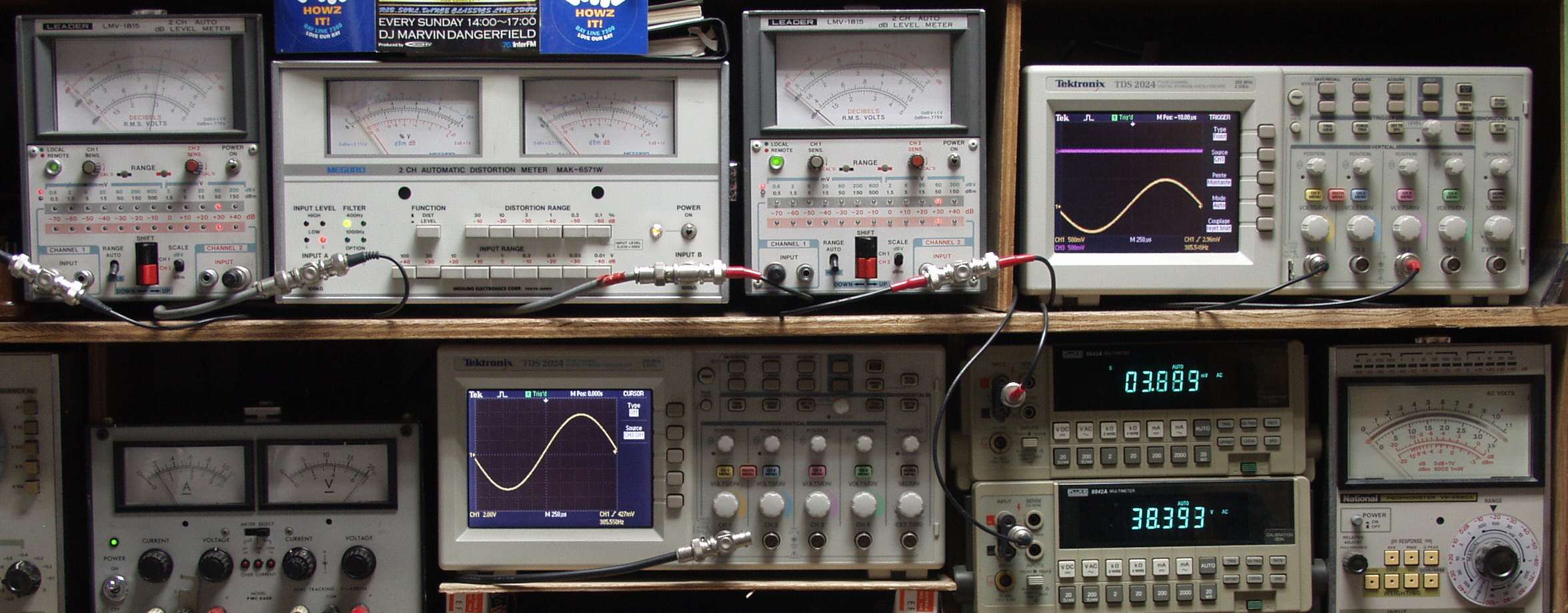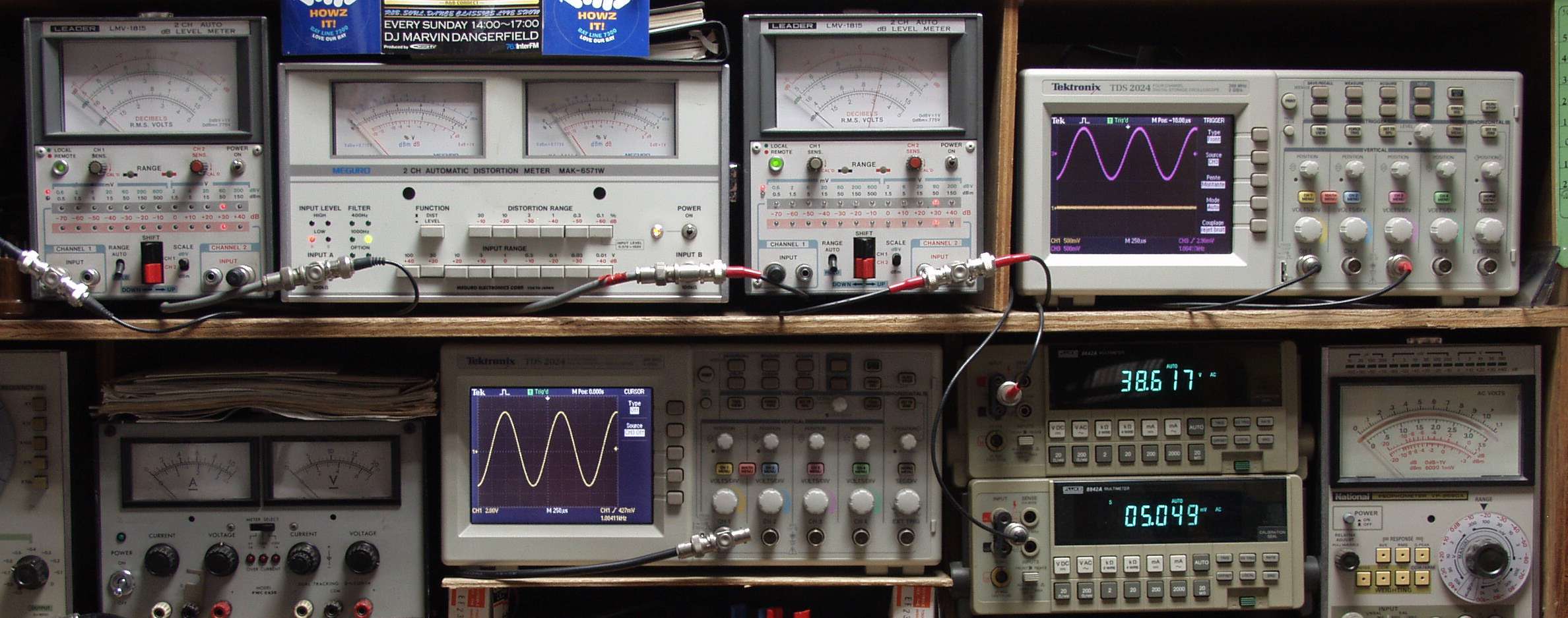 上段中左 歪み率計=出力の歪み率測定 左メータ=L出力、右メータ=R出力