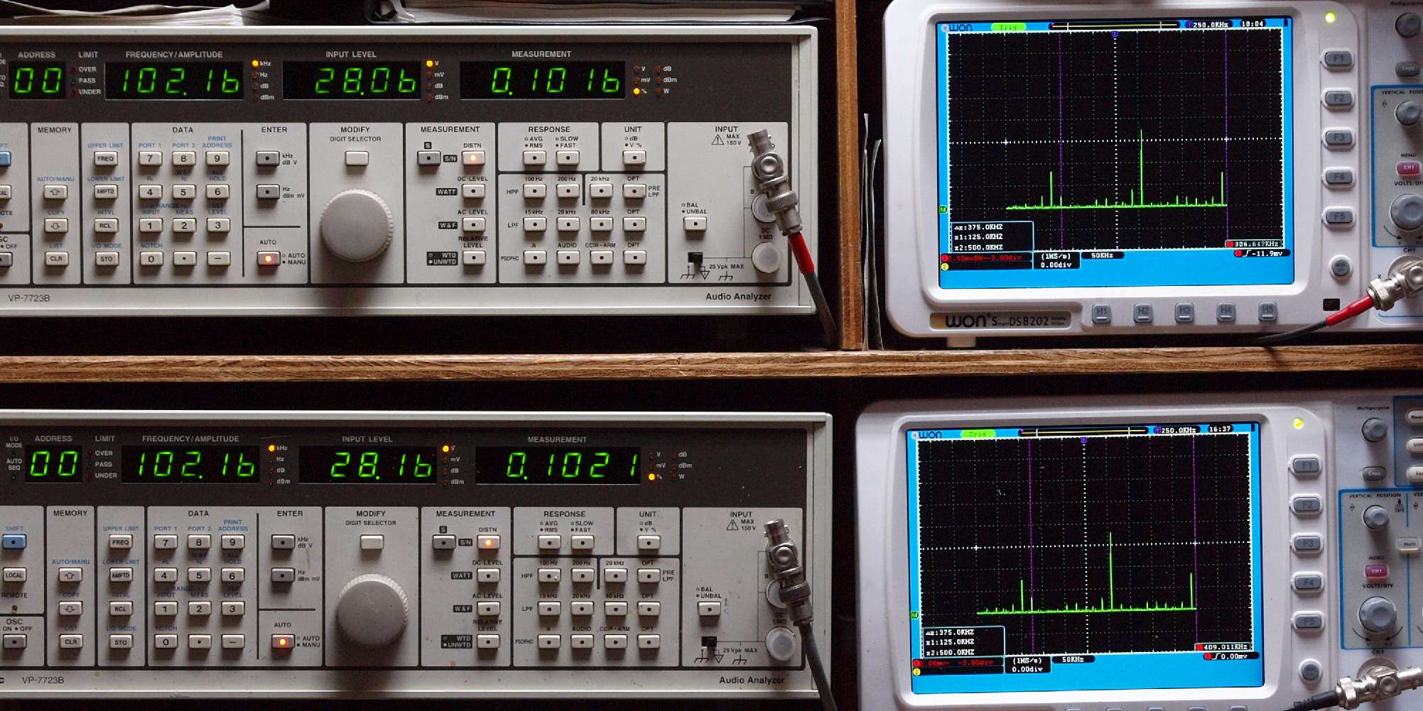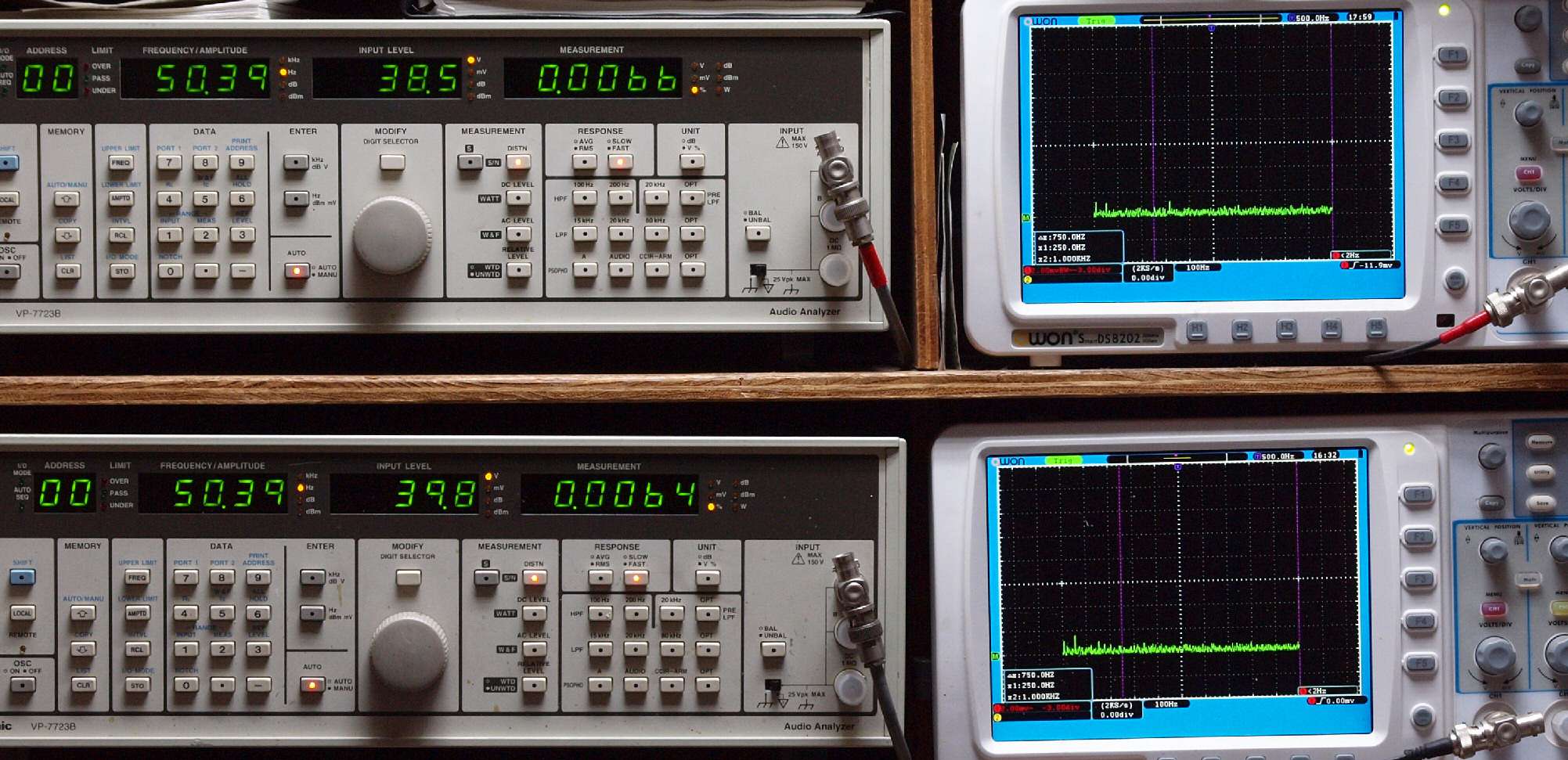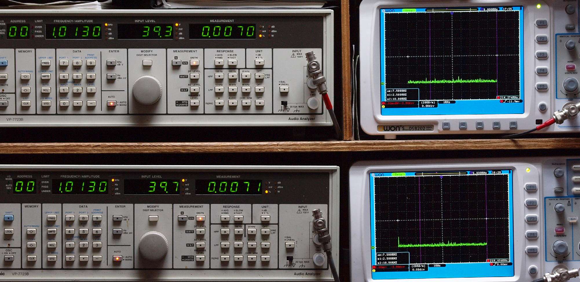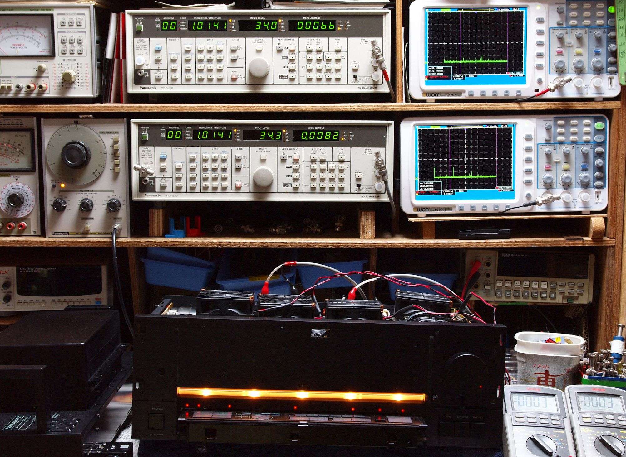| E. 測定・調整。 画像をクリックすると、大きく(横幅2050ドット)表示されます。 E1. 出力・歪み率測定・調整 「見方」。 上段中 右側SP出力を「Audio Analyzer Panasonic VP−7723B」により測定。 表示LED、 左端=メモリーNo、 中左=周波数測定、 中右=出力電圧測定、 右端=歪み率測定。 上段右端 VP−7723Bの基本波除去出力を「owon SDS8202(200MHZ)」で「FFT分析」表示。 下段中 左側SP出力を「Audio Analyzer Panasonic VP−7723B」により測定。 表示LED、 左端=メモリーNo、 中左=周波数測定、 中右=出力電圧測定、 右端=歪み率測定。 下段右端 VP−7723Bの基本波除去出力を「owon SDS6062(200MHZ)」で「FFT分析」表示。 下段左端 オーディオ発振器 VP−7201A より50Hz〜100kHzの信号を出し(歪み率=約0.003%)、ATT+分配器を通し、AMPに入力。 よって、ダイアル設定出力レベルより低くなります。測定機器の仕様や整備の様子はこちら、「VP−7723B」「VP−7201A」。 FFT画面の見方はこちら。 |