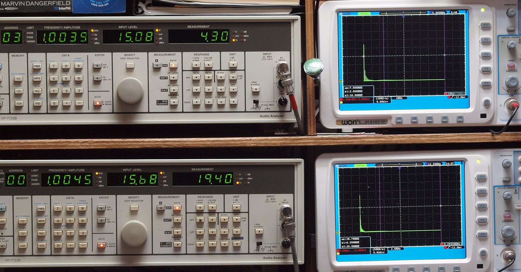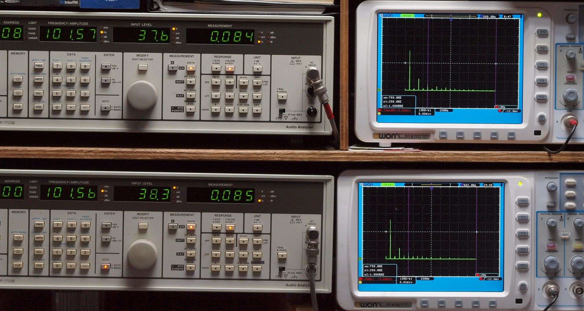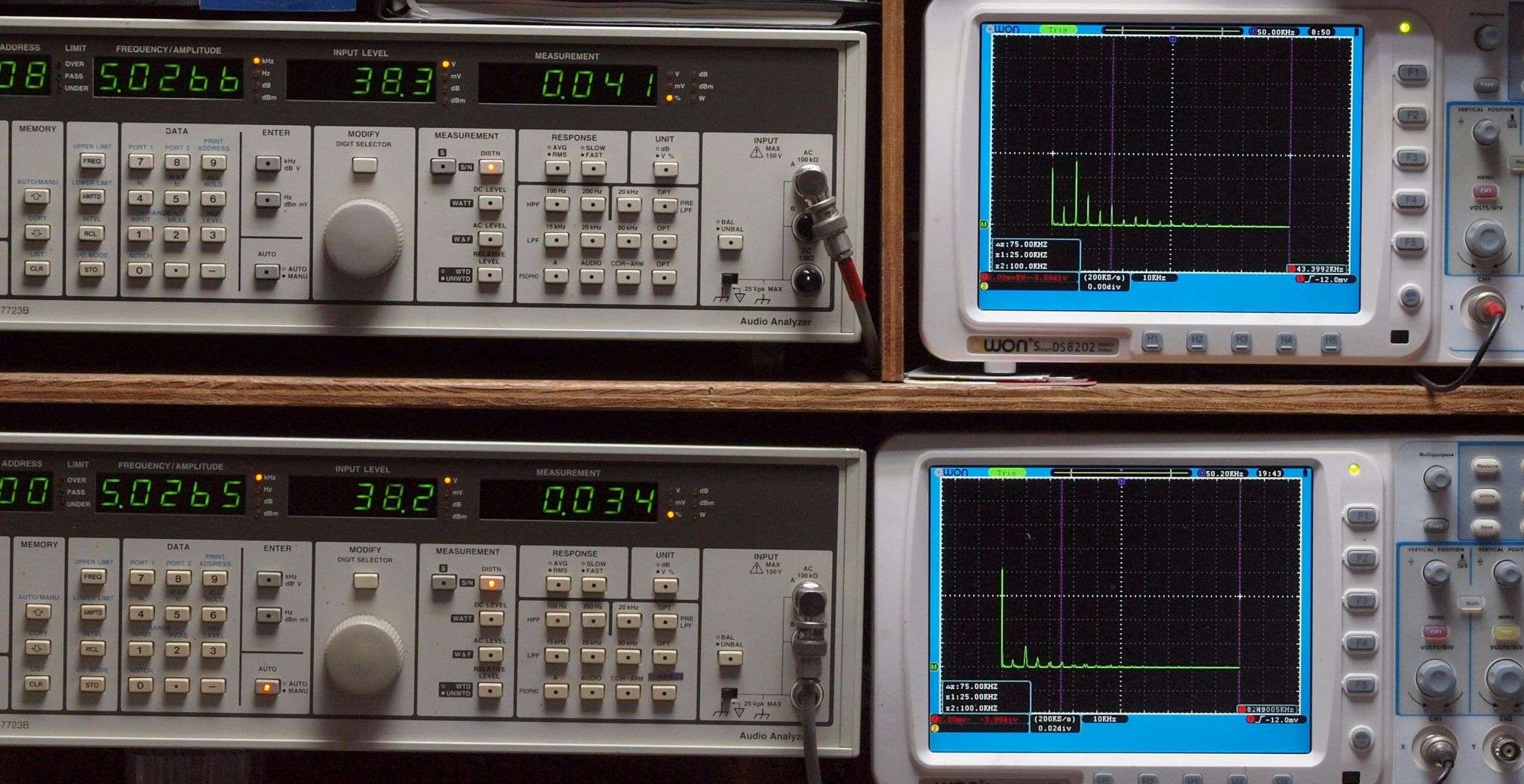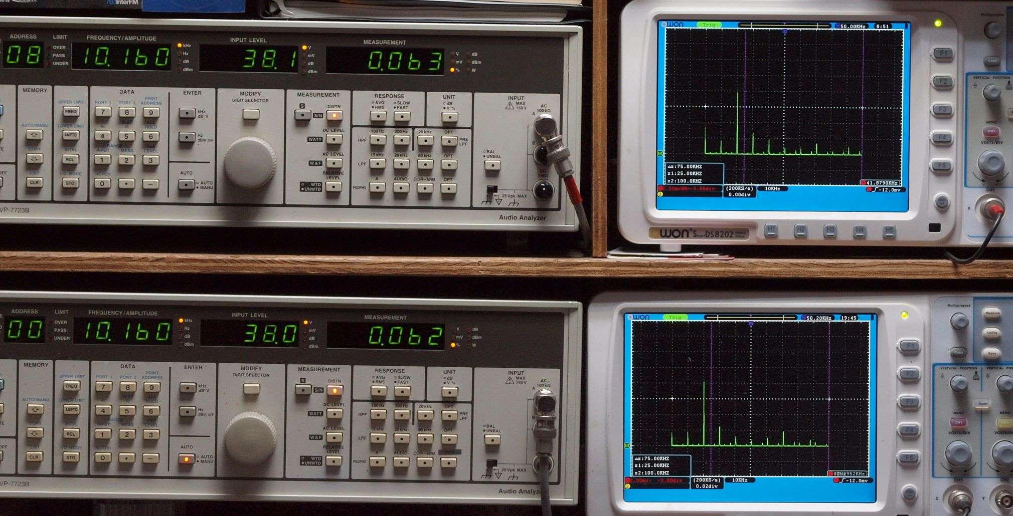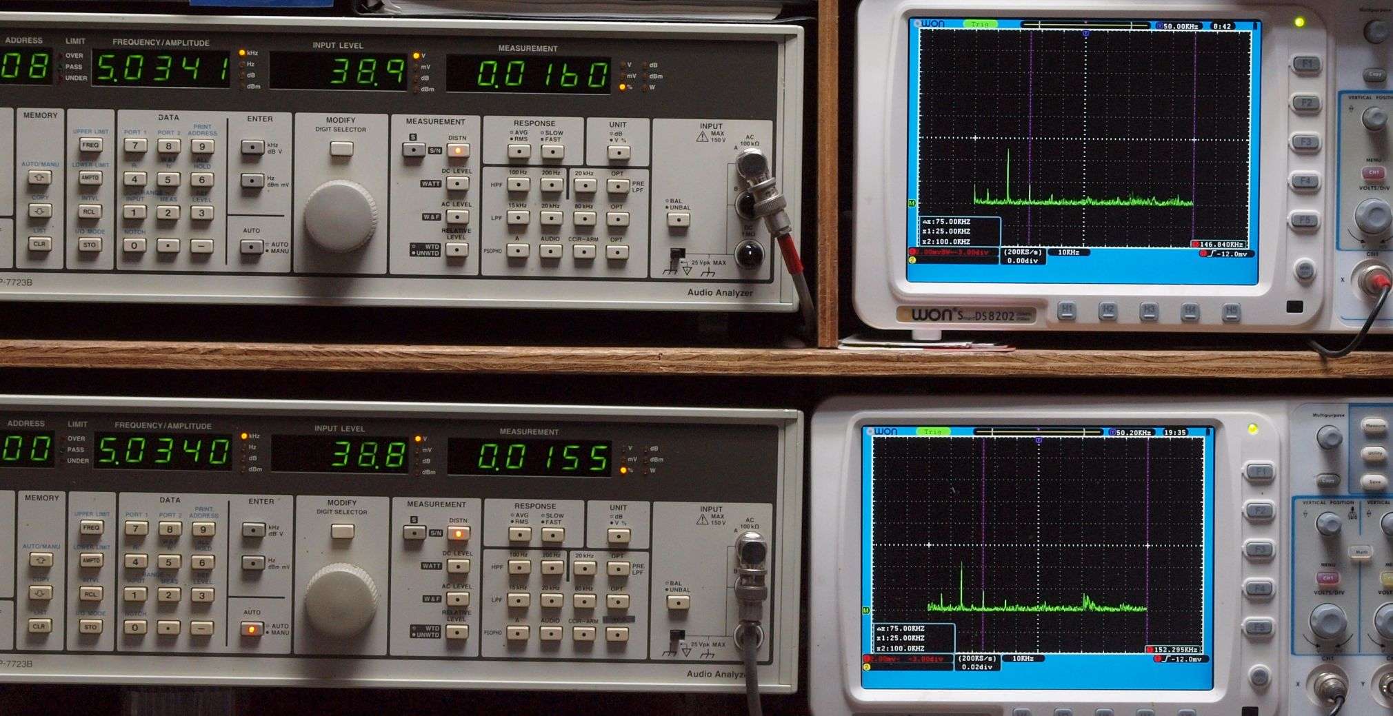 上段右端 VP−7723Bの基本波除去出力を「owon SDS8202(200MHZ)」で「FFT分析」表示。