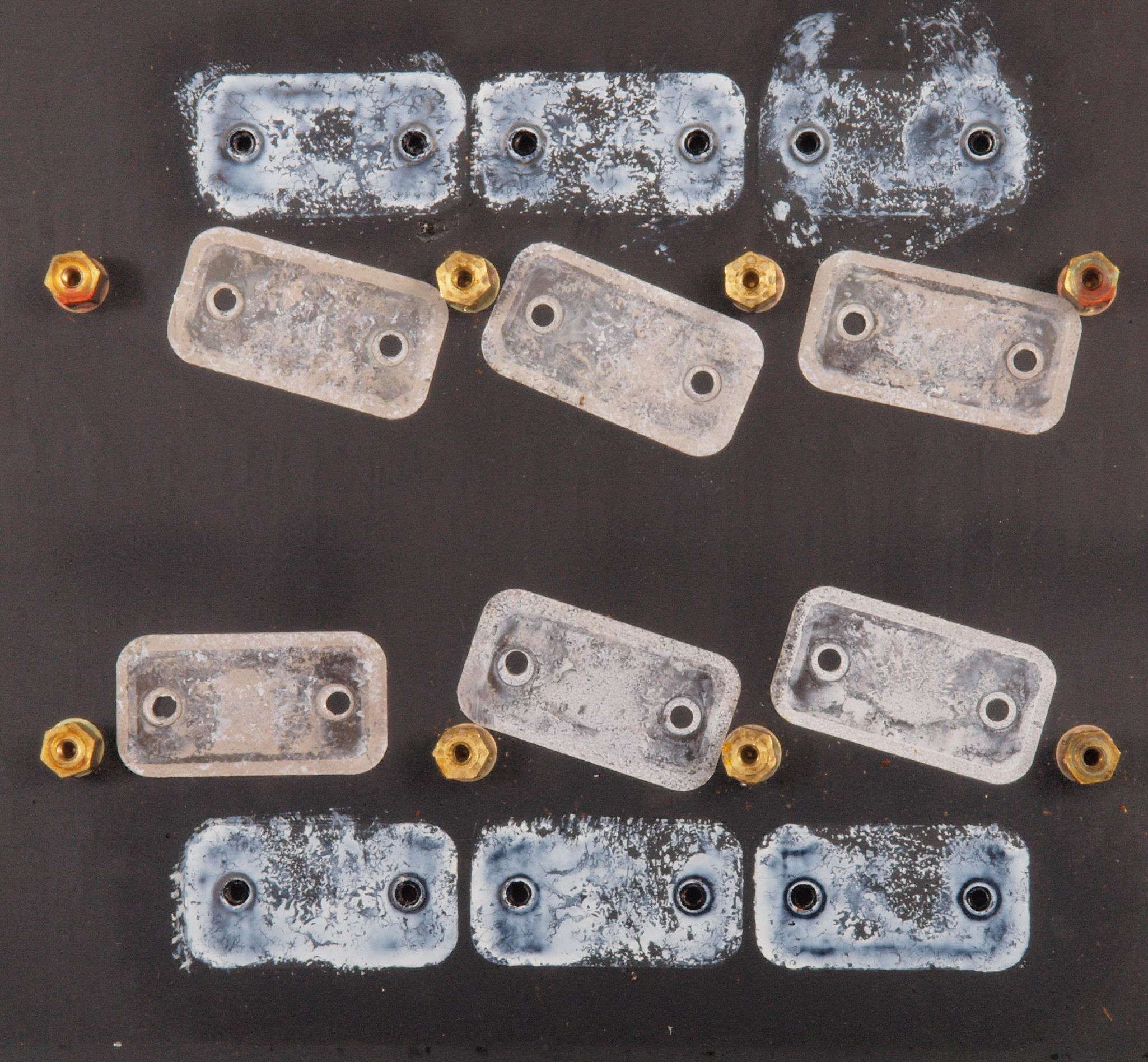 | C213. 修理中 −側終段基板。 終段TR(トランジスター)のマイカー板に放熱シリコンを塗布。 1部終段TR(トランジスター)は未塗布。 |