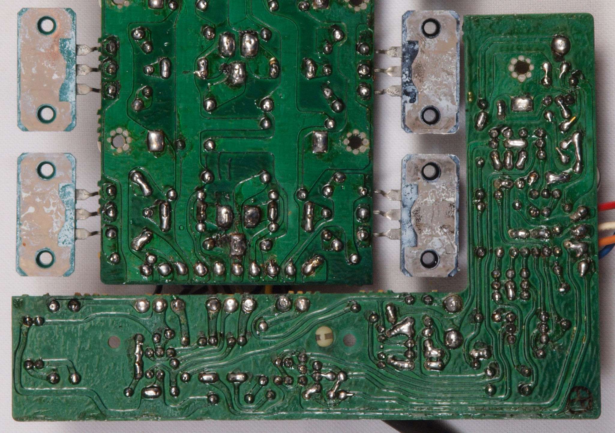 | C732. 修理中 −側バッファー・ドライブ基板裏。 定電圧TR(トランジスター)の足の銅箔を広げる。 | ||||||||||||||||||||||||||||||||||||||