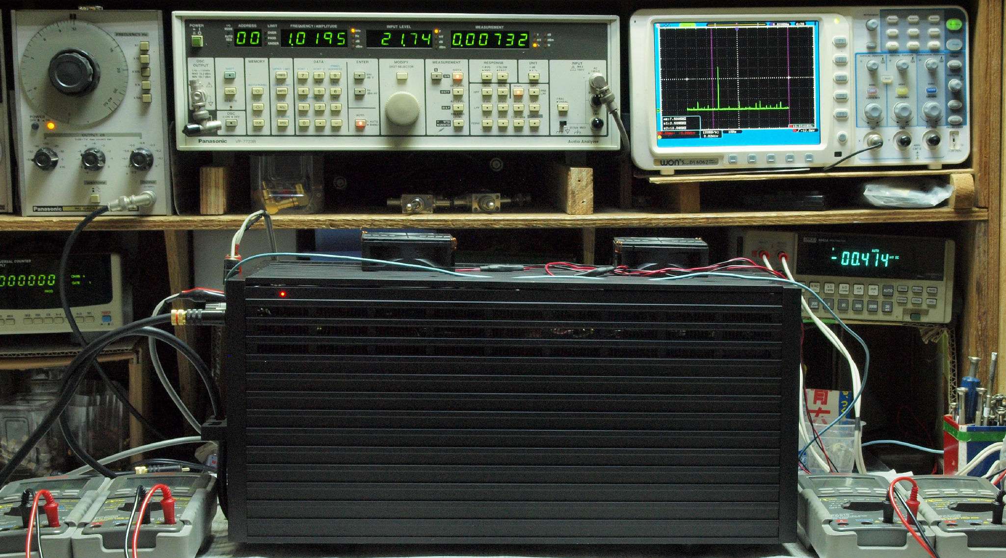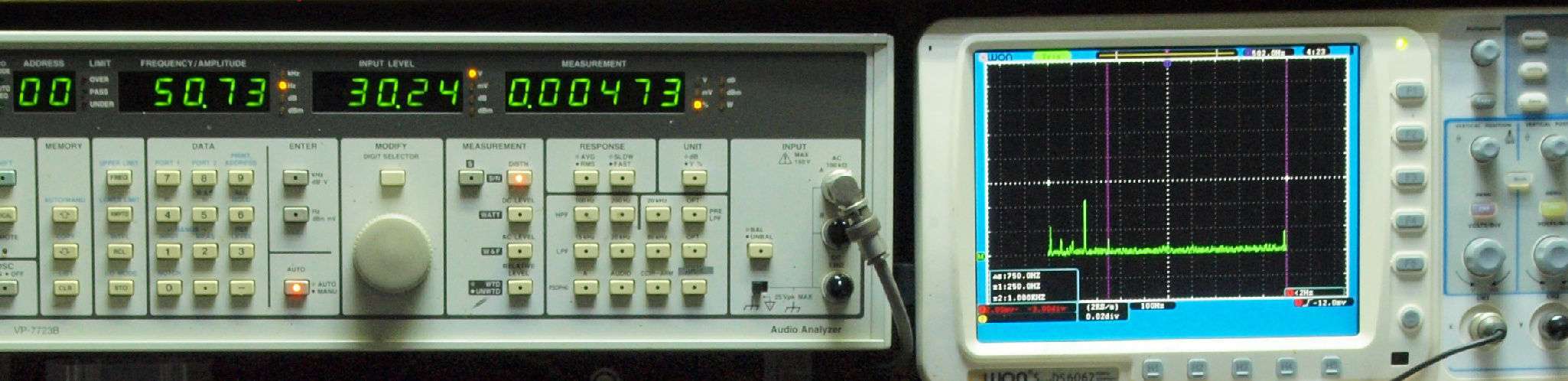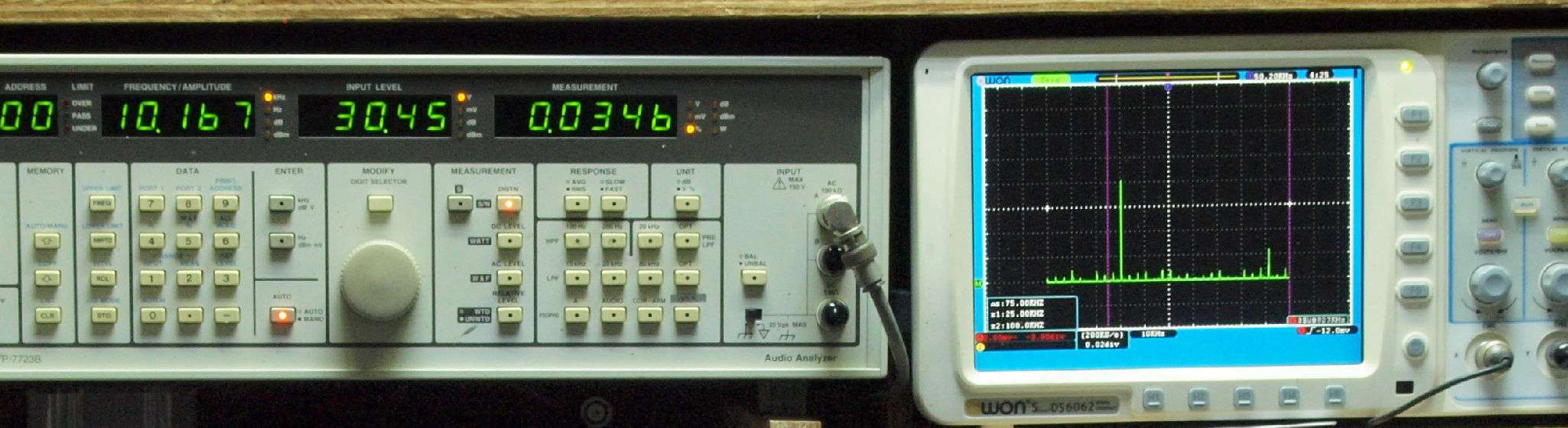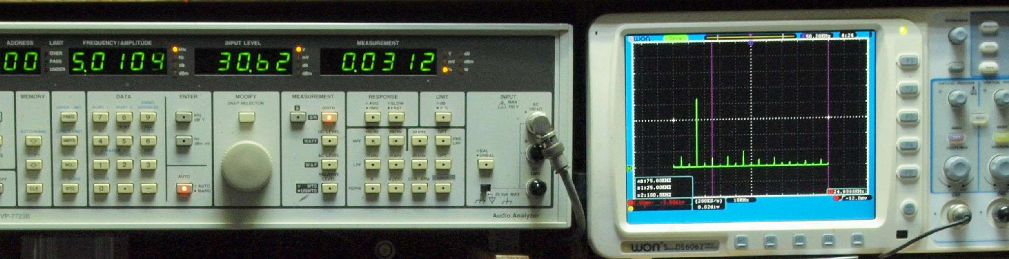 | E. 測定・調整。 画像をクリックすると、大きく(横幅2050ドット)表示されます。 E0. 出力・歪み率測定・調整 「見方」。 中=SP出力を「Audio Analyzer Panasonic VP−7723B」により測定。 表示LED、 左端=メモリーNo、 中左=周波数測定、 中右=出力電圧測定、 右端=歪み率測定。 右端=VP−7723Bの基本波除去出力を「owon SDS8202(200MHZ)」で「FFT分析」表示。 左端=オーディオ発振器 VP−7201A より50Hz〜100kHzの信号を出し(歪み率=約0.003%)、ATT+分配器を通し、AMPに入力。 よって、ダイアル設定出力レベルより低くなります。測定機器の仕様や整備の様子はこちら、「VP−7723B」「VP−7201A」。 FFT画面の見方はこちら。 |