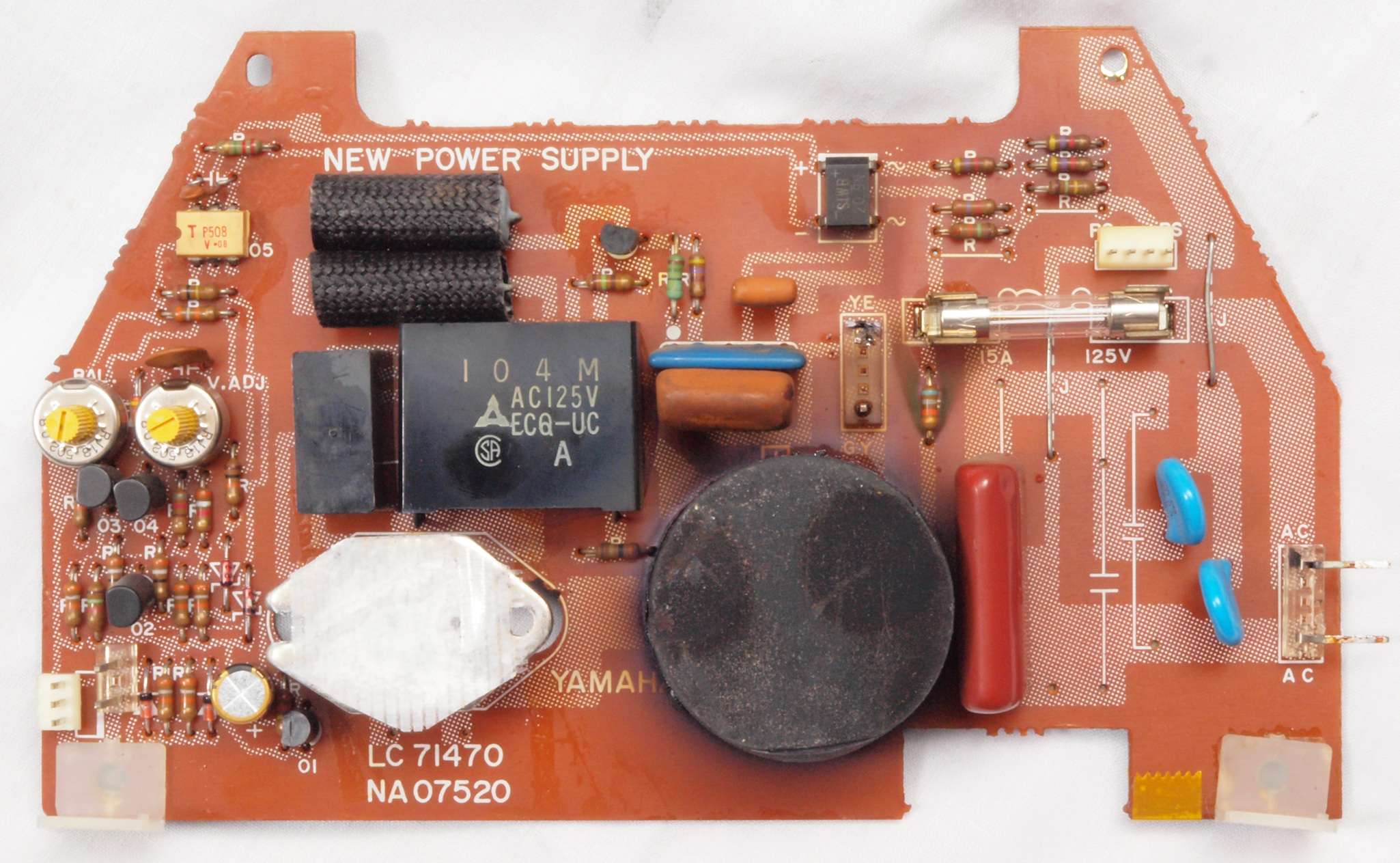 C12. 修理後 電源基板。半固定VR2個、電解コンデンサー1個交換。