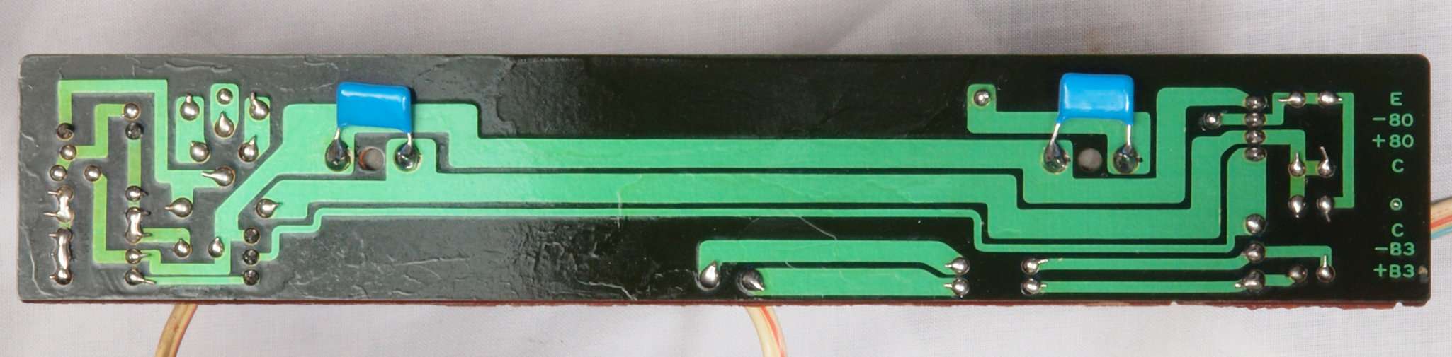 C33. 修理(半田補正)後 電解コンデンサー基板2裏、半田を全部やり直す。フイルムコンデンサー2個追加。