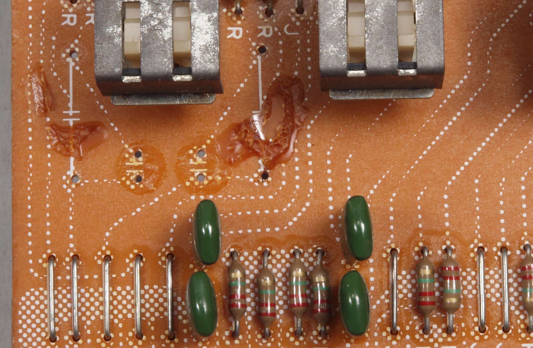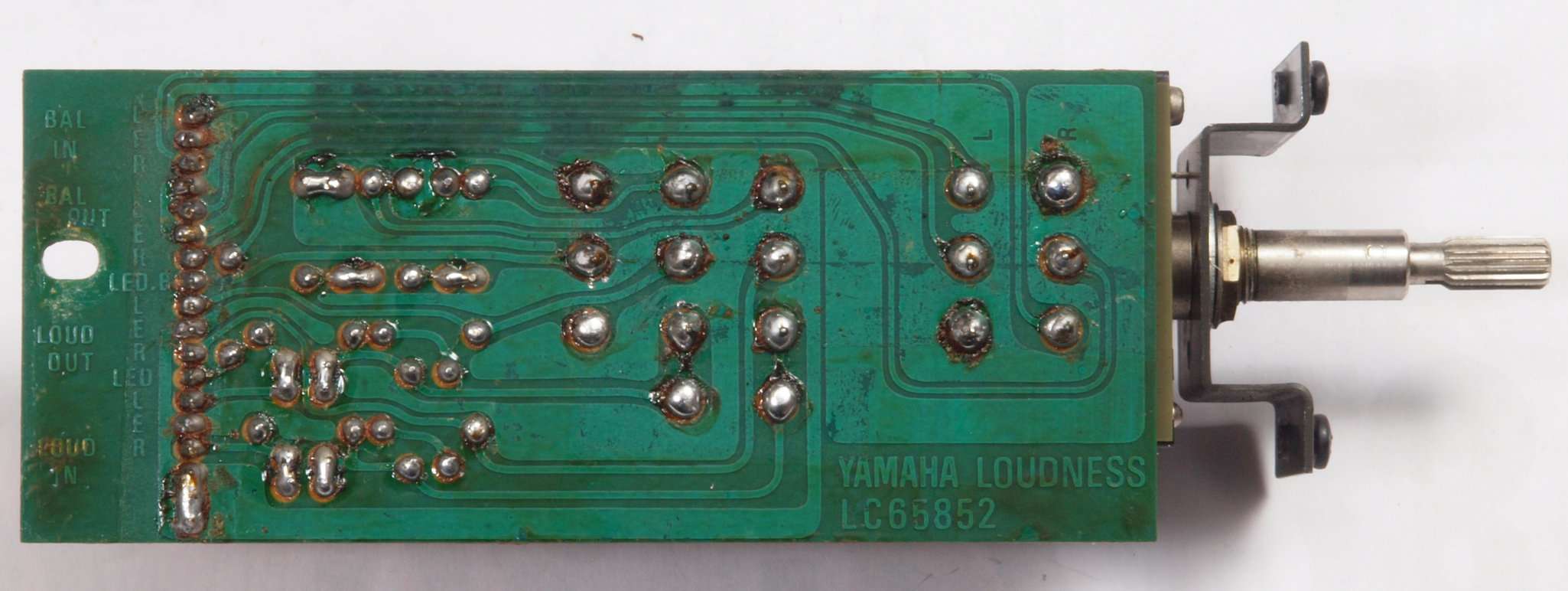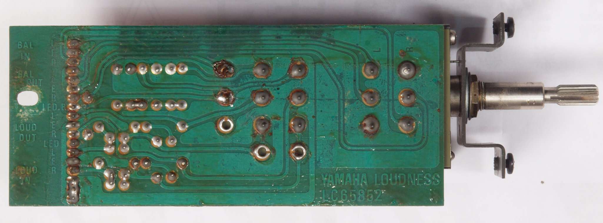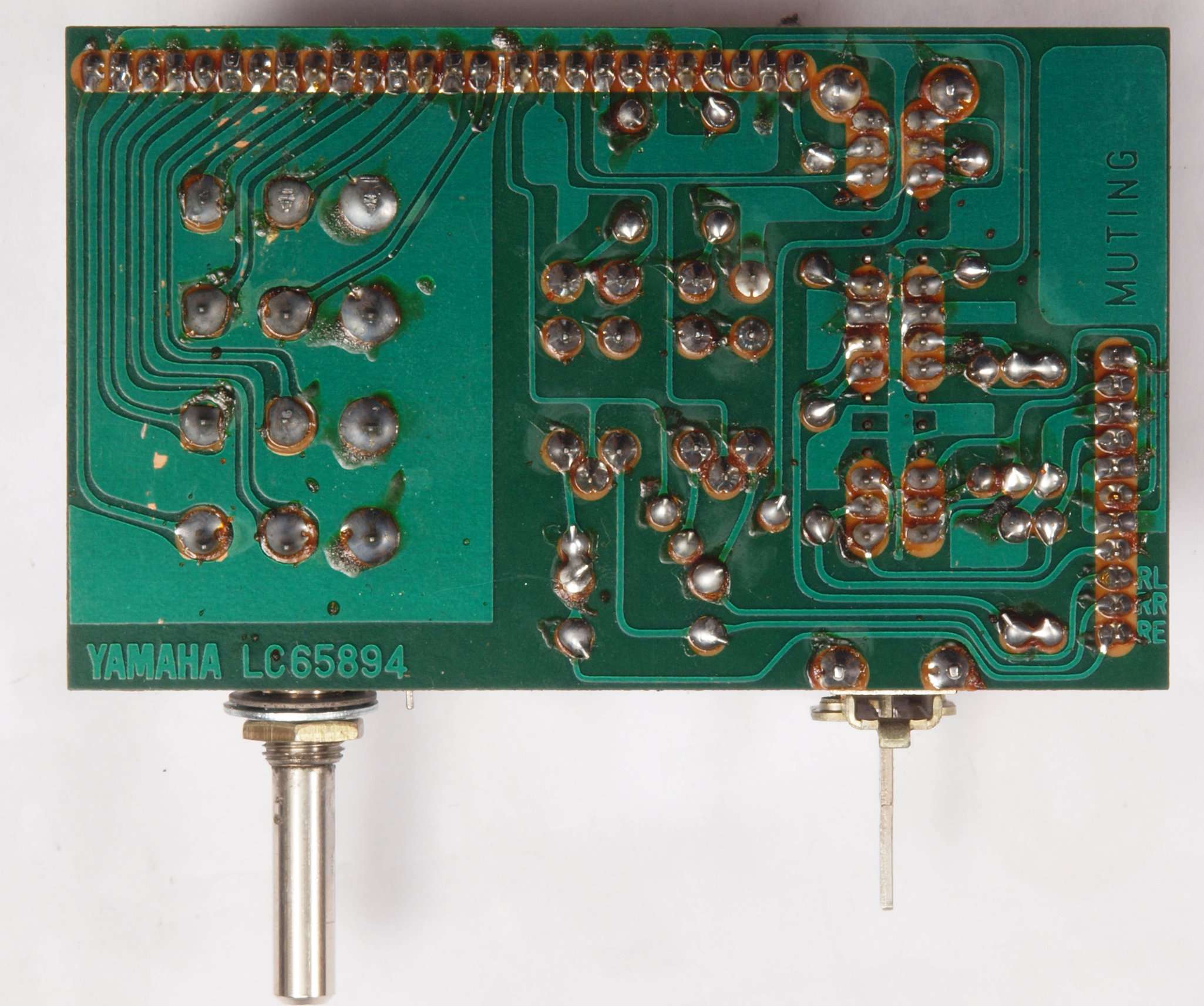 C63.修理前 LoudnessAMP基板裏、強力な接点復活材使用で、基板の銅箔に腐食が見られます。