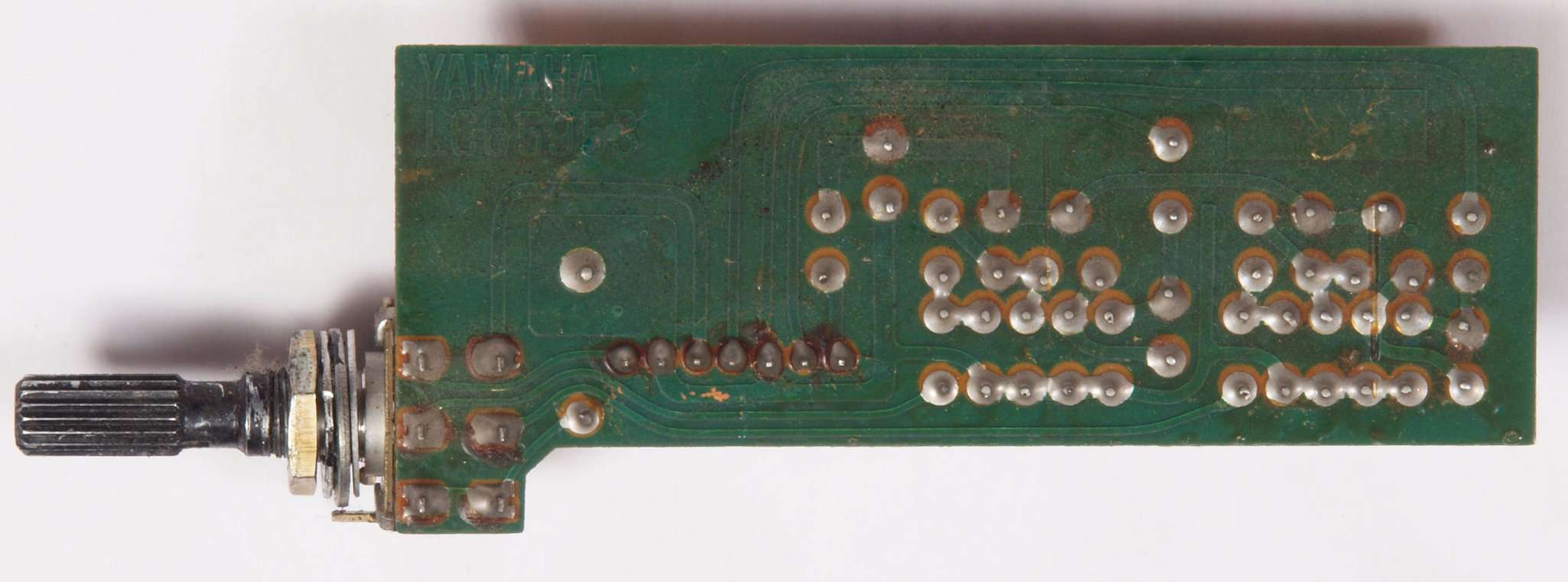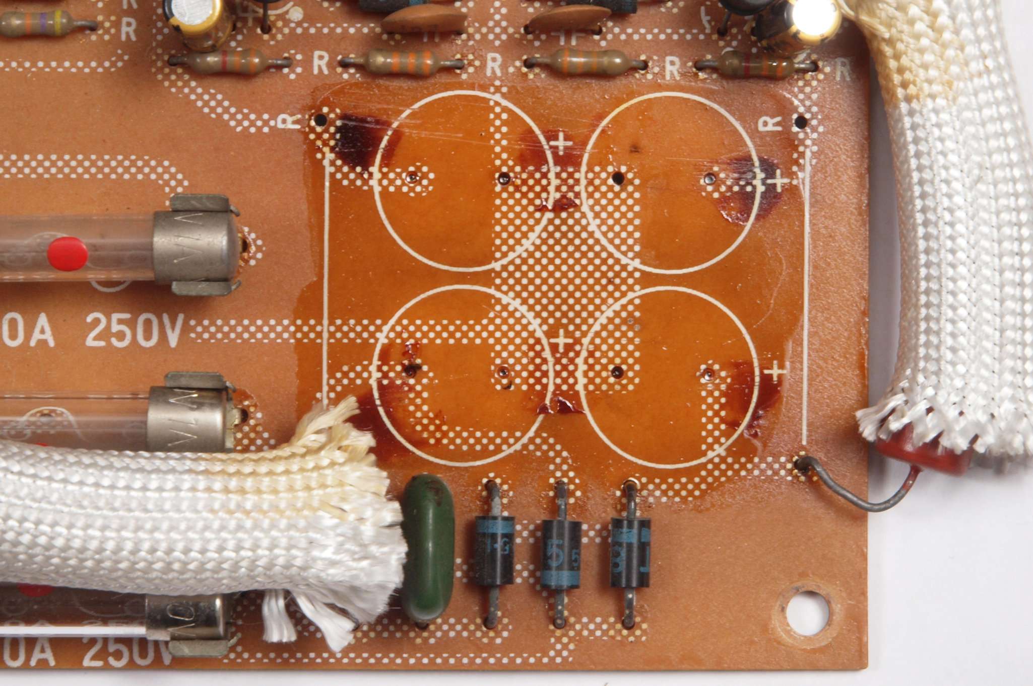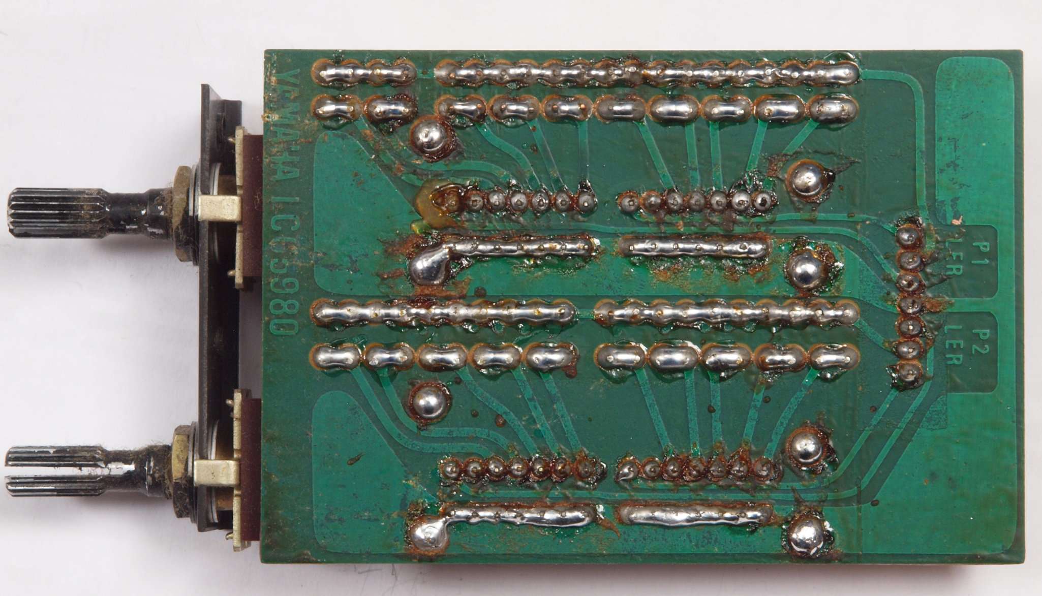 C63.修理前 LoudnessAMP基板裏、強力な接点復活材使用で、基板の銅箔に腐食が見られます。