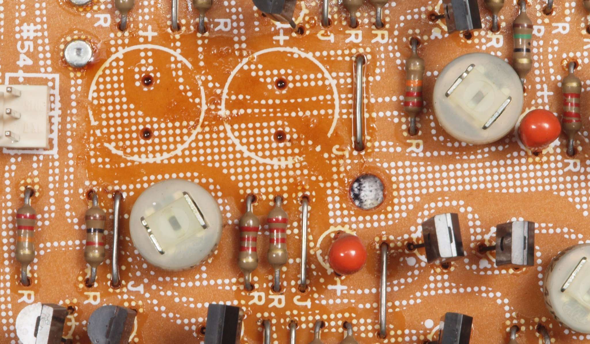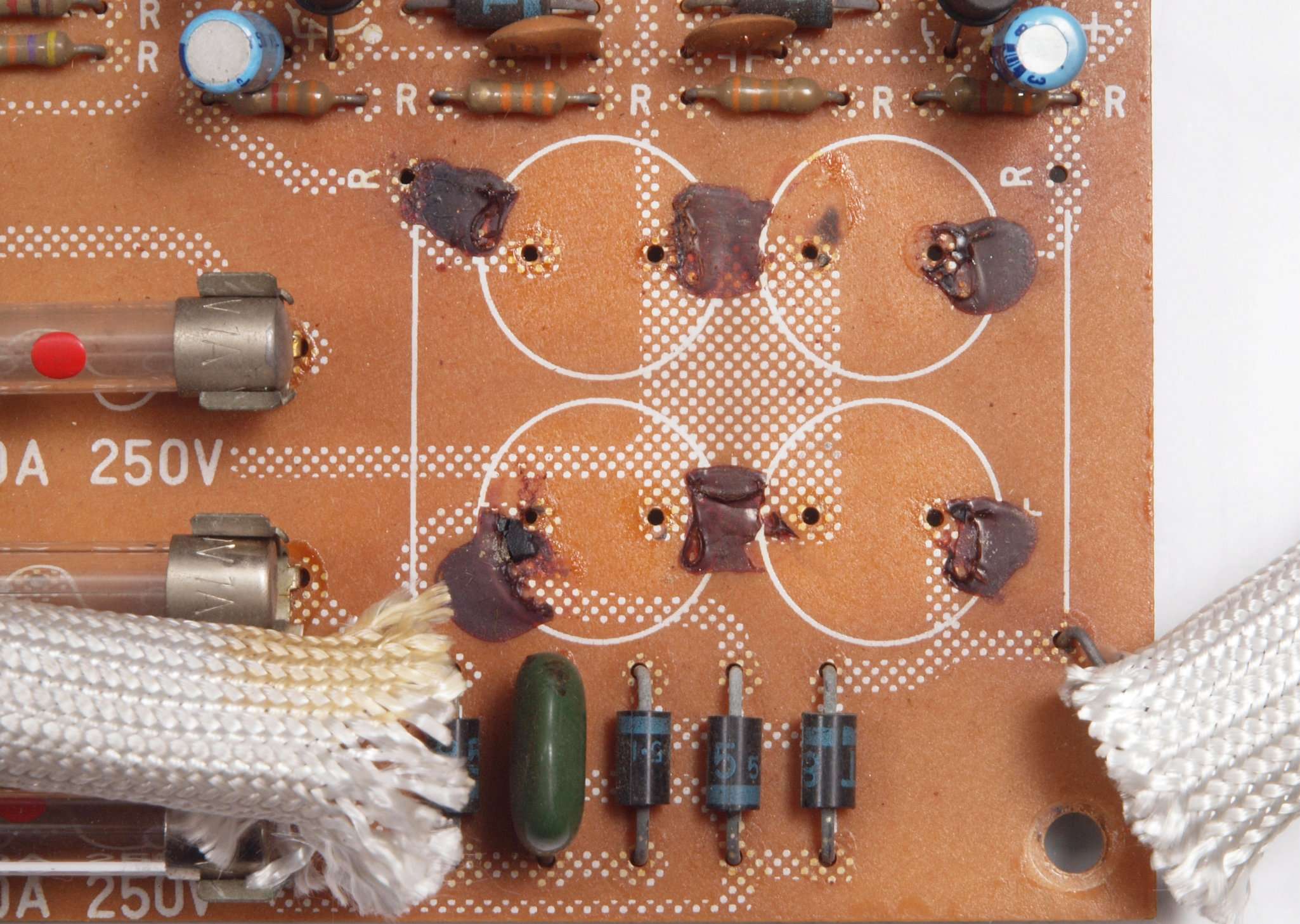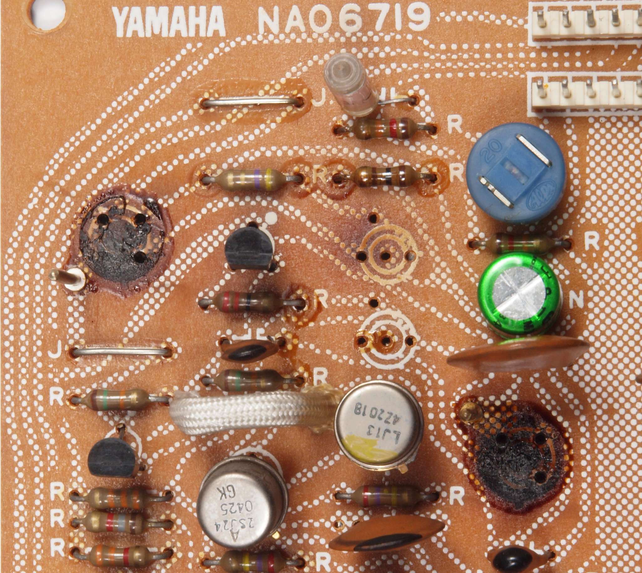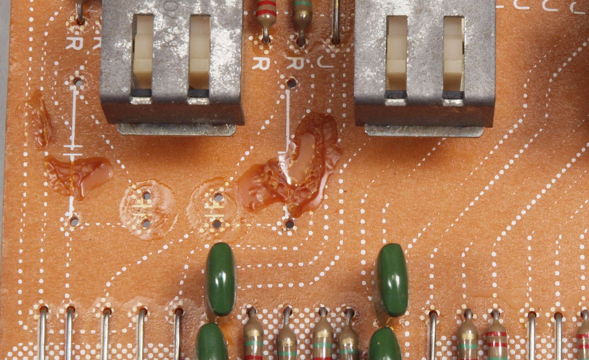 C63.修理前 LoudnessAMP基板裏、強力な接点復活材使用で、基板の銅箔に腐食が見られます。