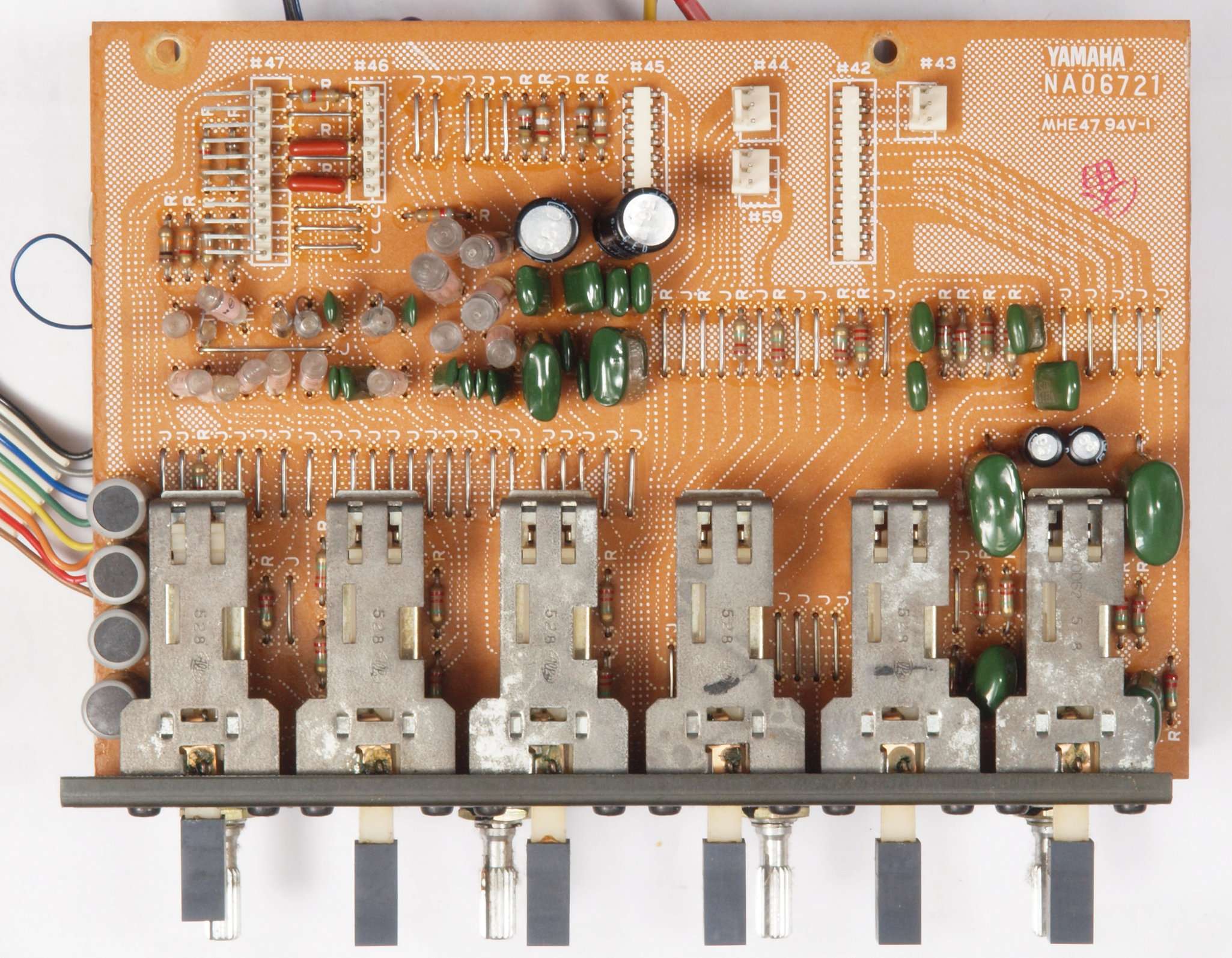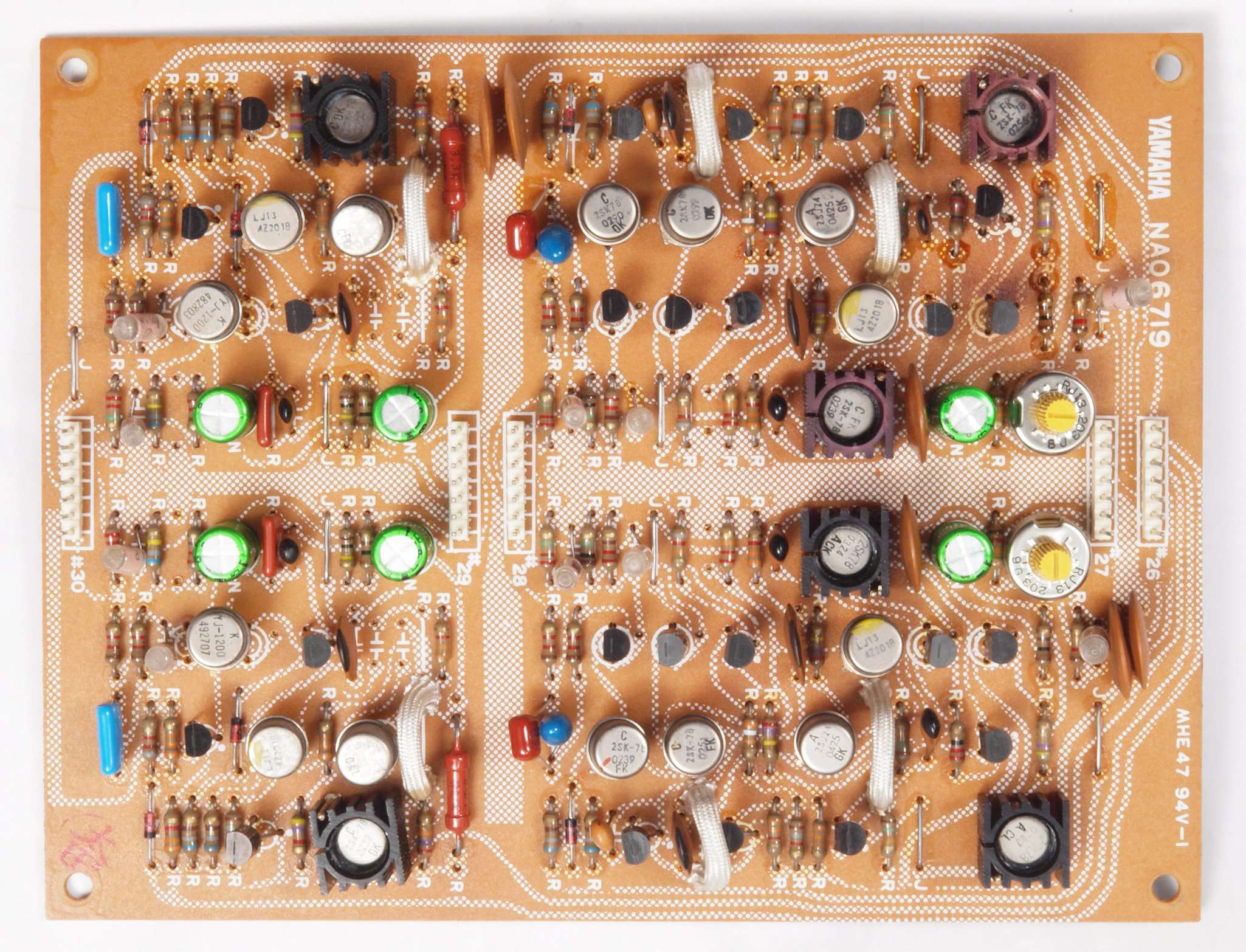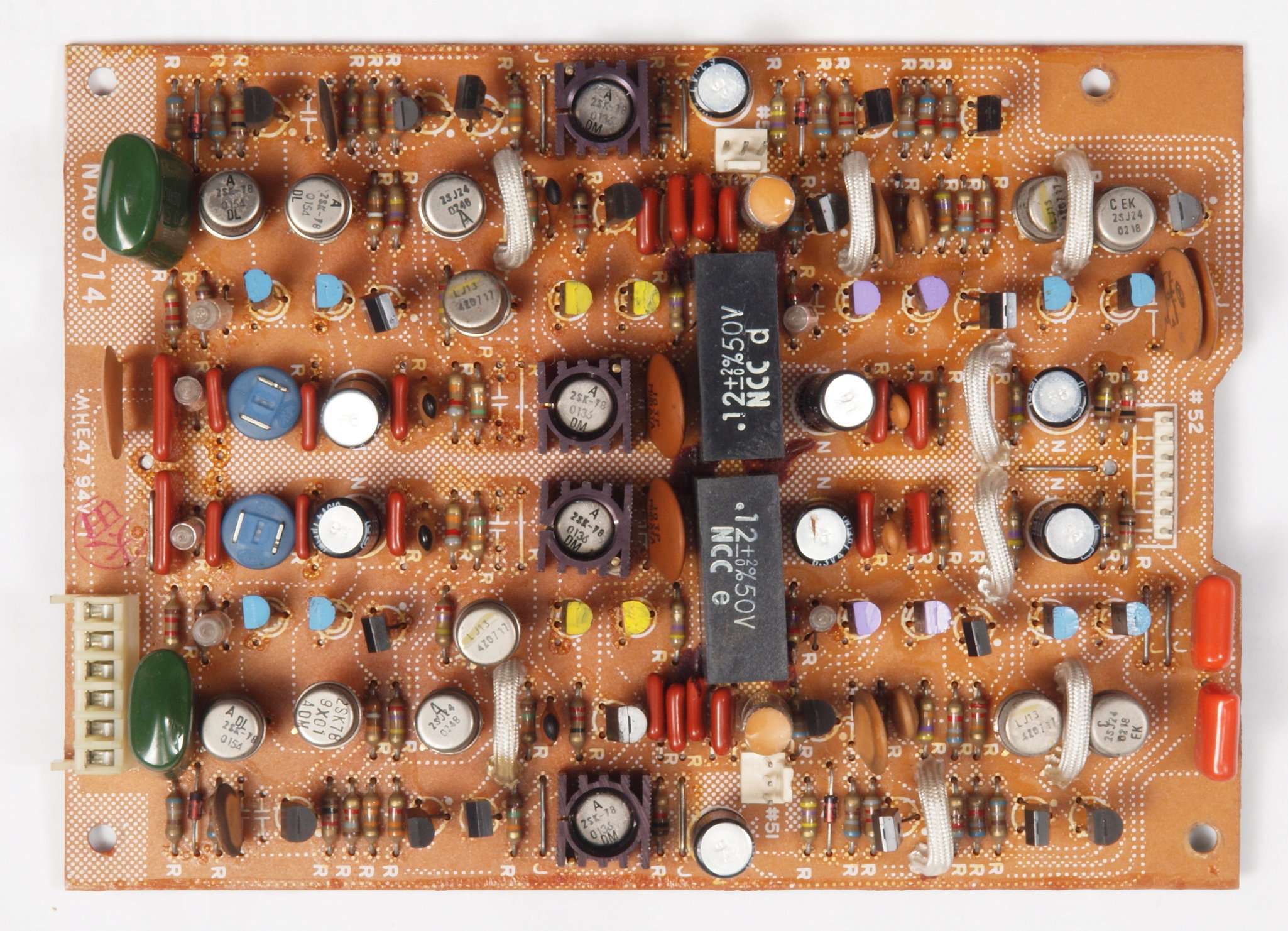 C54.修理後 FlatAMP基板 半固定VR2個、電解コンデンサー15個、フイルムコンデンサー11個、足黒TR(トランジスター)18個交換