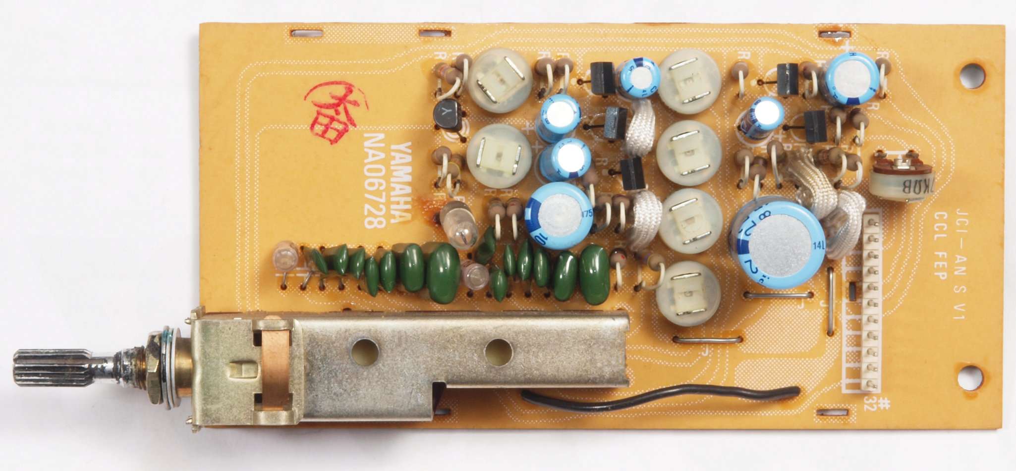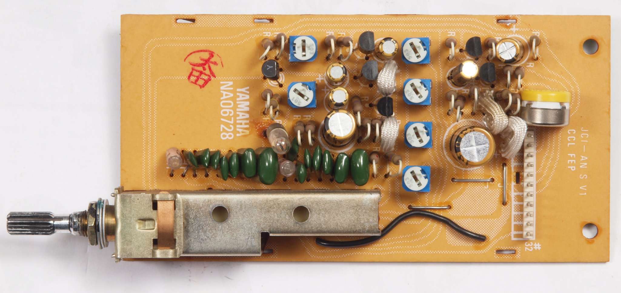 C32.修理後 TapeBufferAMP基板。 電解コンデンサ−2個、V−FET2個、足黒TR(トランジスタ−)6個、フイルムコンデンサー2個交換