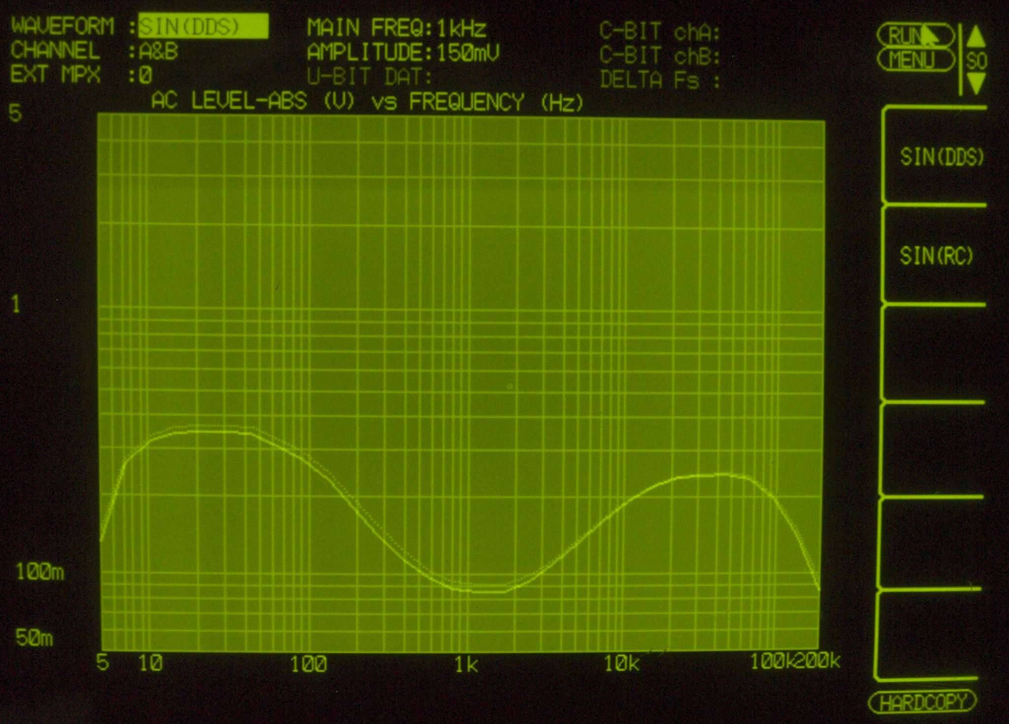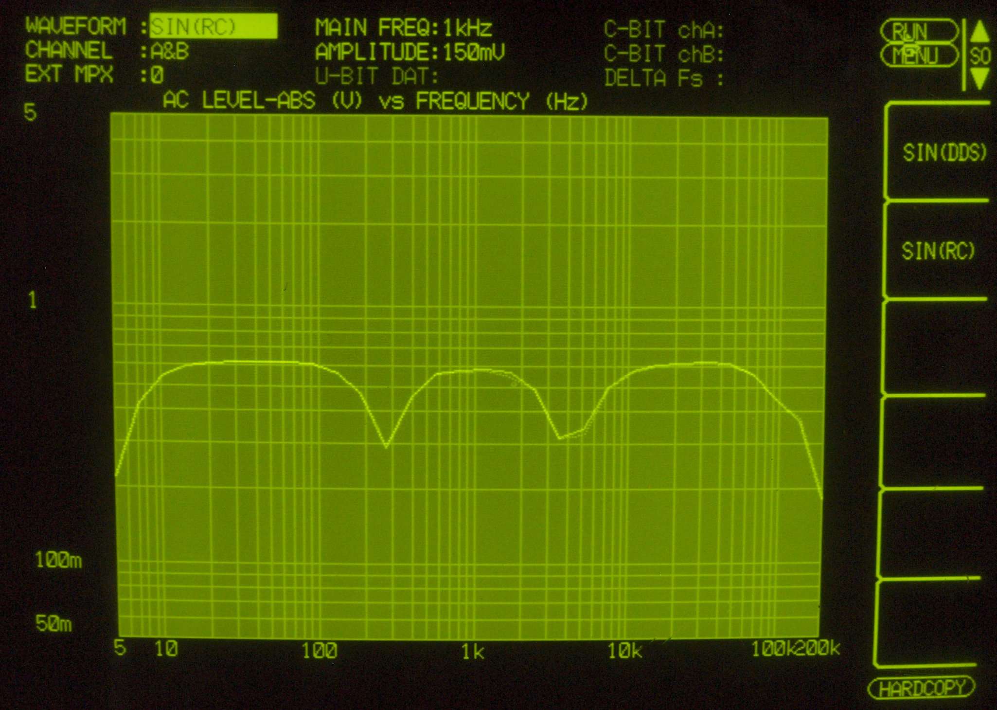 AUX 入力端子へ150mV一定入力 VRはmax 左出力=薄(細い)色 右出力=濃い(太い)色