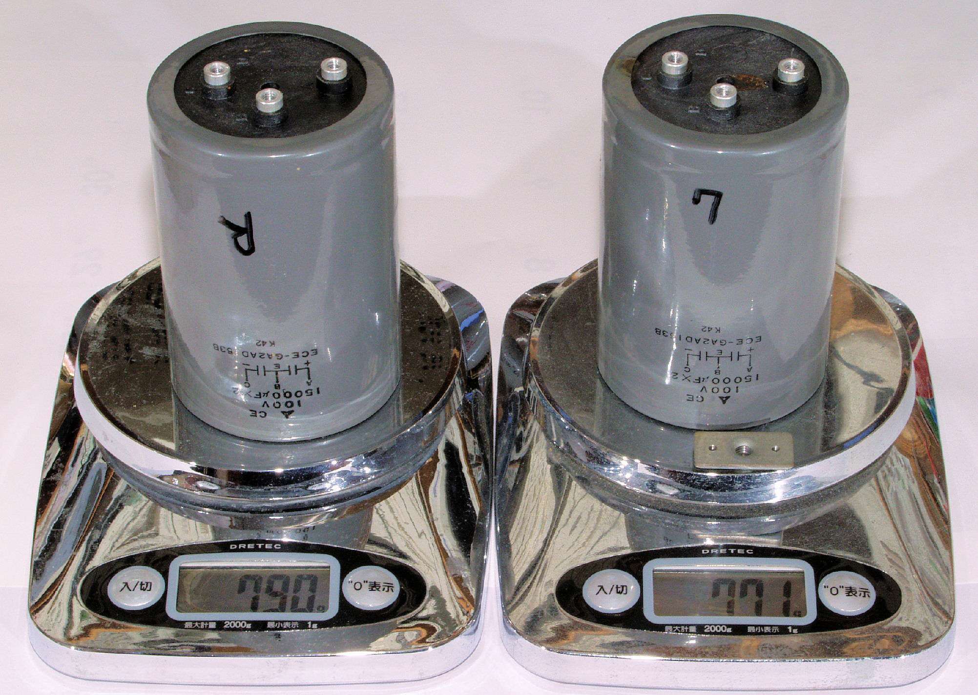 | A21. 重量測定。 右=Panasonic 18000μ/100V。 2本で482g、左=Panasonic 15000μ/100V 2本で375g |