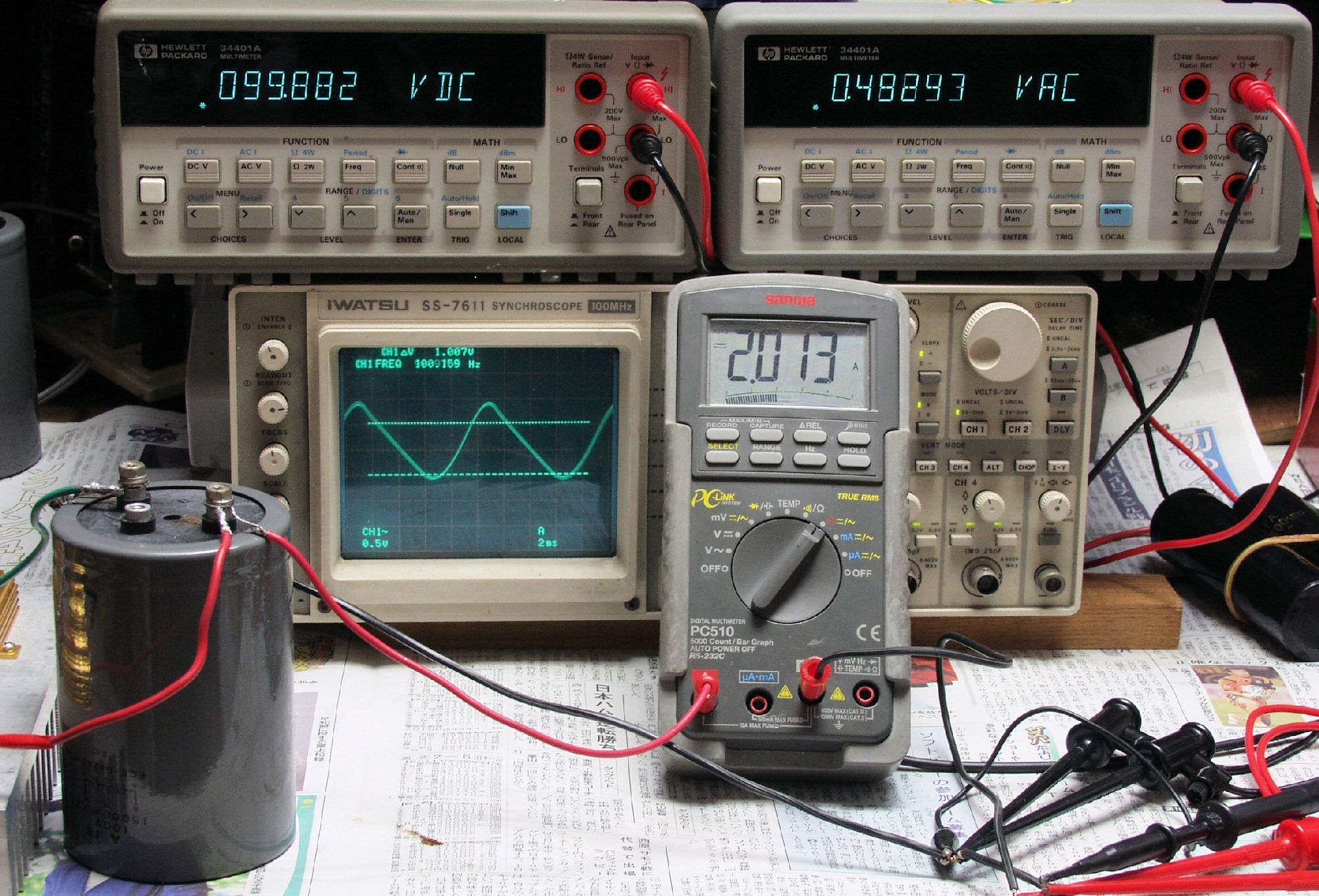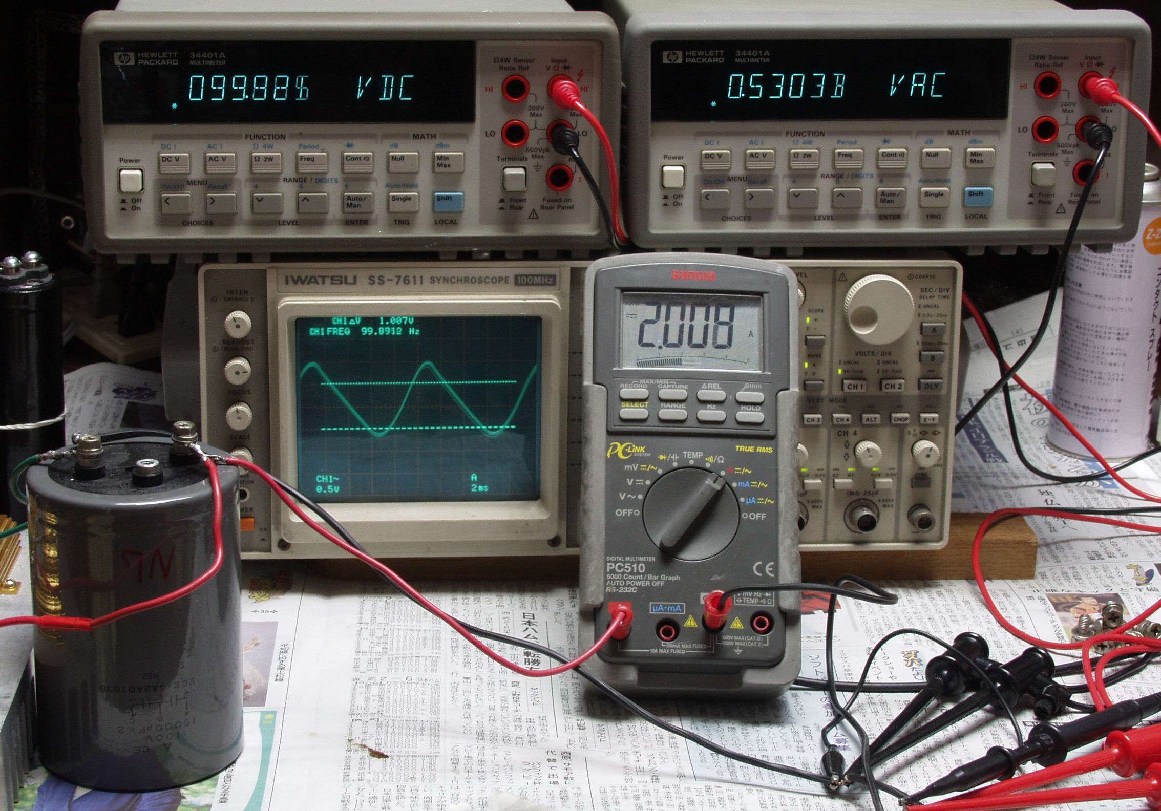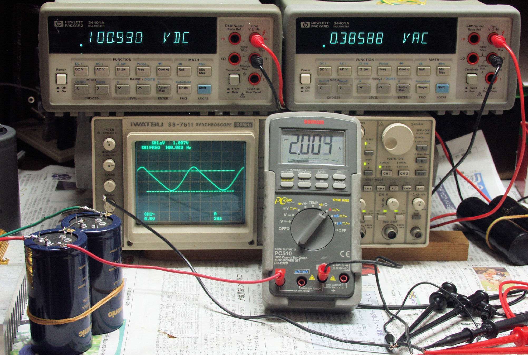 | A2. リップル電圧測定。 B−1の動作を想定し、2本を直列に使用し、100V−2A(200W)の負荷を掛けて測定する。 上左電圧計=負荷に供給するDC100V、上右交流電圧計=リップル電圧(V)。 中オシロ=リップル電圧波形、右電流計=負荷に流れる電流2A。 |