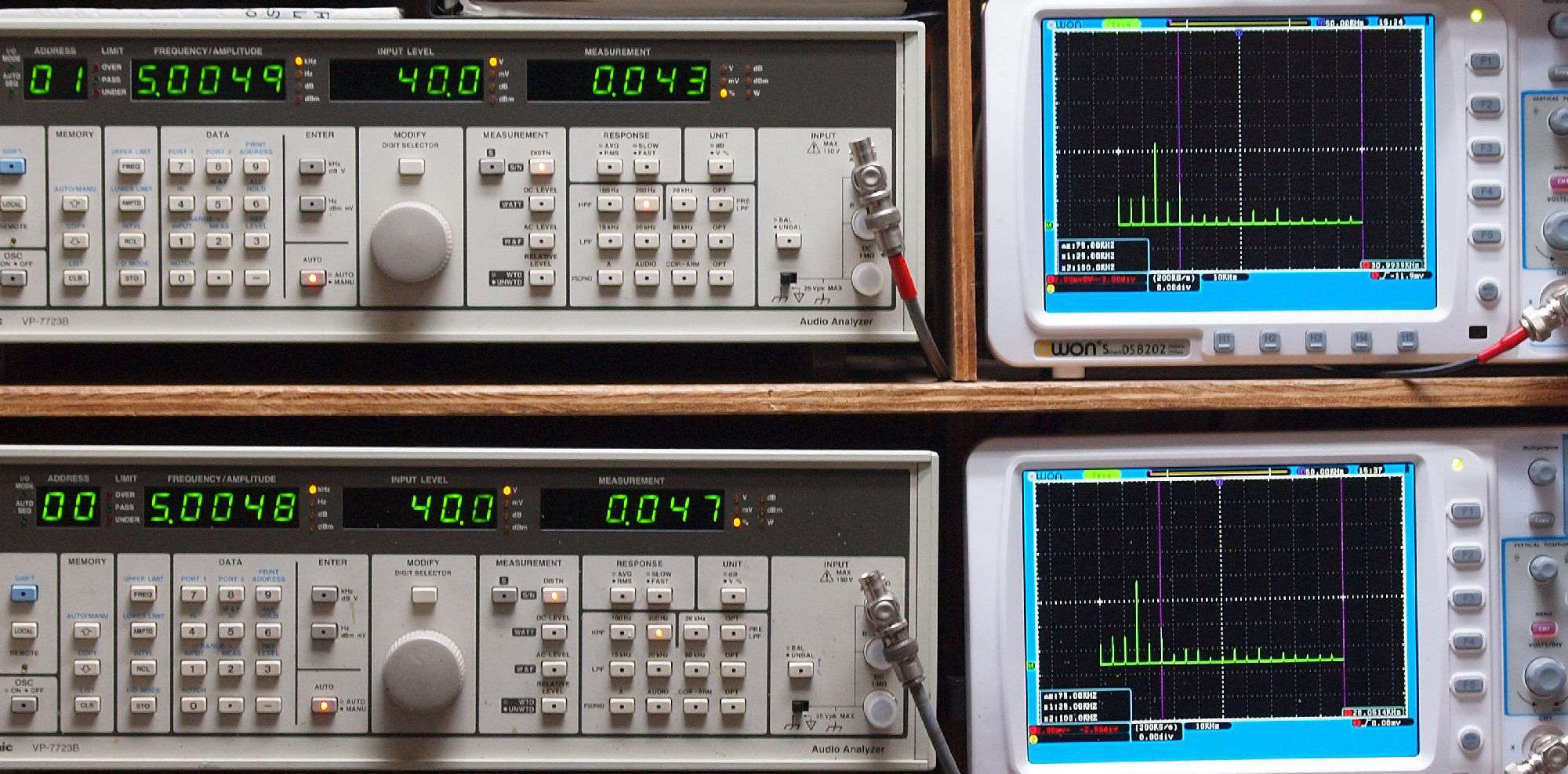 | E. 測定・調整 E1. 出力・歪み率測定・調整 「見方」。 上段中 右側SP出力を「Audio Analyzer Panasonic VP−7723B」により測定。 表示LED、 左端=メモリーNo、 中左=周波数測定、 中右=出力電圧測定、 右端=歪み率測定。 上段右端 VP−7723Bの基本波除去出力を「owon SDS8202(200MHZ)」で「FFT分析」表示。 下段中 左側SP出力を「Audio Analyzer Panasonic VP−7723B」により測定。 表示LED、 左端=メモリーNo、 中左=周波数測定、 中右=出力電圧測定、 右端=歪み率測定。 下段右端 VP−7723Bの基本波除去出力を「owon SDS6062(200MHZ)」で「FFT分析」表示。 下段左端 オーディオ発振器 VP−7201A より50Hz〜100kHzの信号を出し(歪み率=約0.003%)、ATT+分配器を通し、AMPに入力。 よって、ダイアル設定出力レベルより低くなります。測定機器の仕様や整備の様子はこちら、「VP−7723B」「VP−7201A」。 FFT画面の見方はこちら。 右は、AC100V入力電圧可変(スライダック)、アイドル電流設定に使用する。 |